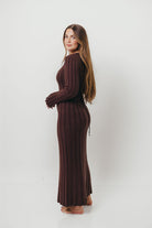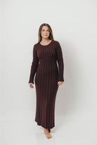 GARMENT DETAILS: Designer quality thick ribbed knit maxi dress, with high rounded neckline and long sleeves. Features a full skirt and comfortable, fitted silhouette. Features an adjustable tie-back detail.