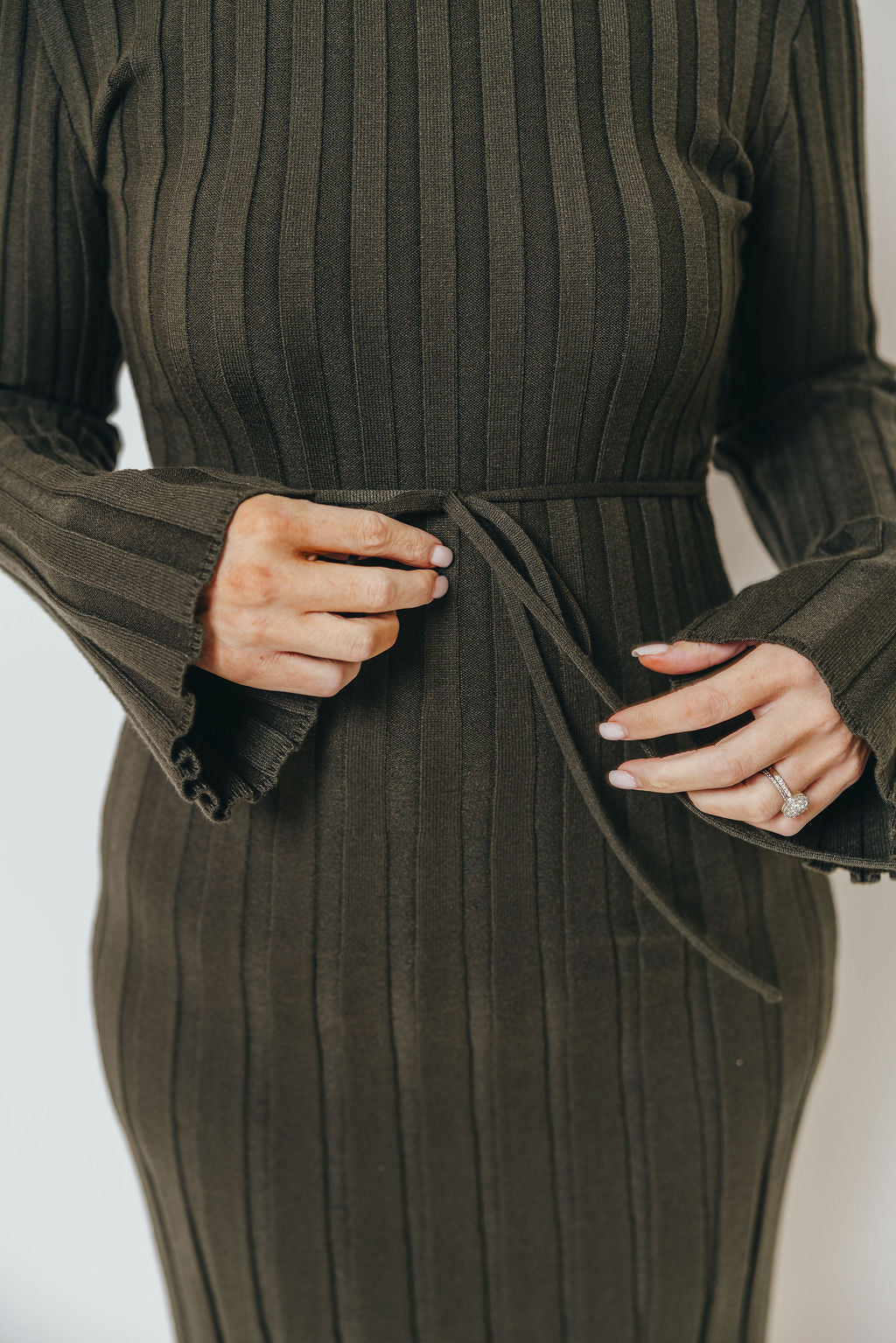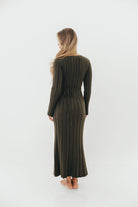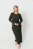 GARMENT DETAILS: Designer quality thick ribbed knit maxi dress, with high rounded neckline and long sleeves. Features a full skirt and comfortable, fitted silhouette. Features an adjustable tie-back detail.