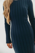 GARMENT DETAILS: Designer quality thick ribbed knit maxi dress, with high rounded neckline and long sleeves. Features a full skirt and comfortable, fitted silhouette. Features an adjustable tie-back detail.