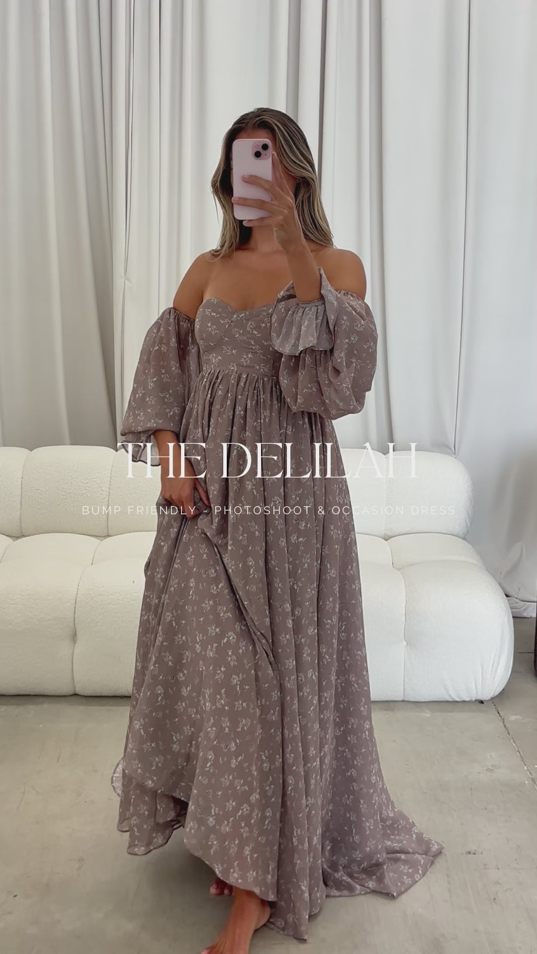 This gown deserves the word breathtaking. Meet the Delilah Maxi, an absolutely stunning statement dress that is both whimsical and romantic. This premium gown is crafted from eight yards of lightweight floral material, with a bustier-style bodice, swoon-worthy skirt and train, and sheer sleeves that can be worn on or off the shoulder depending on your mood! The Delilah Dress is a centerpiece of a dress and perfect for every body type, including expecting mamas. (P.S. it makes an incredible client closet dress for photographers!)
