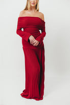 GARMENT DETAILS: Elegant maxi dress with a folded off-the-shoulder neckline, long sleeves, and full pleated maxi skirt. Finished with a dropped waist and full lining.