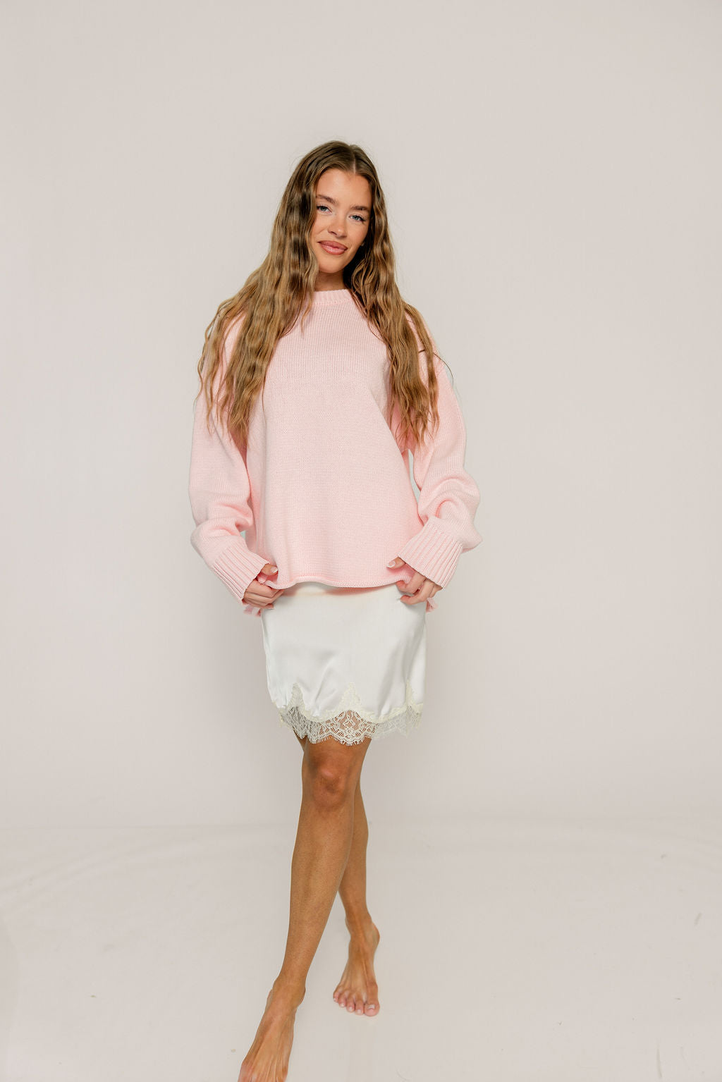 GARMENT DETAILS: Silky satin knee-length skirt with an elasticated waistband and lace trim.