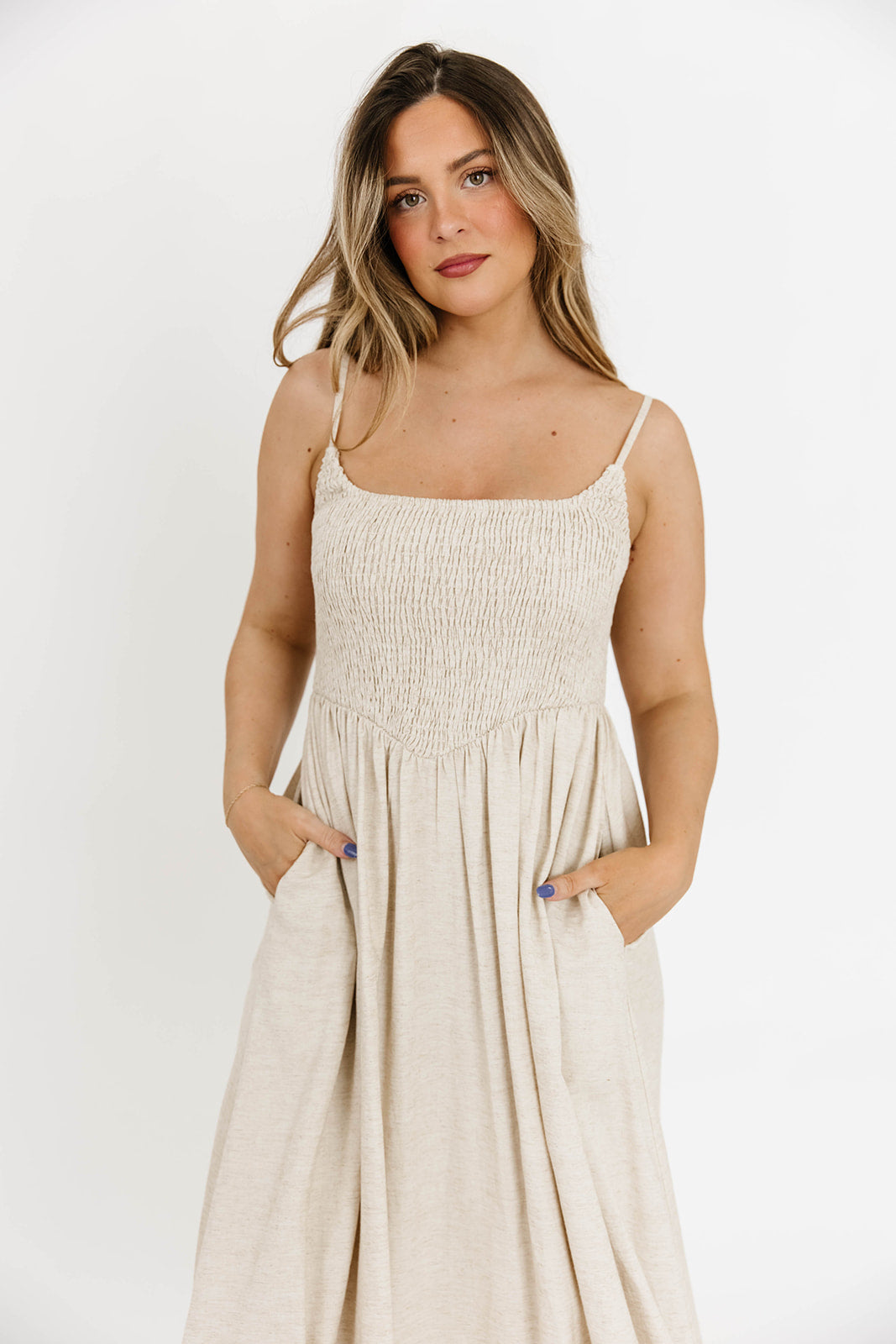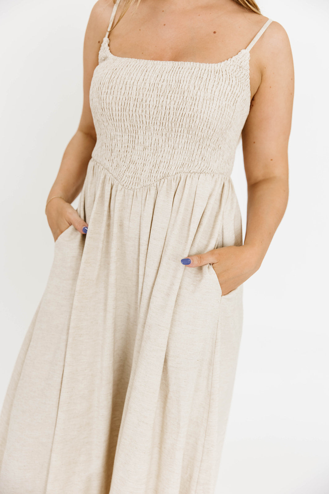 GARMENT DETAILS: Lightweight long midi dress with square neckline, adjustable spaghetti straps, and fully smocked bodice. Features a full skirt and in-seam pockets. Partially lined.