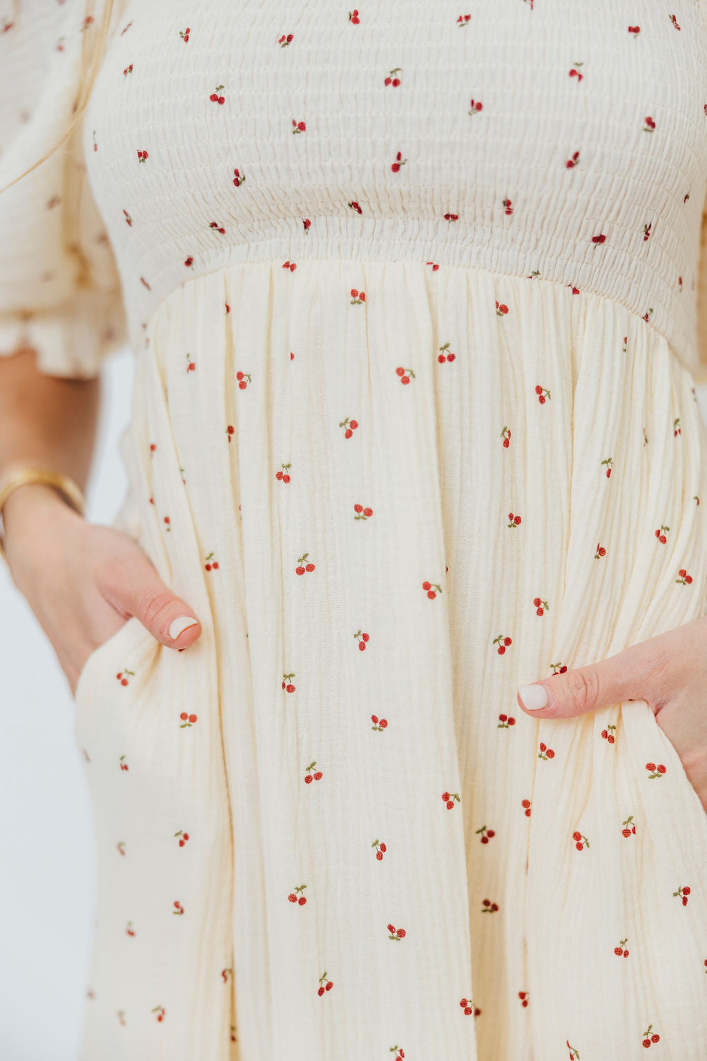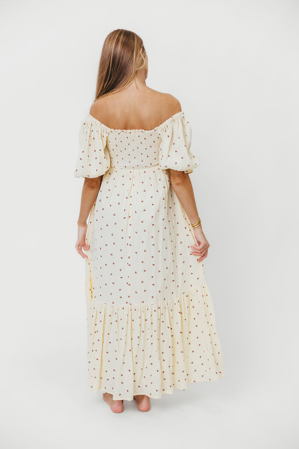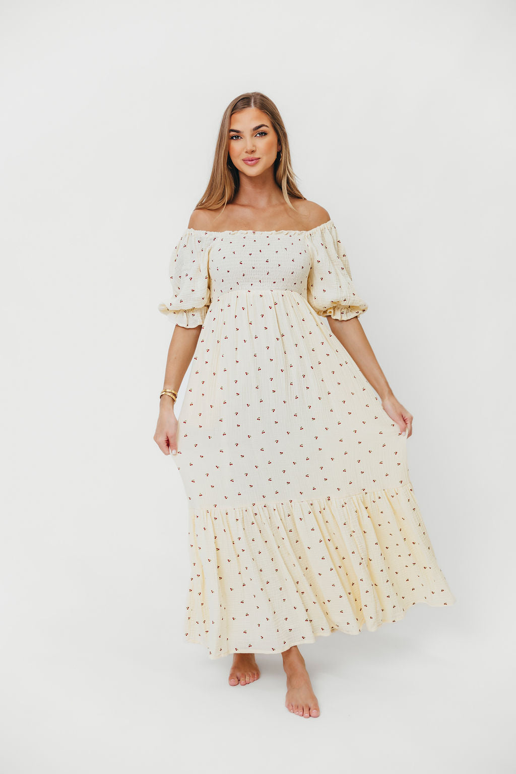 GARMENT DETAILS: Lightweight maxi dress with square neckline, short puff sleeves, and fully smocked, stretchy bodice. Features an elegant print and side pockets. Elasticated neckline can be worn on or off the shoulders.