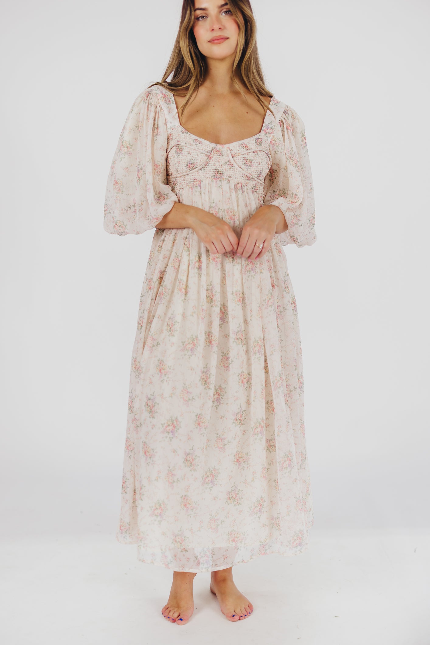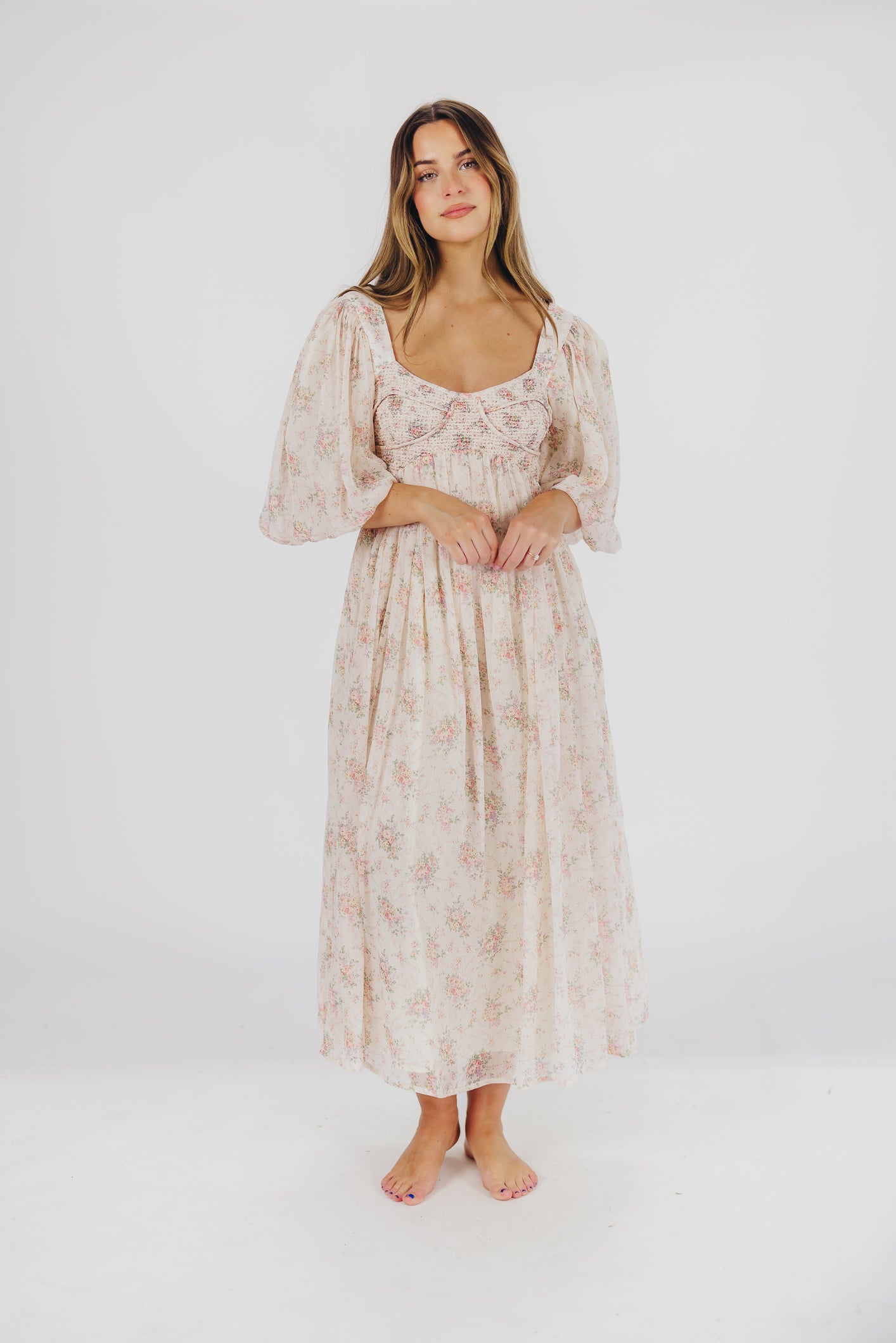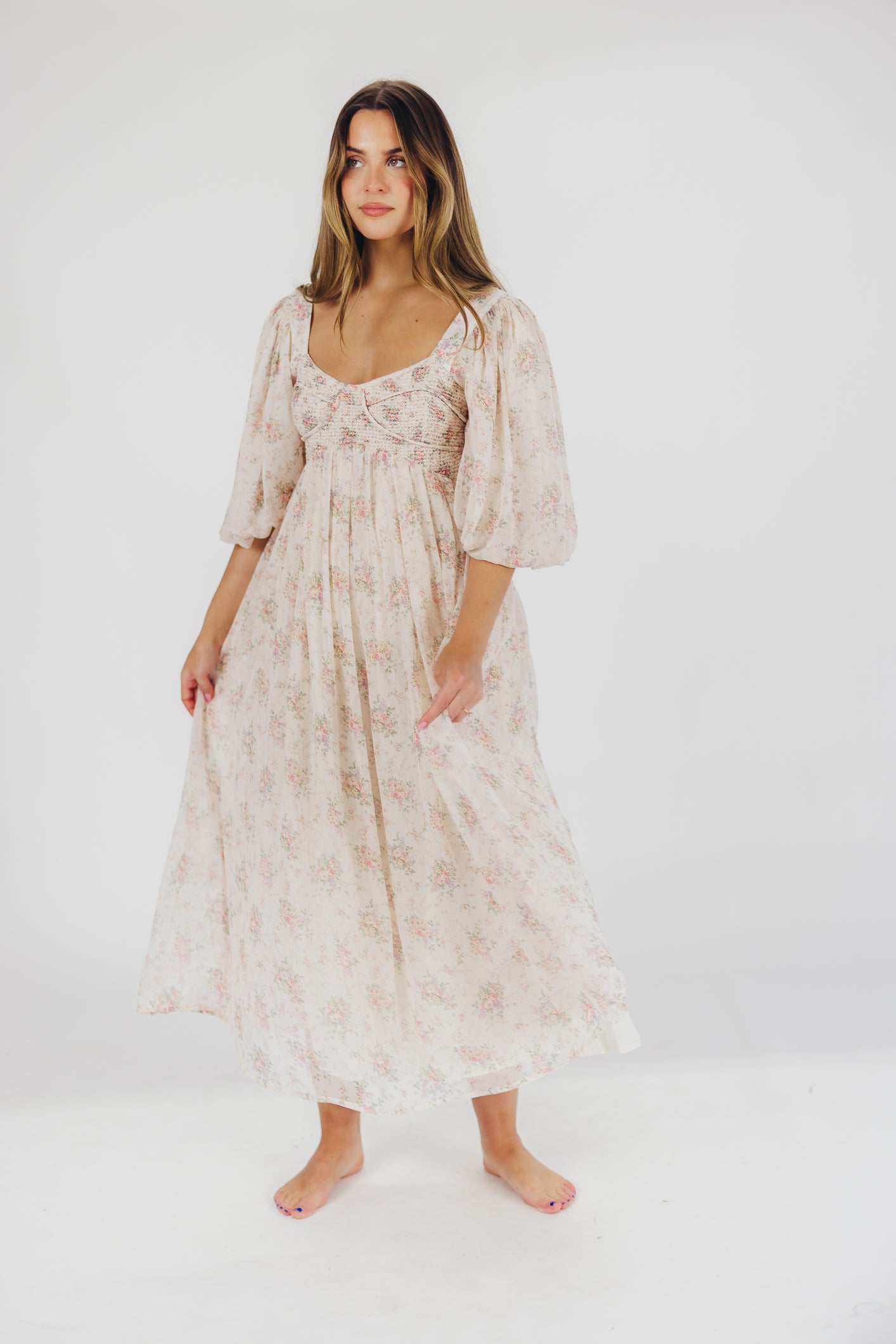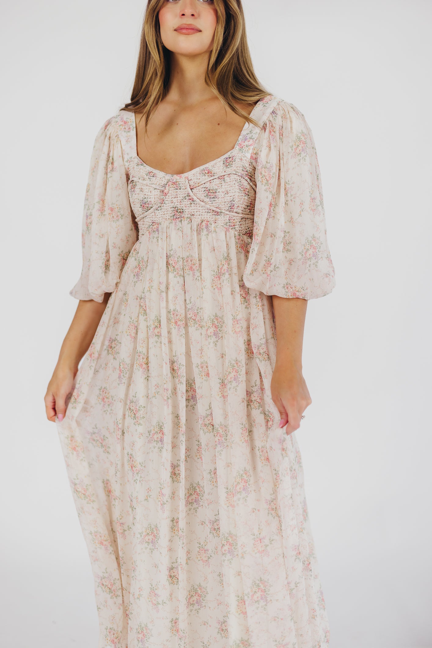 GARMENT DETAILS: Lightweight maxi in a floral print. Features an empire waist silhouette and structured bustier-style bodice, with smocking in the back. Finished with statement puffed sleeves, voluminous skirt, and back zipper. Lined.