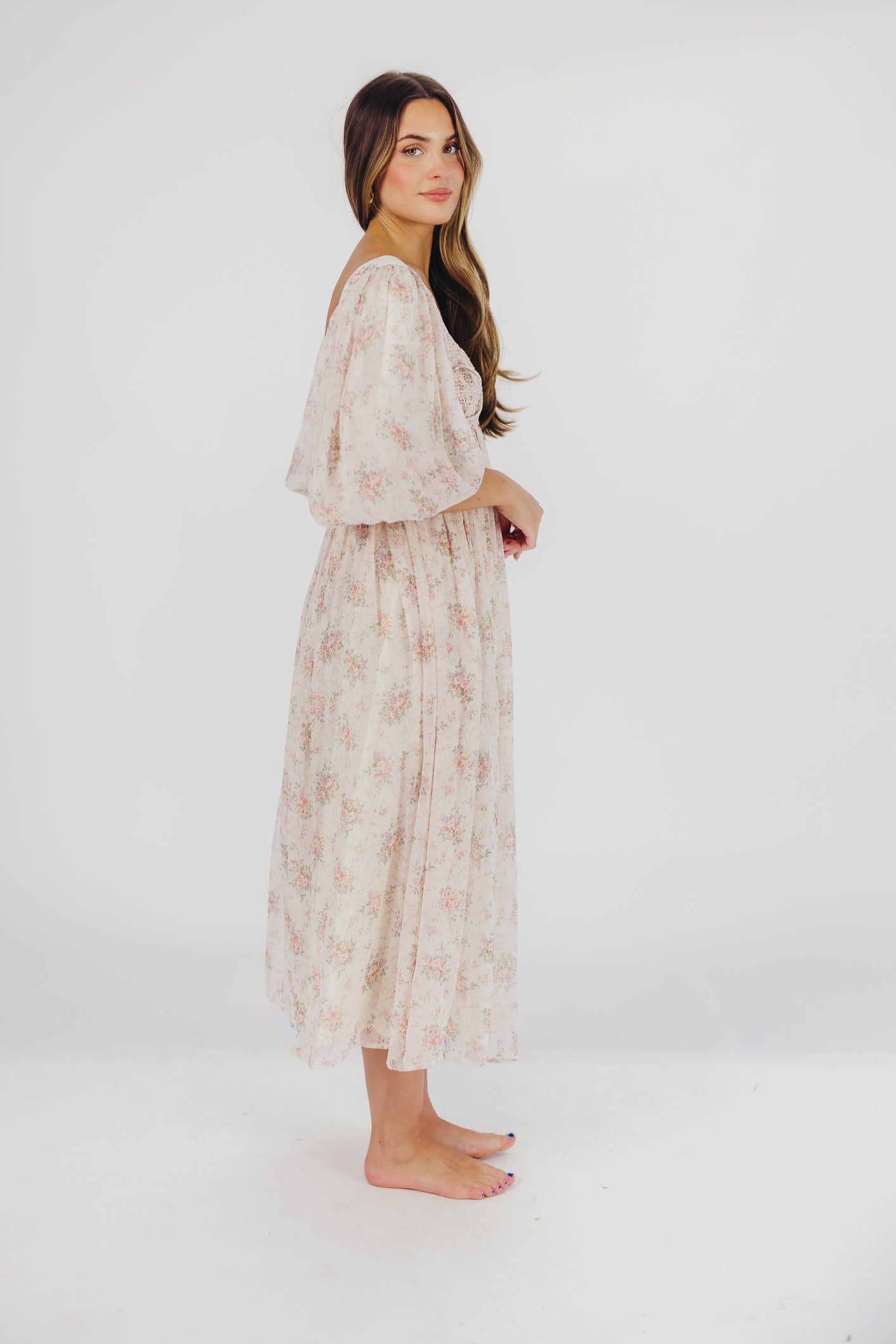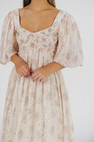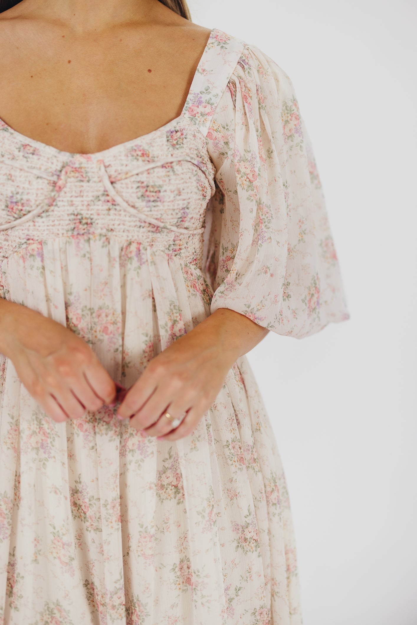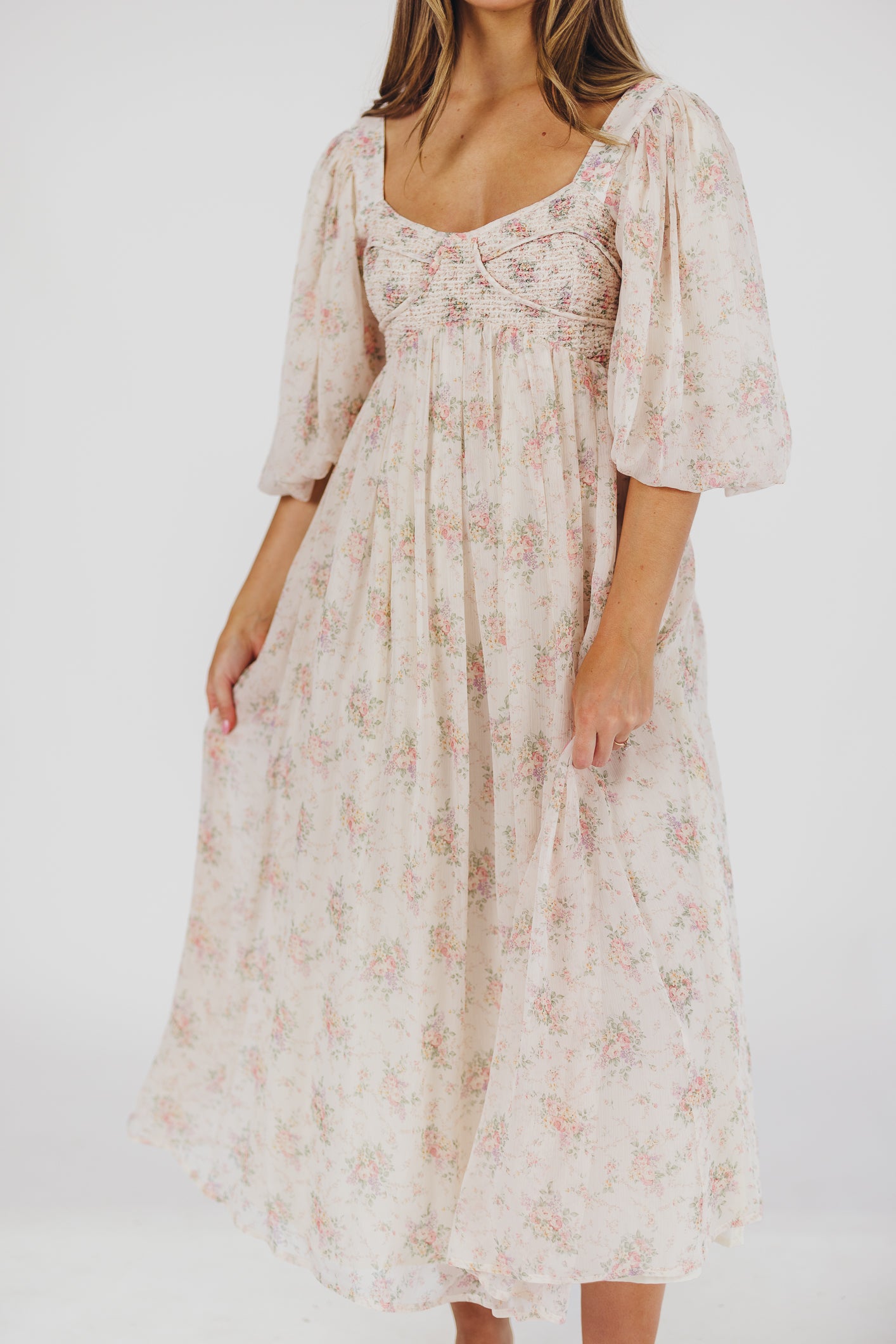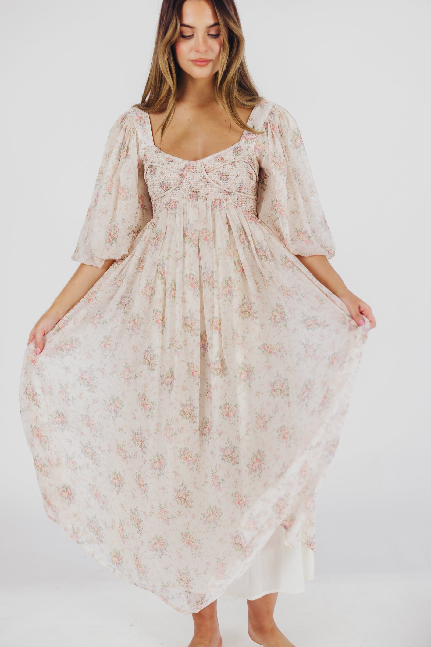 GARMENT DETAILS: Lightweight maxi in a floral print. Features an empire waist silhouette and structured bustier-style bodice, with smocking in the back. Finished with statement puffed sleeves, voluminous skirt, and back zipper. Lined.