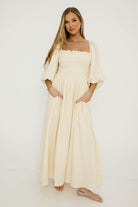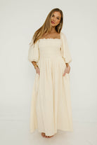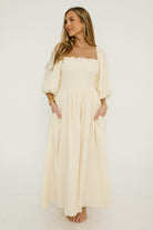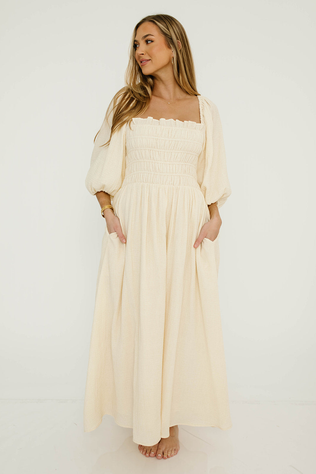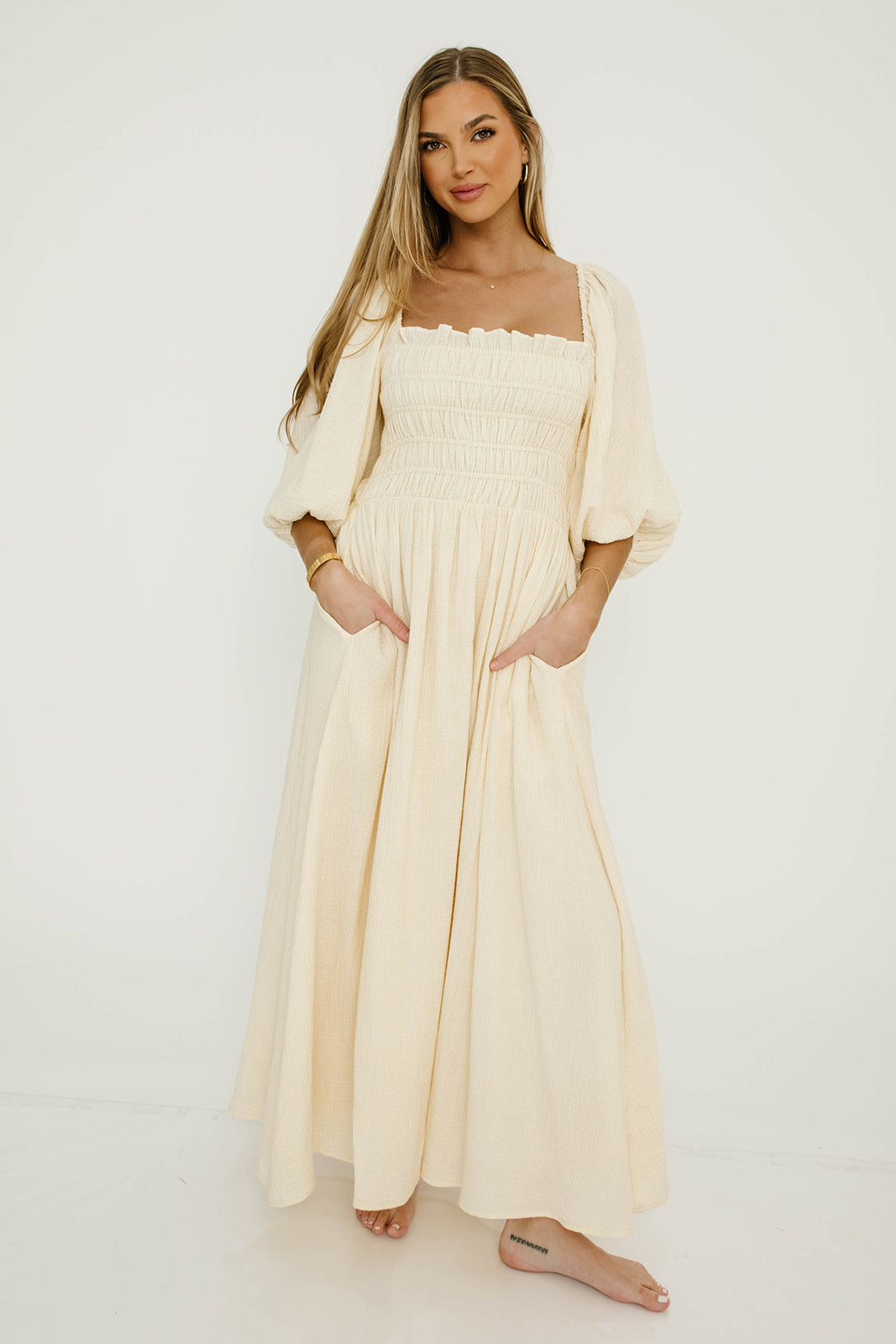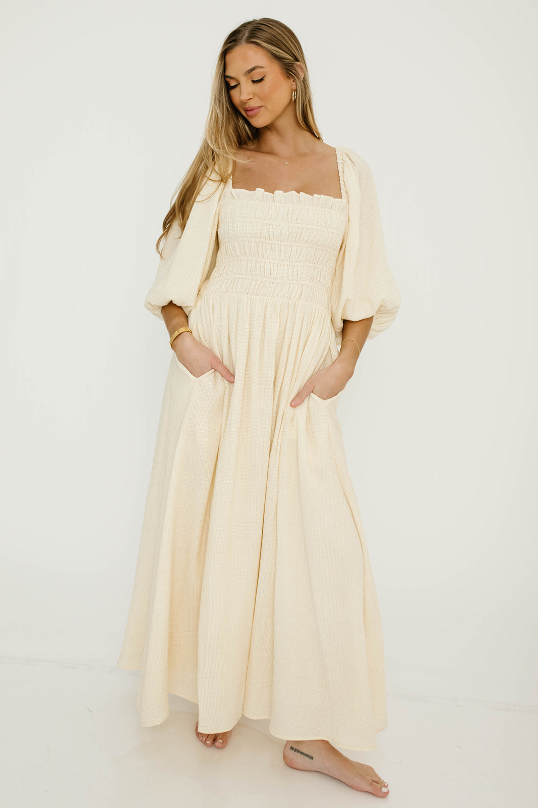 GARMENT DETAILS: Elegant cotton maxi dress in a charming neutral pattern, with square neckline, statement puffed sleeves, and a fully smocked bodice. Features ruffled details and dual side pockets.