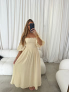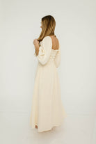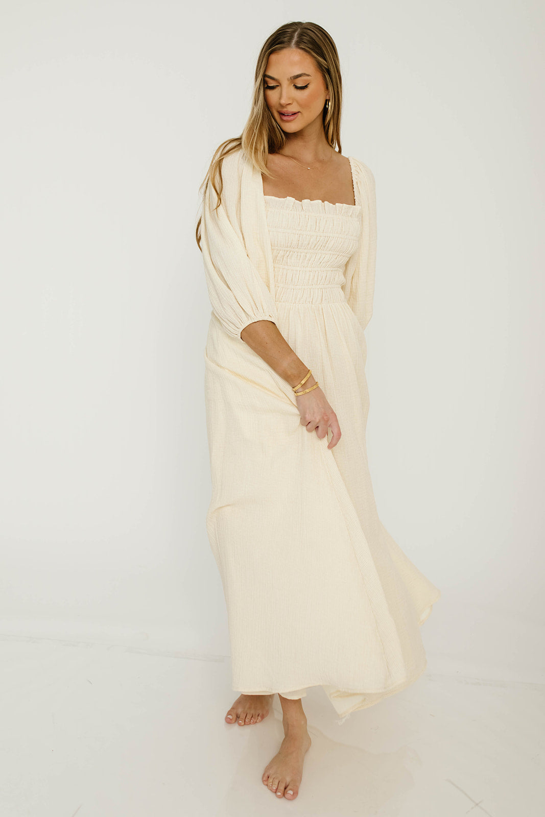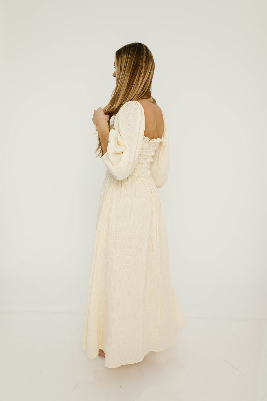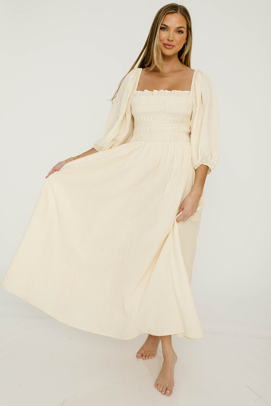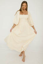 GARMENT DETAILS: Elegant cotton maxi dress in a charming neutral pattern, with square neckline, statement puffed sleeves, and a fully smocked bodice. Features ruffled details and dual side pockets.
