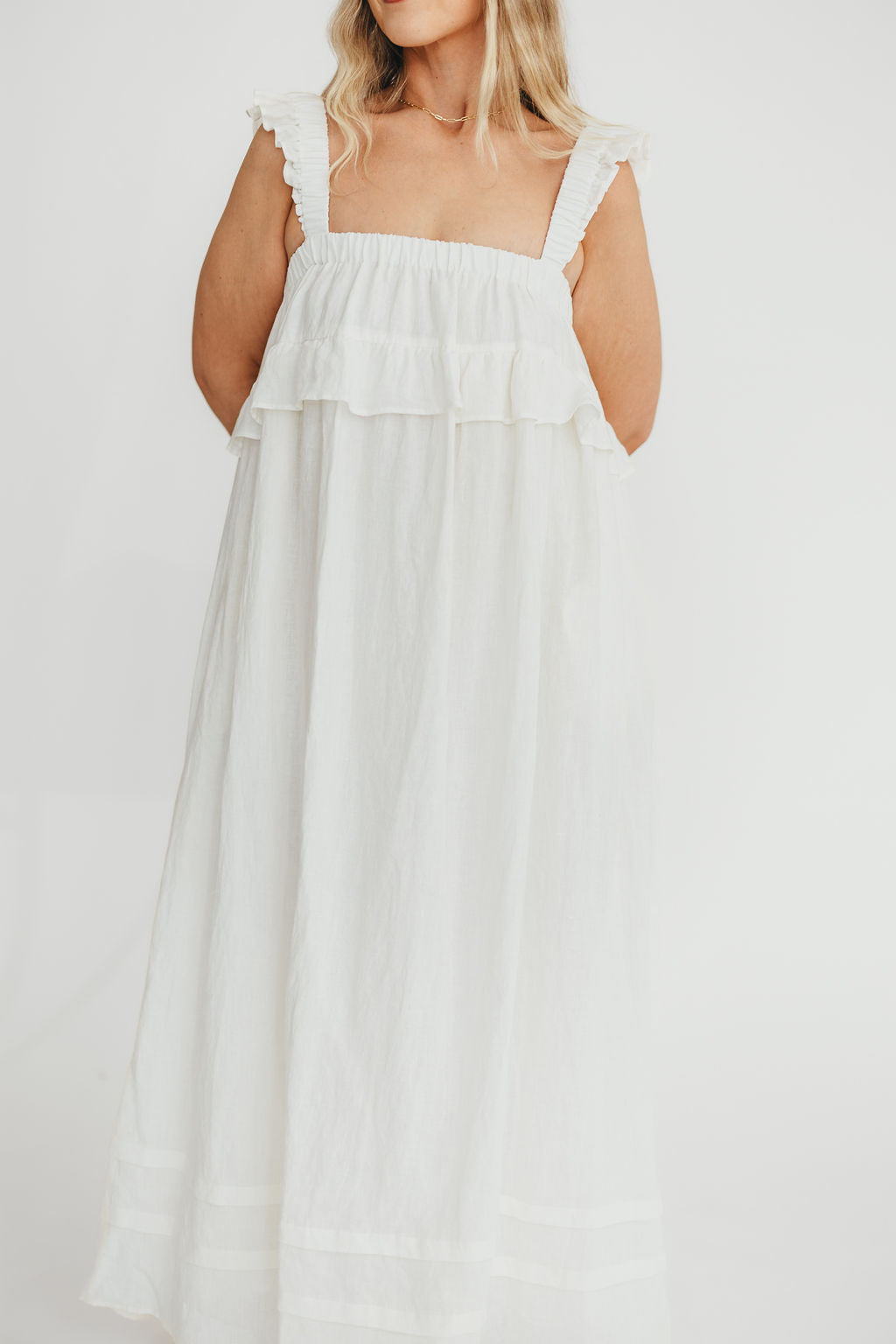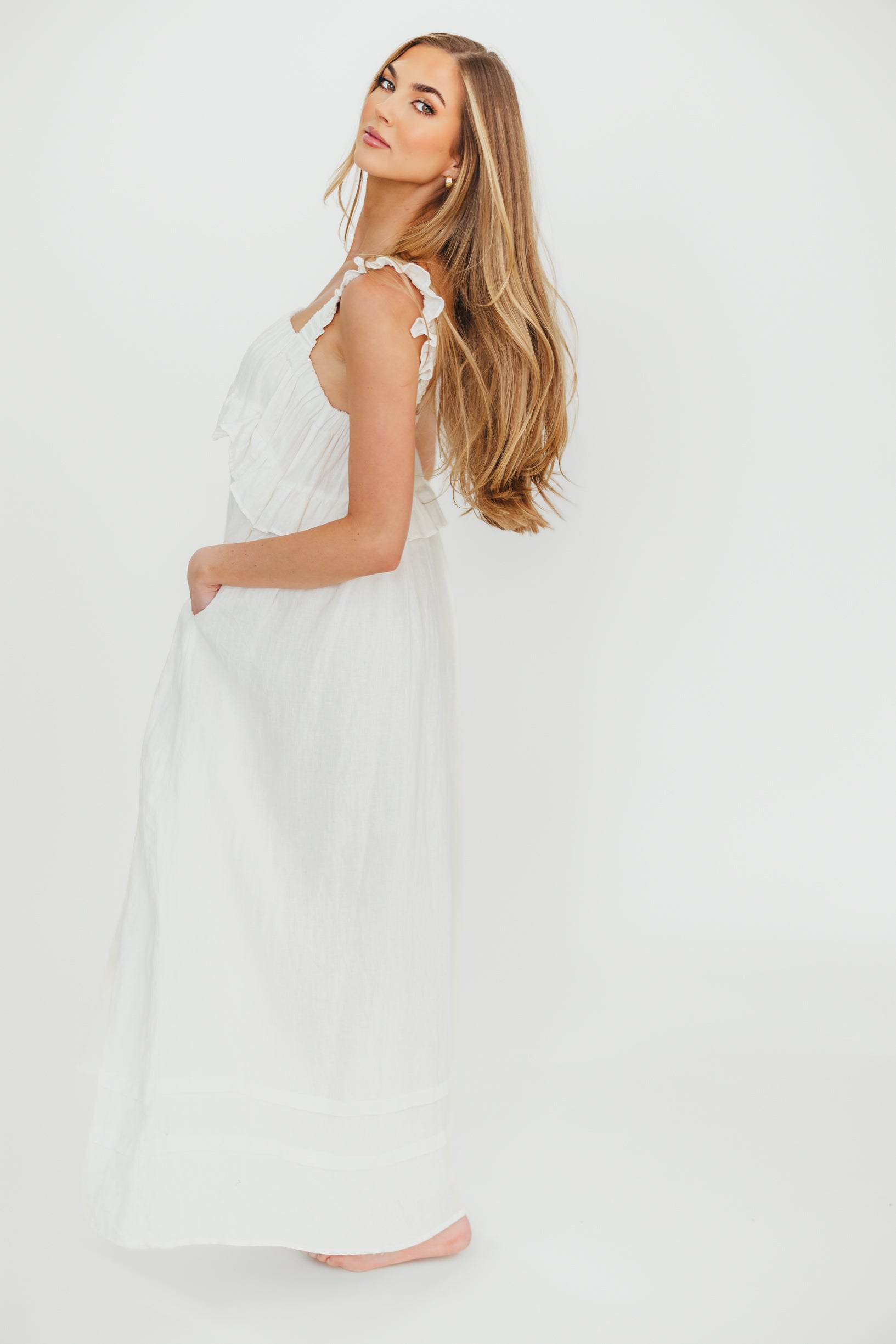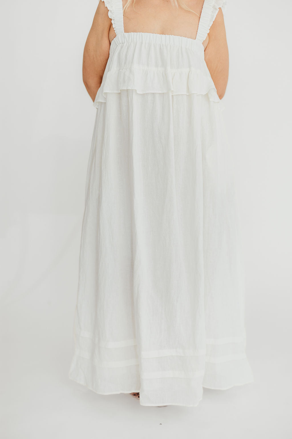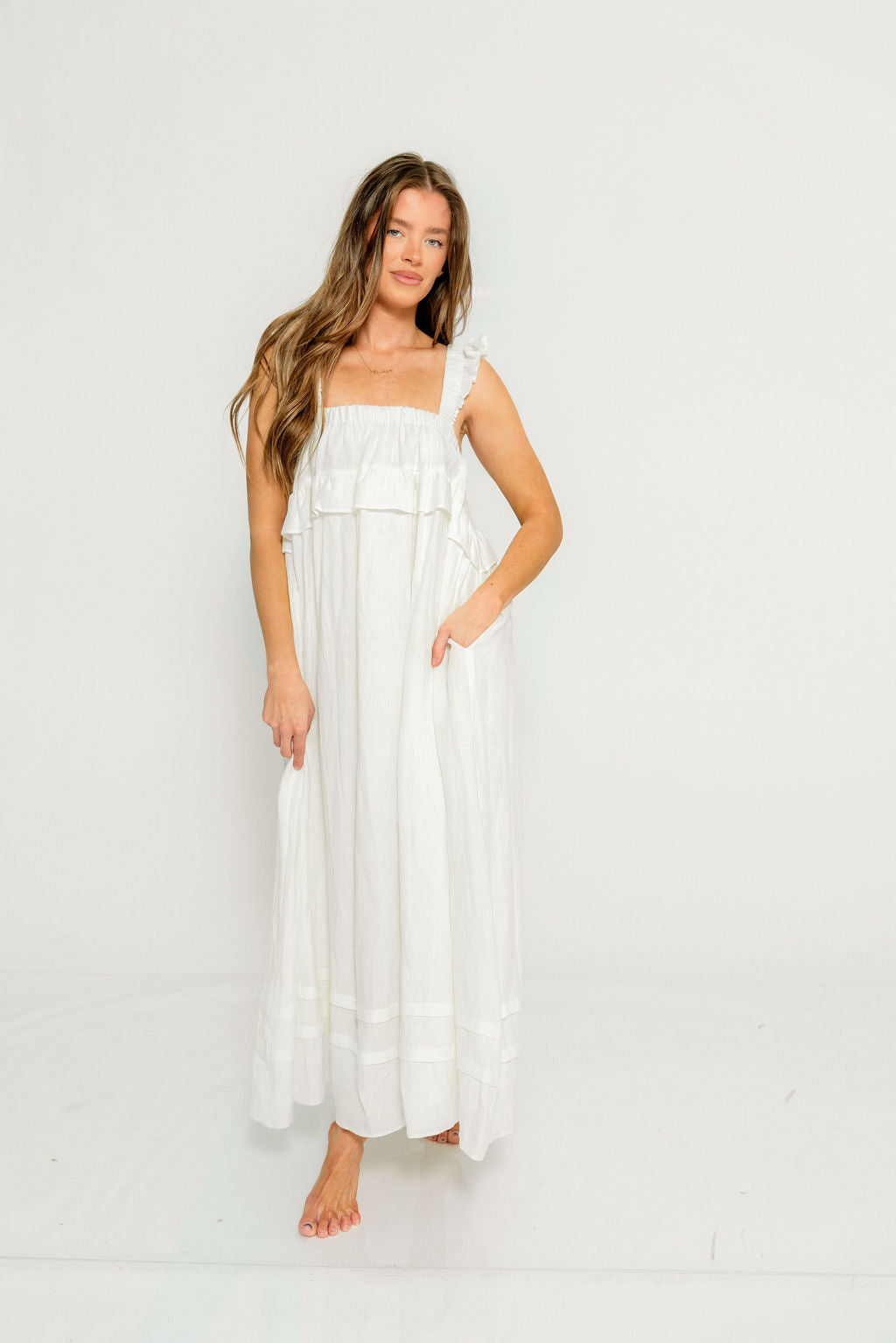 GARMENT DETAILS: Elegant, lightweight linen maxi dress with a square neckline, ruffled shoulder straps, and a gathered bodice with overlay accent. Features side pockets and a full, flowy silhouette.