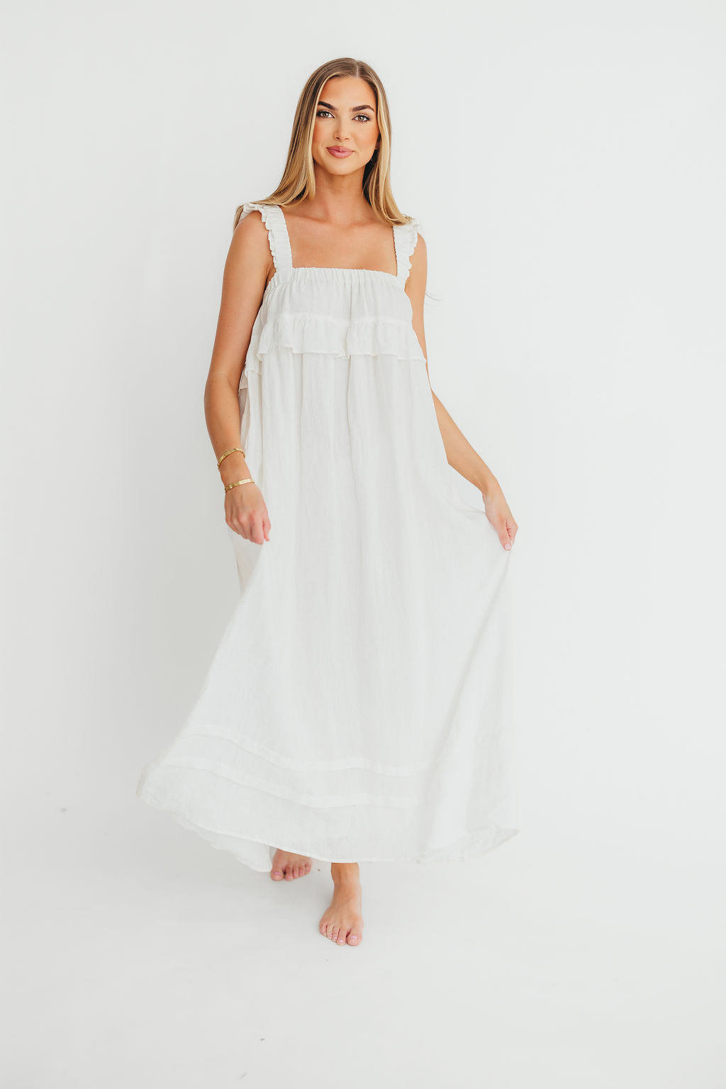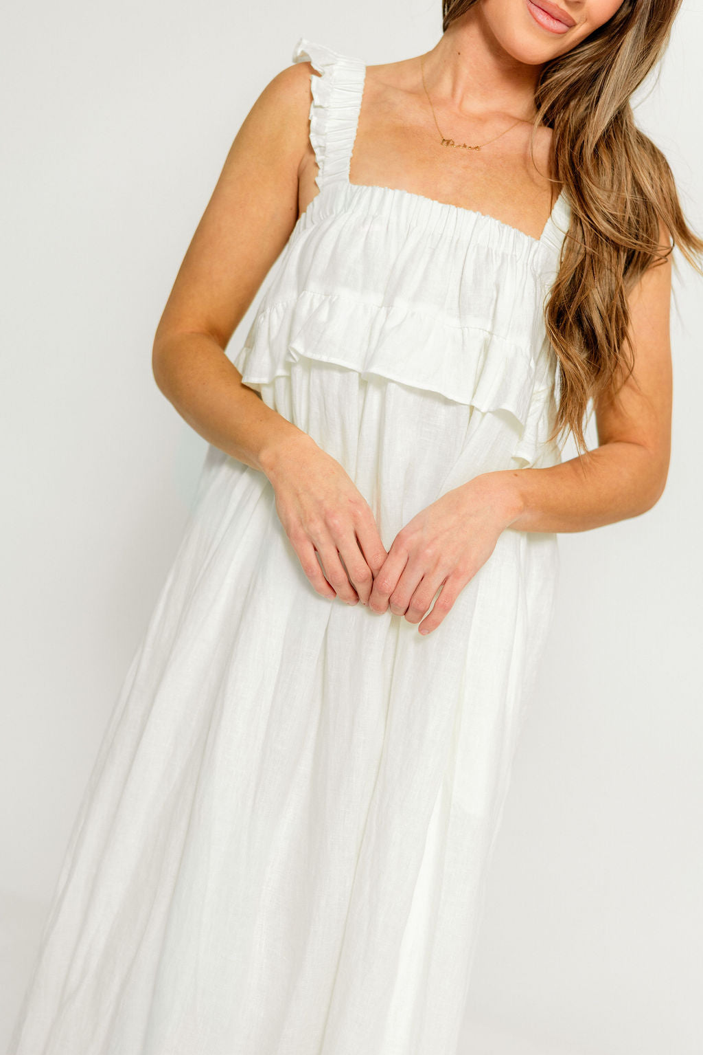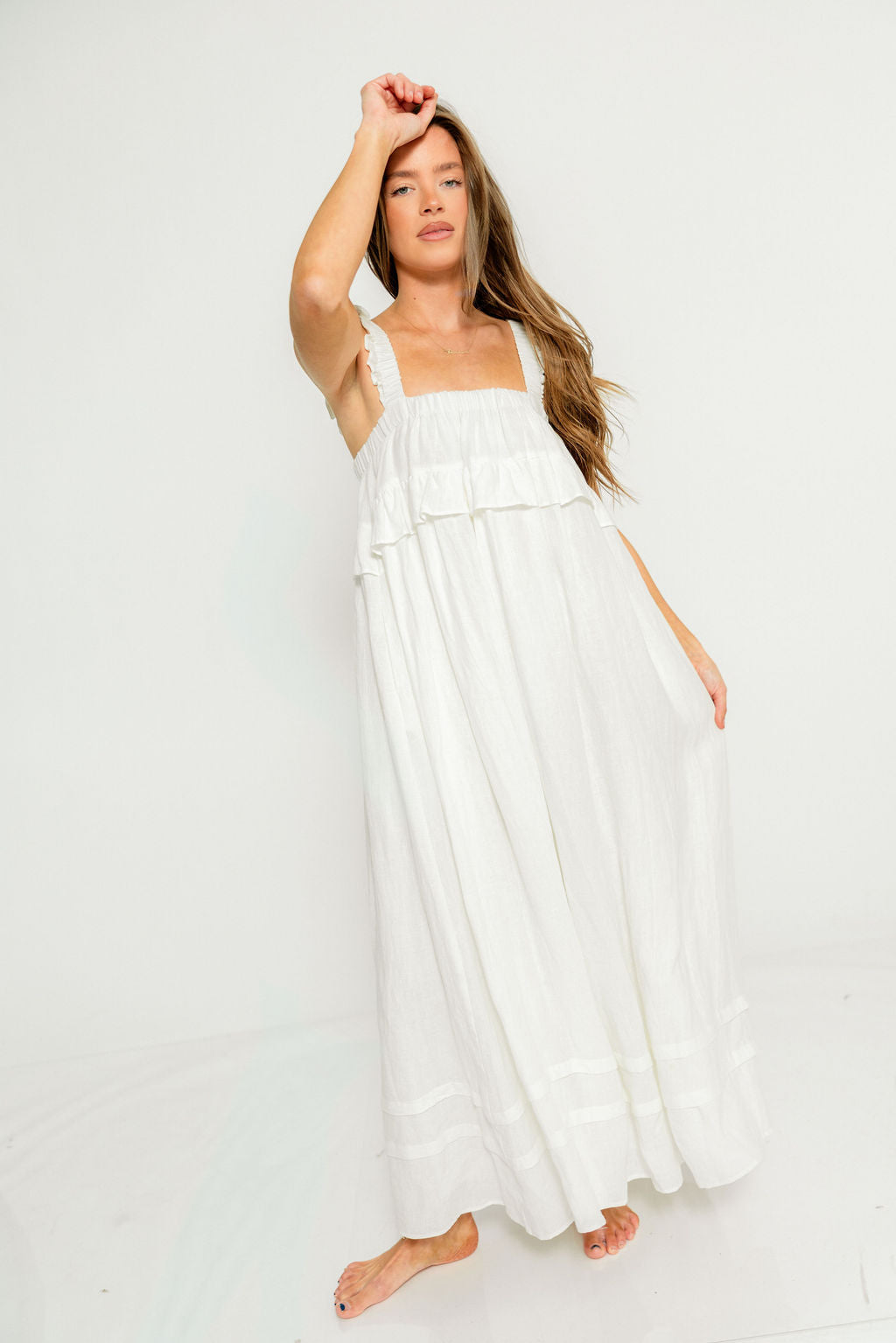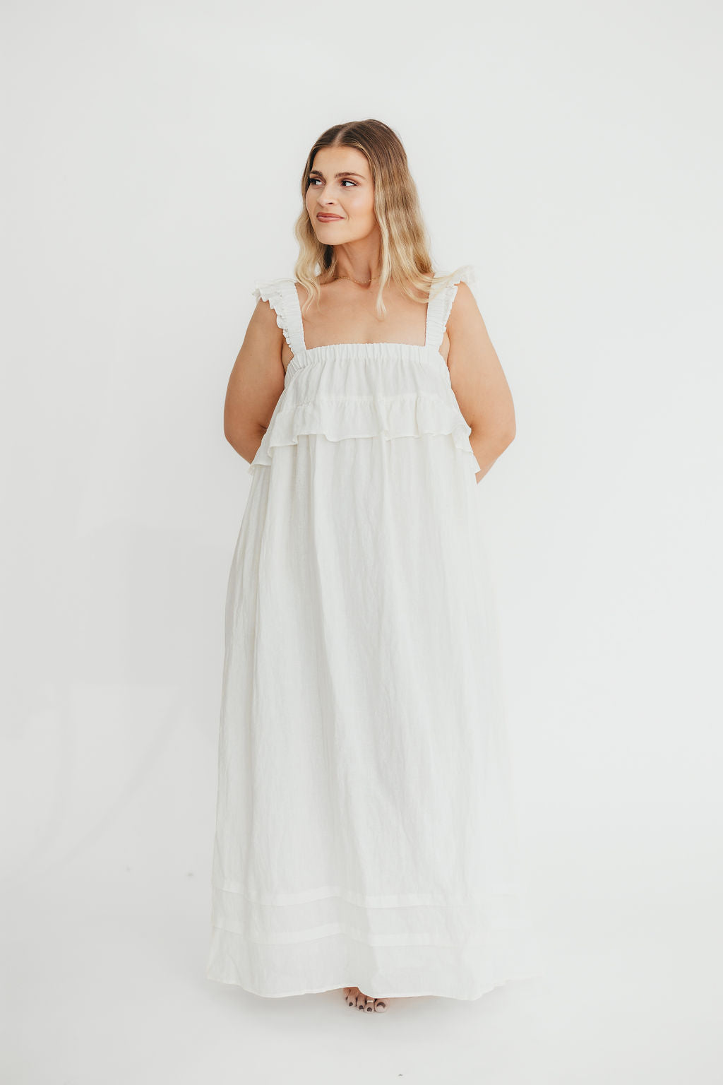 GARMENT DETAILS: Elegant, lightweight linen maxi dress with a square neckline, ruffled shoulder straps, and a gathered bodice with overlay accent. Features side pockets and a full, flowy silhouette.