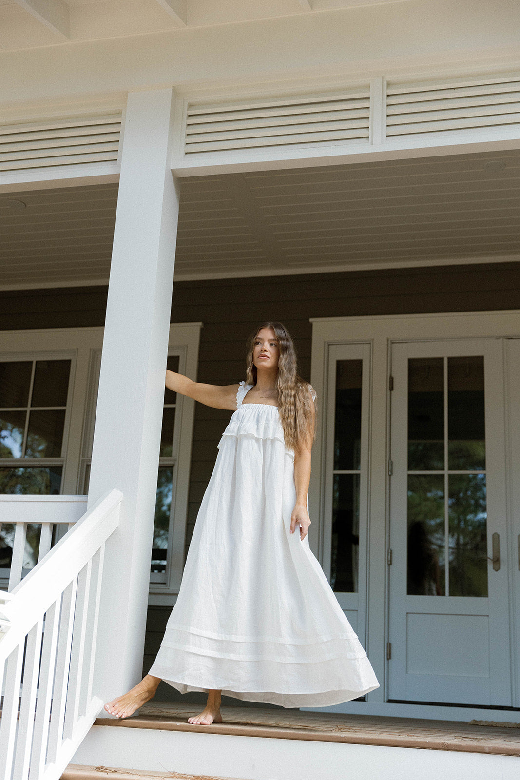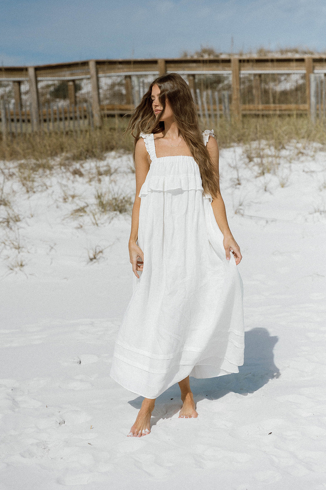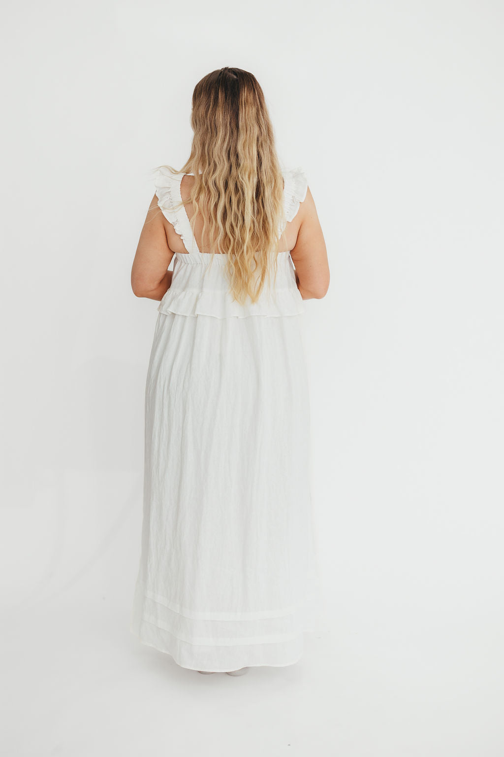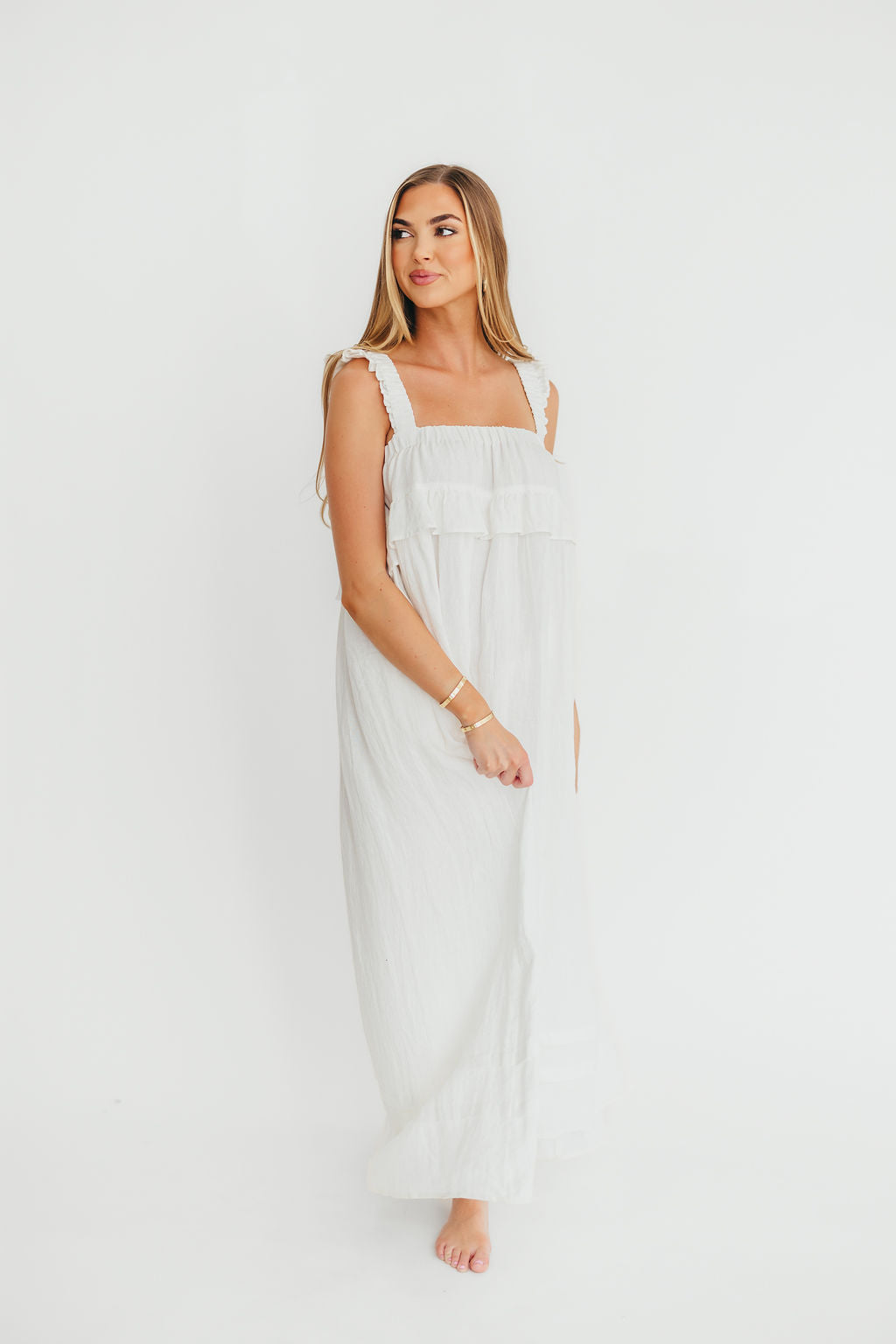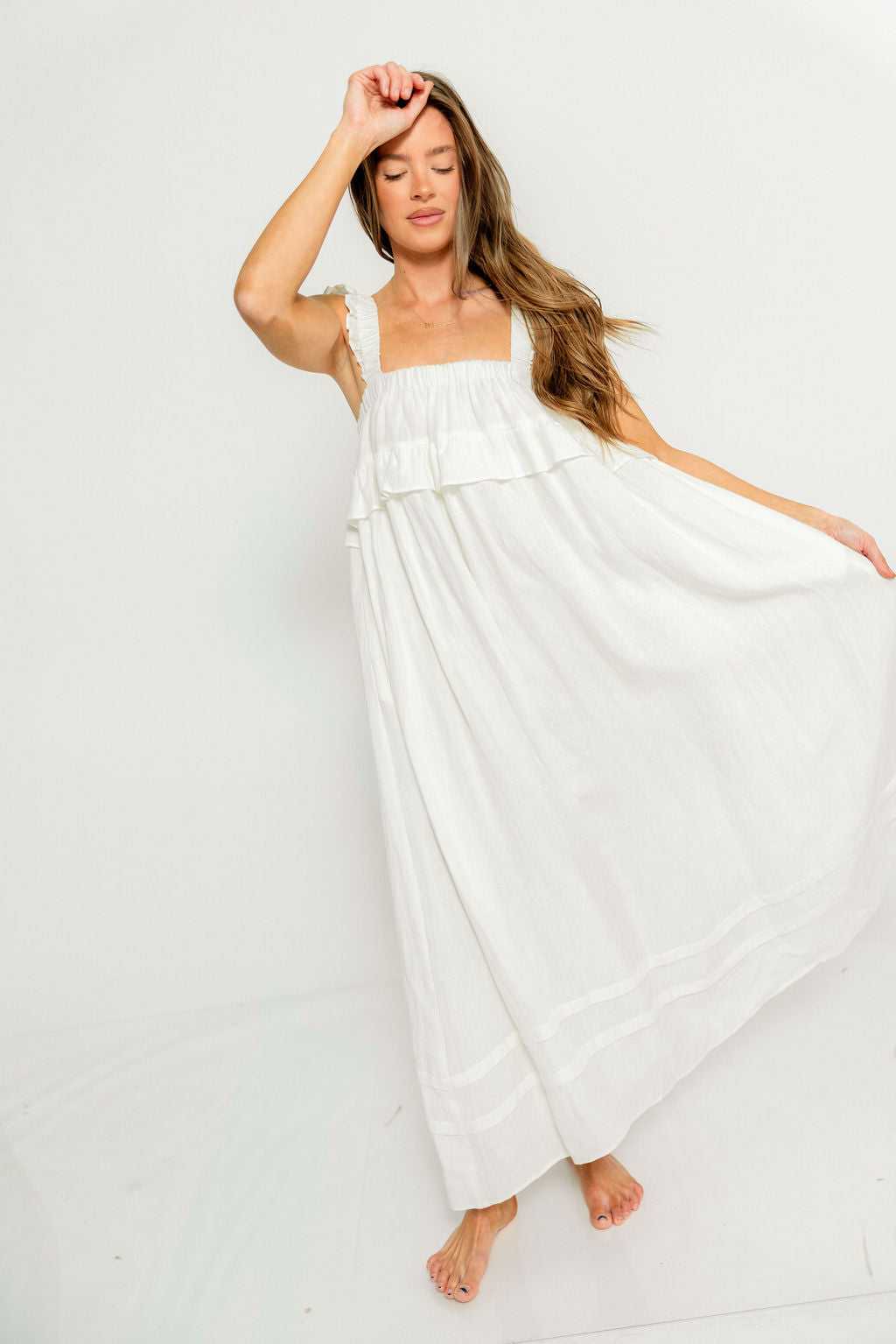 GARMENT DETAILS: Elegant, lightweight linen maxi dress with a square neckline, ruffled shoulder straps, and a gathered bodice with overlay accent. Features side pockets and a full, flowy silhouette.