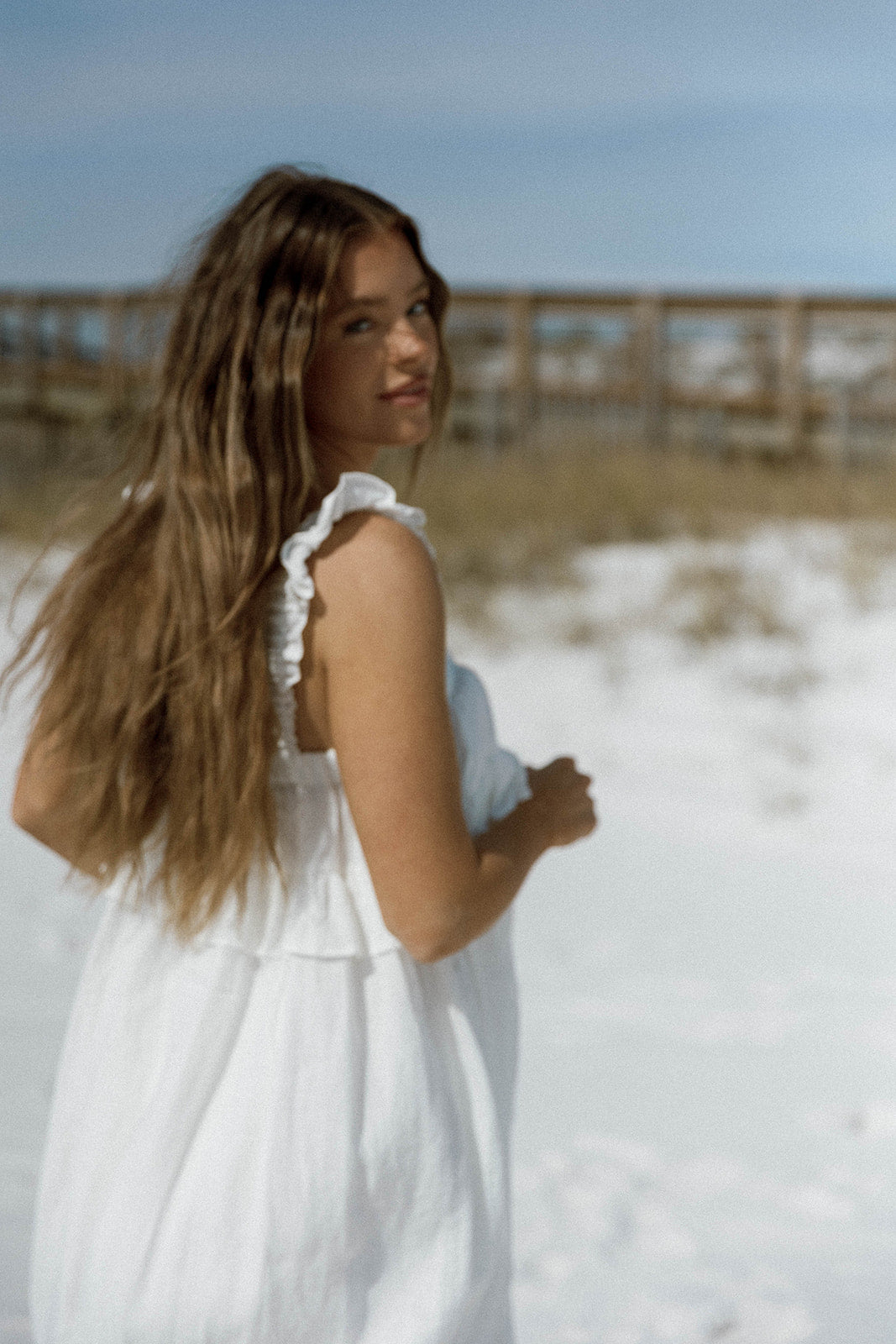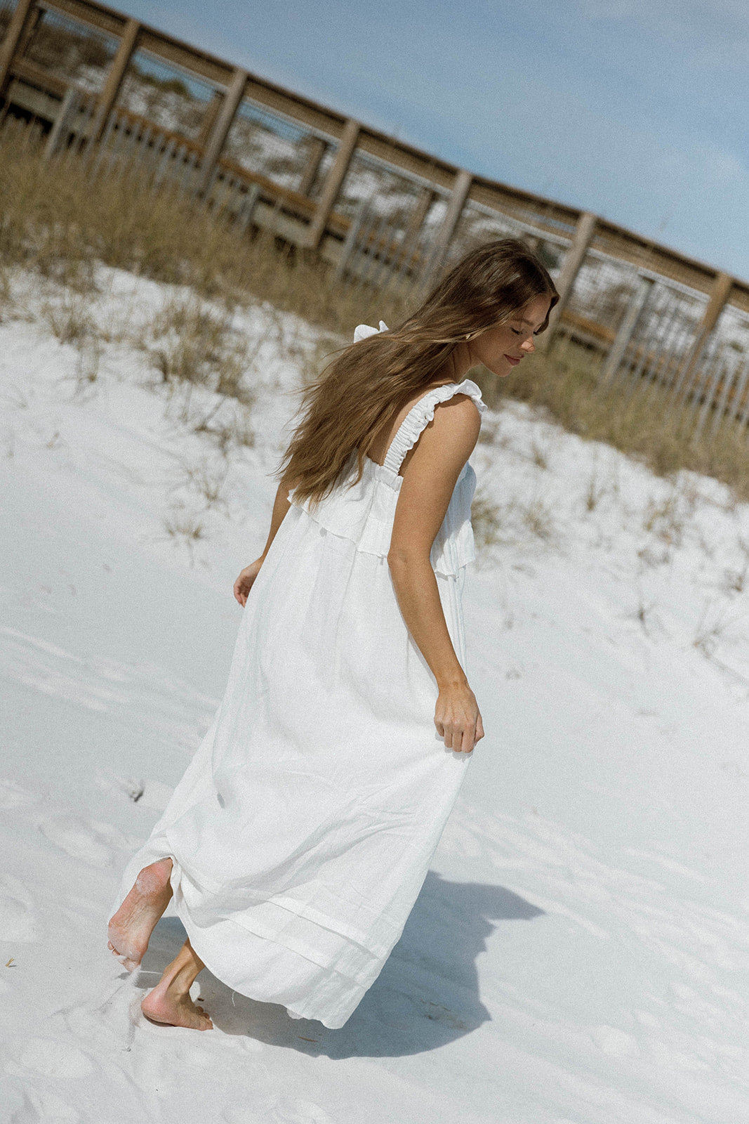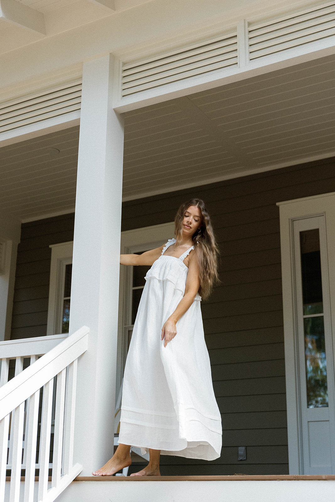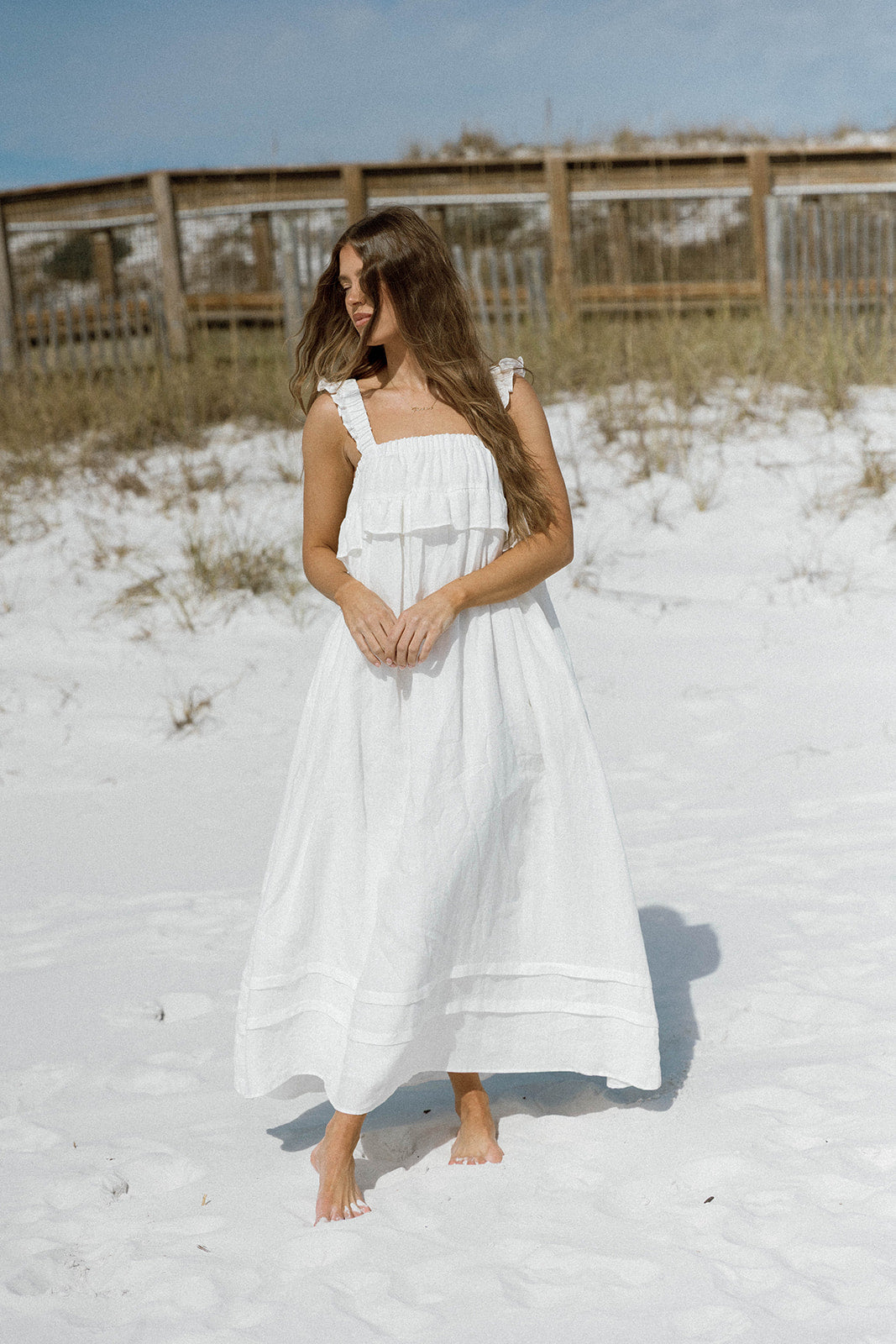 GARMENT DETAILS: Elegant, lightweight linen maxi dress with a square neckline, ruffled shoulder straps, and a gathered bodice with overlay accent. Features side pockets and a full, flowy silhouette.