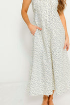 GARMENT DETAILS: Elegant cotton midi dress in a lighthearted floral print, with a square, elasticized neckline that can be worn on or off the shoulders, in-seam side pockets, and puffed cap sleeves. Neckline is adjustable with a drawstring.