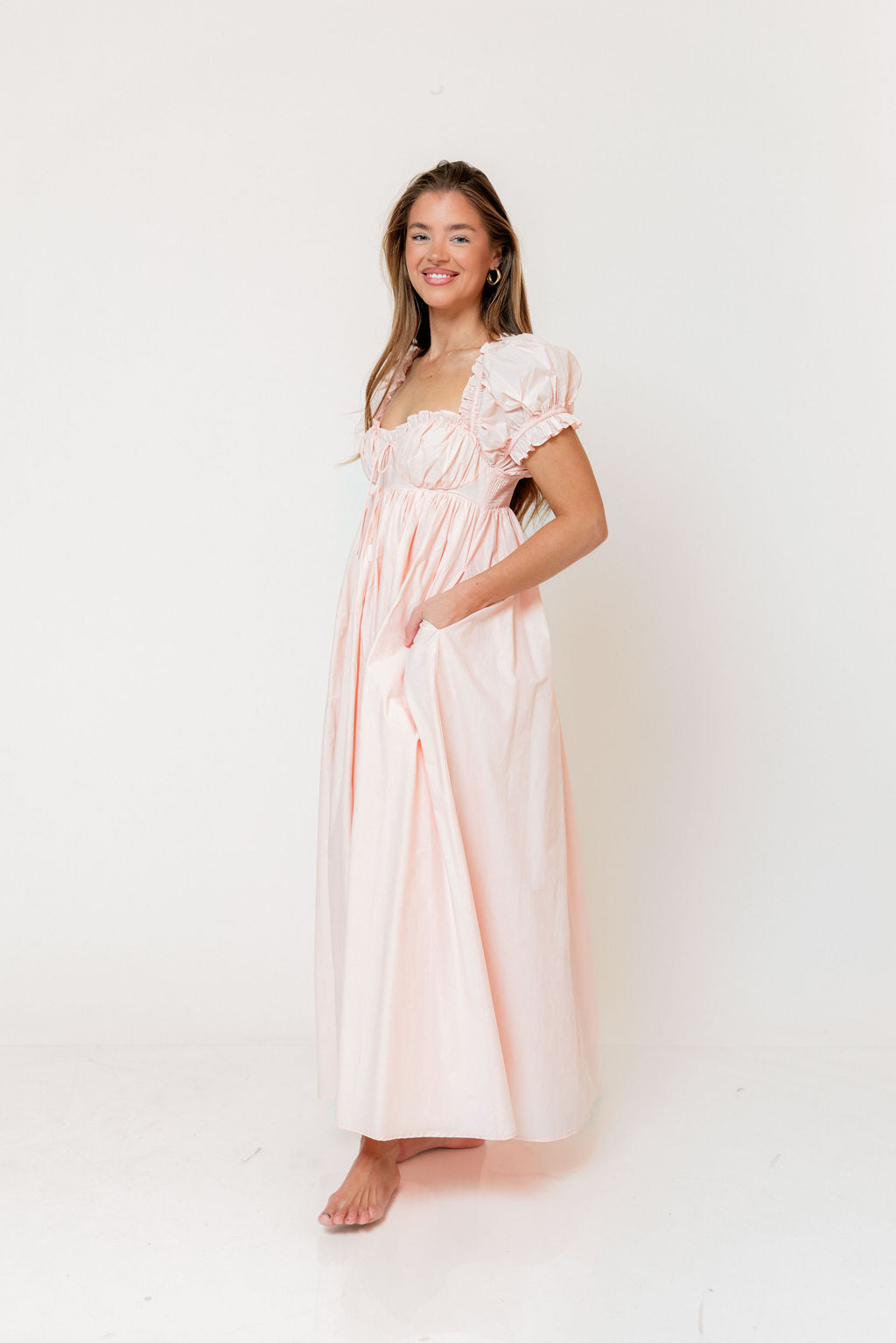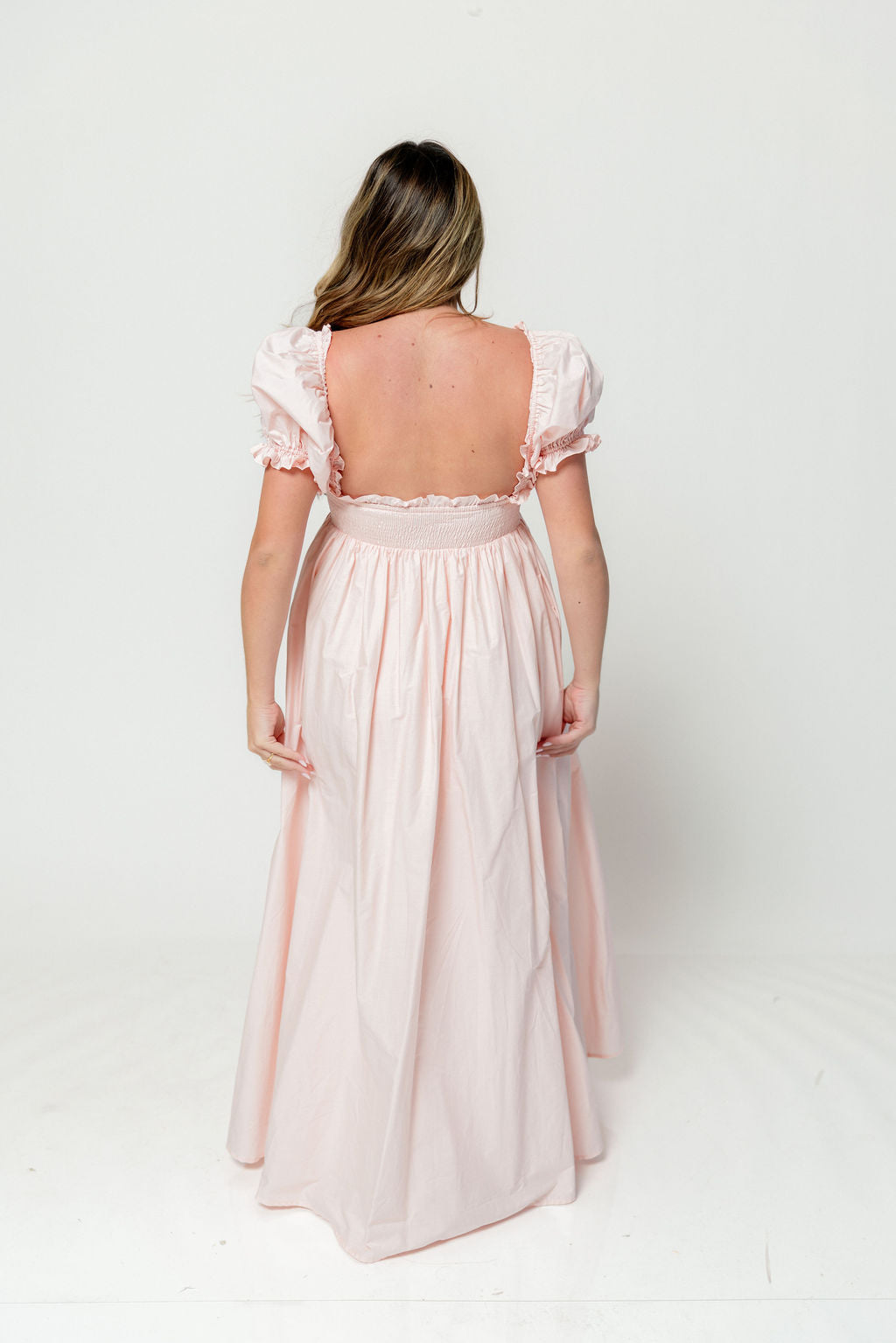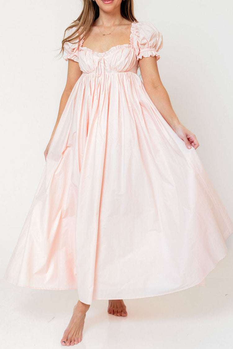 GARMENT DETAILS: Elegant, lightweight maxi dress with a flattering sweetheart neckline and front tie detail. Features short puffed sleeves, empire-waisted silhouette, and an open back with smocked panel. Finished with dual side pockets and delicate ruffle accents throughout.