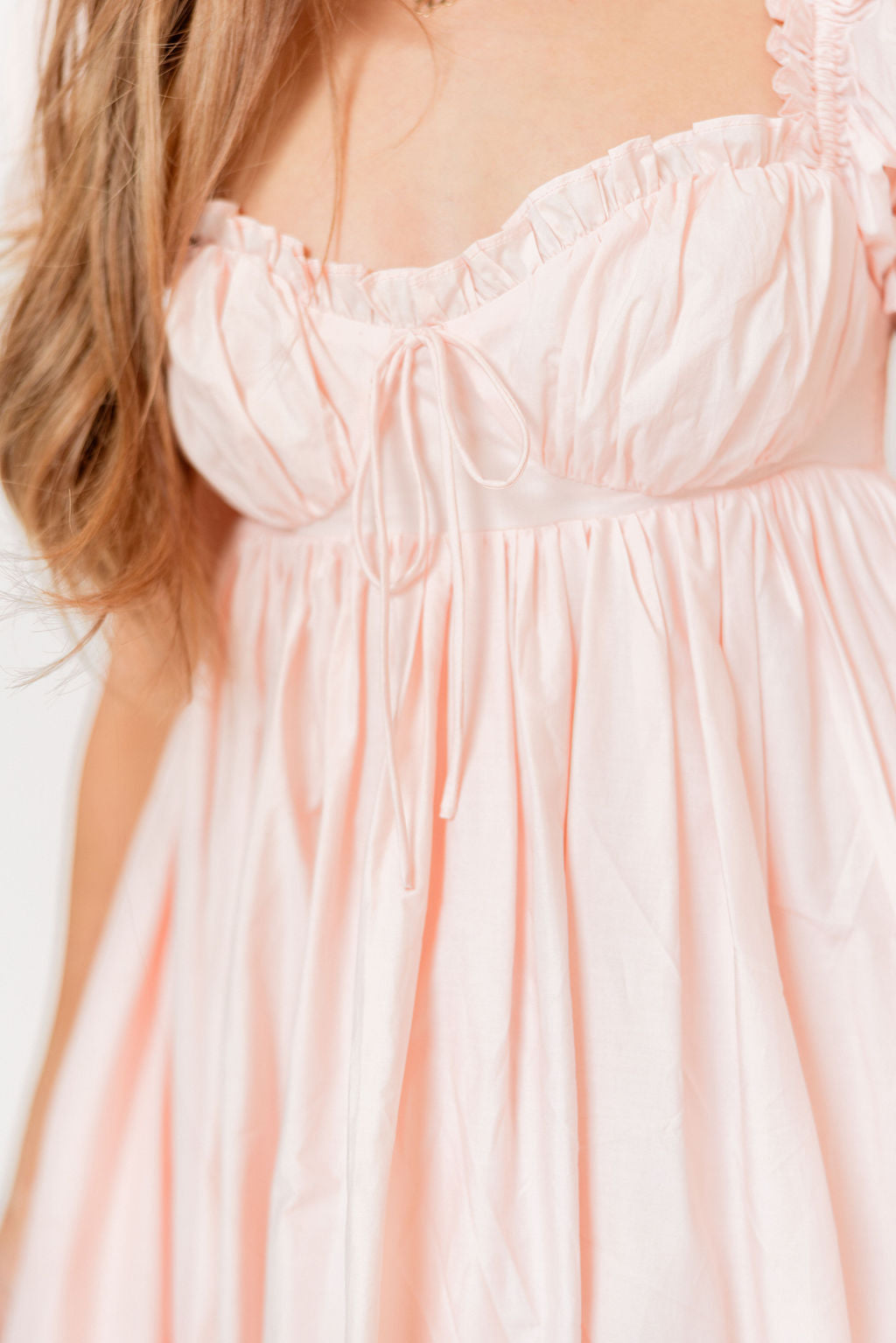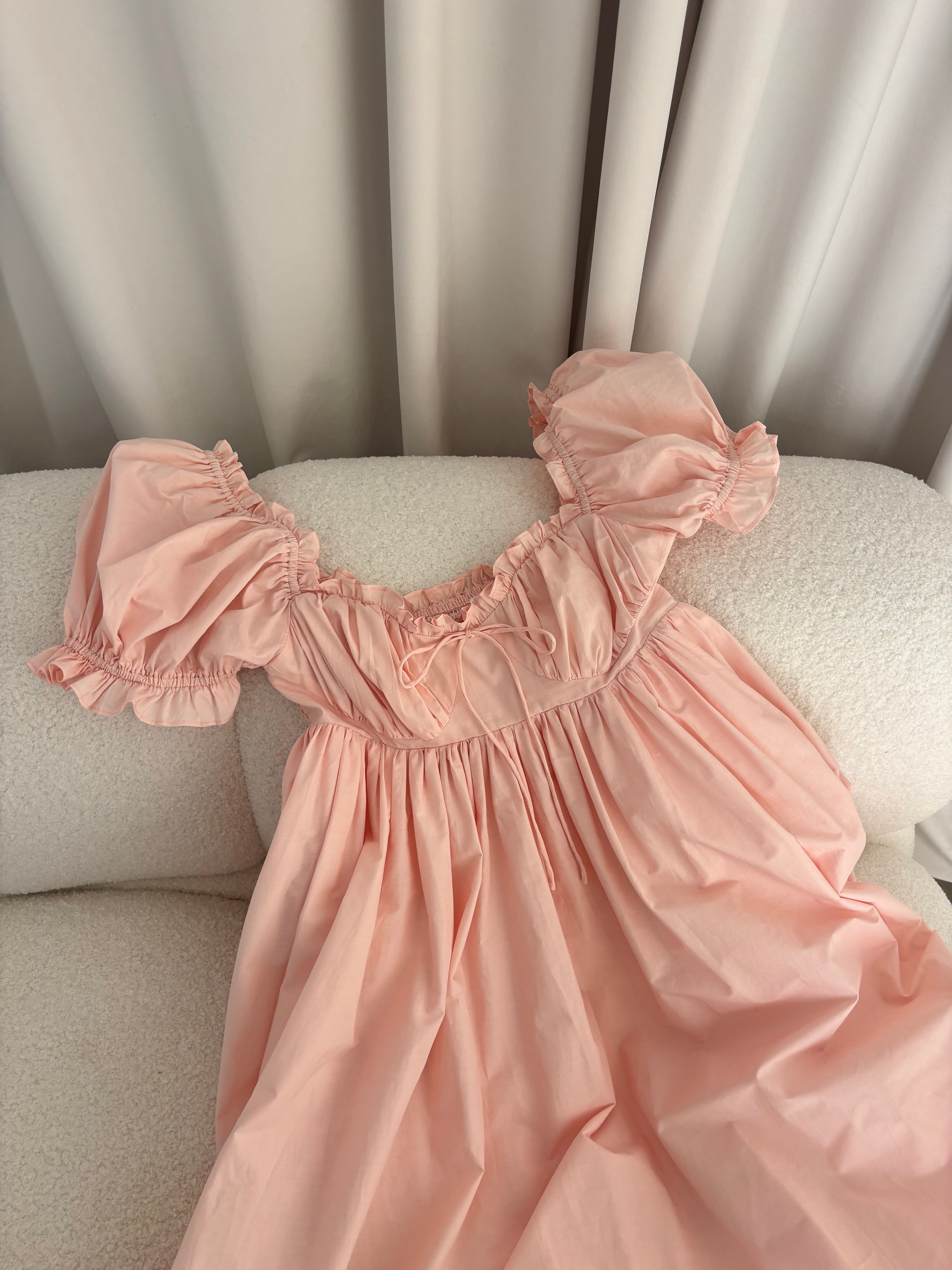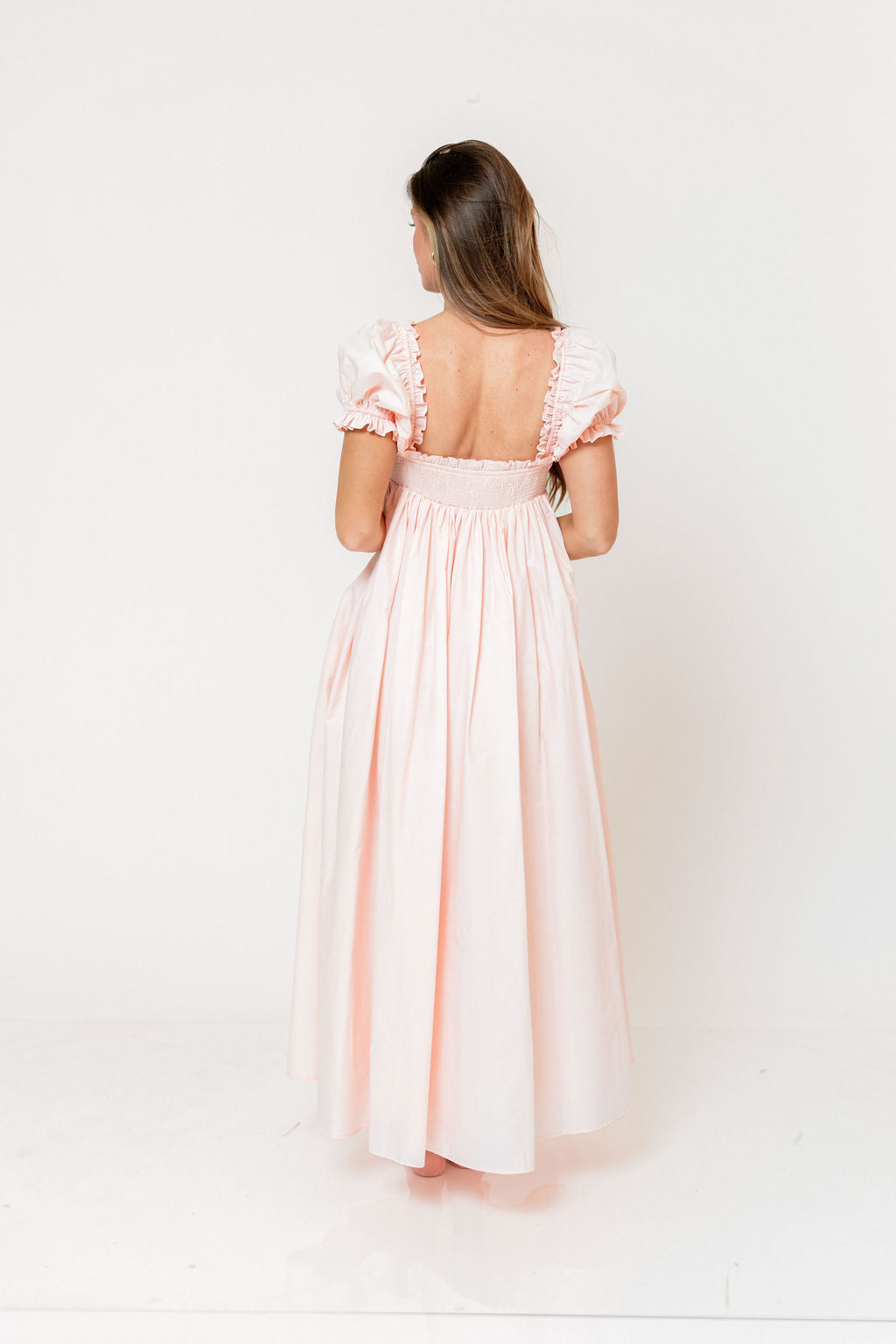 GARMENT DETAILS: Elegant, lightweight maxi dress with a flattering sweetheart neckline and front tie detail. Features short puffed sleeves, empire-waisted silhouette, and an open back with smocked panel. Finished with dual side pockets and delicate ruffle accents throughout.