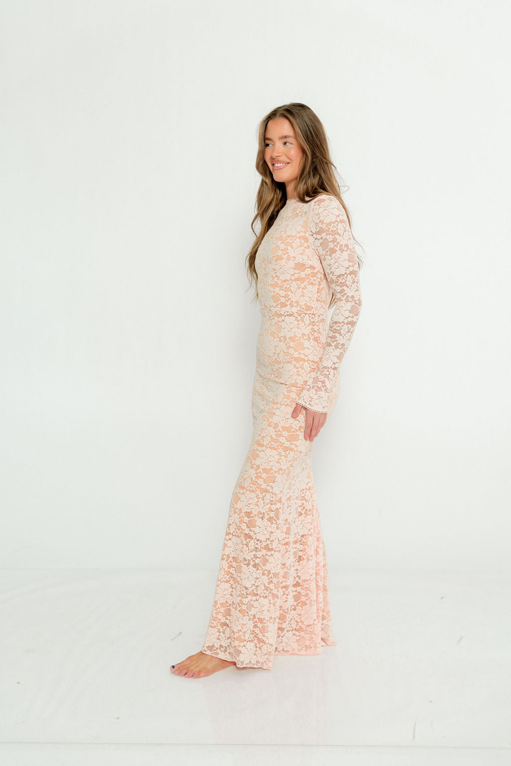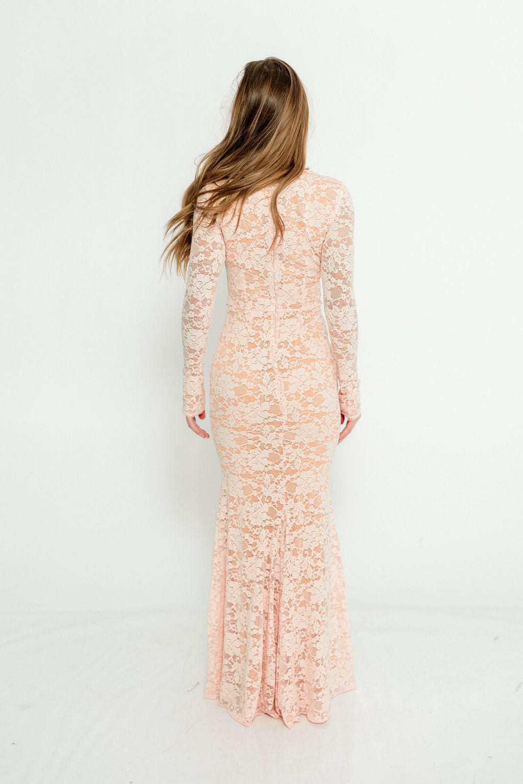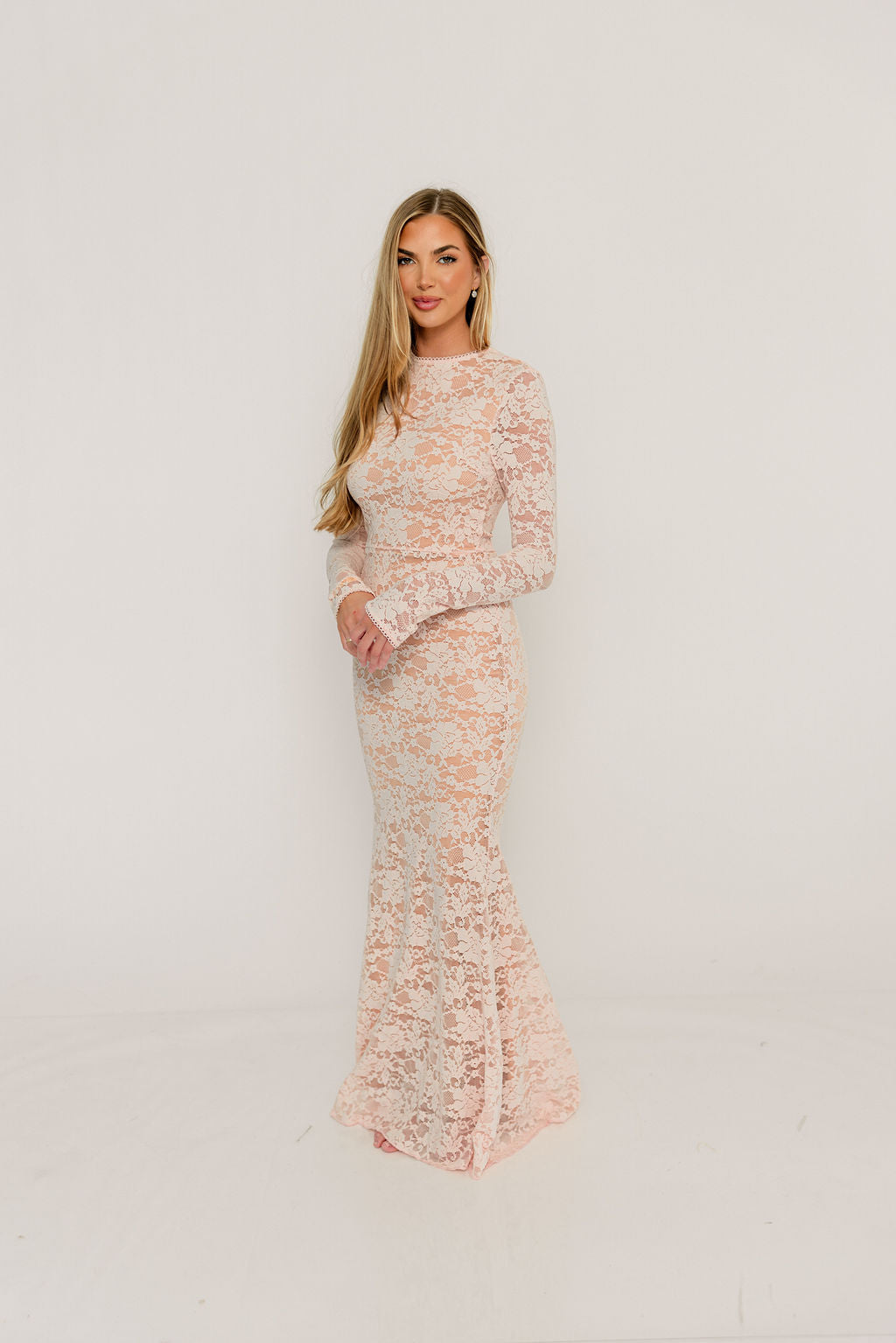 GARMENT DETAILS: Feminine pale pink maxi dress with high rounded neckline, long sleeves, and fit-and-flare silhouette with paneled, flared skirt. Features a delicate floral lace overlay, eyelet trim, and back zip with full neutral lining.