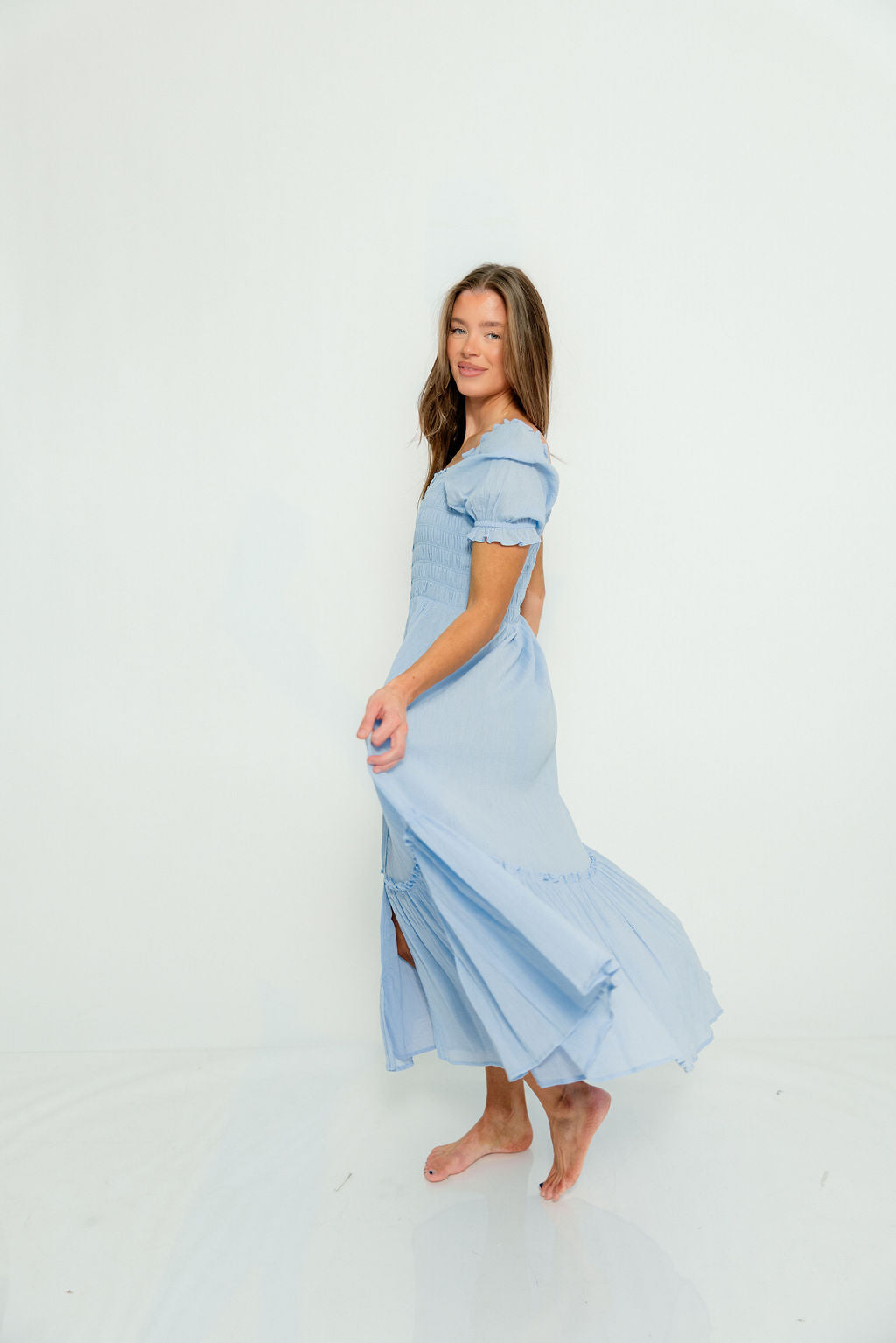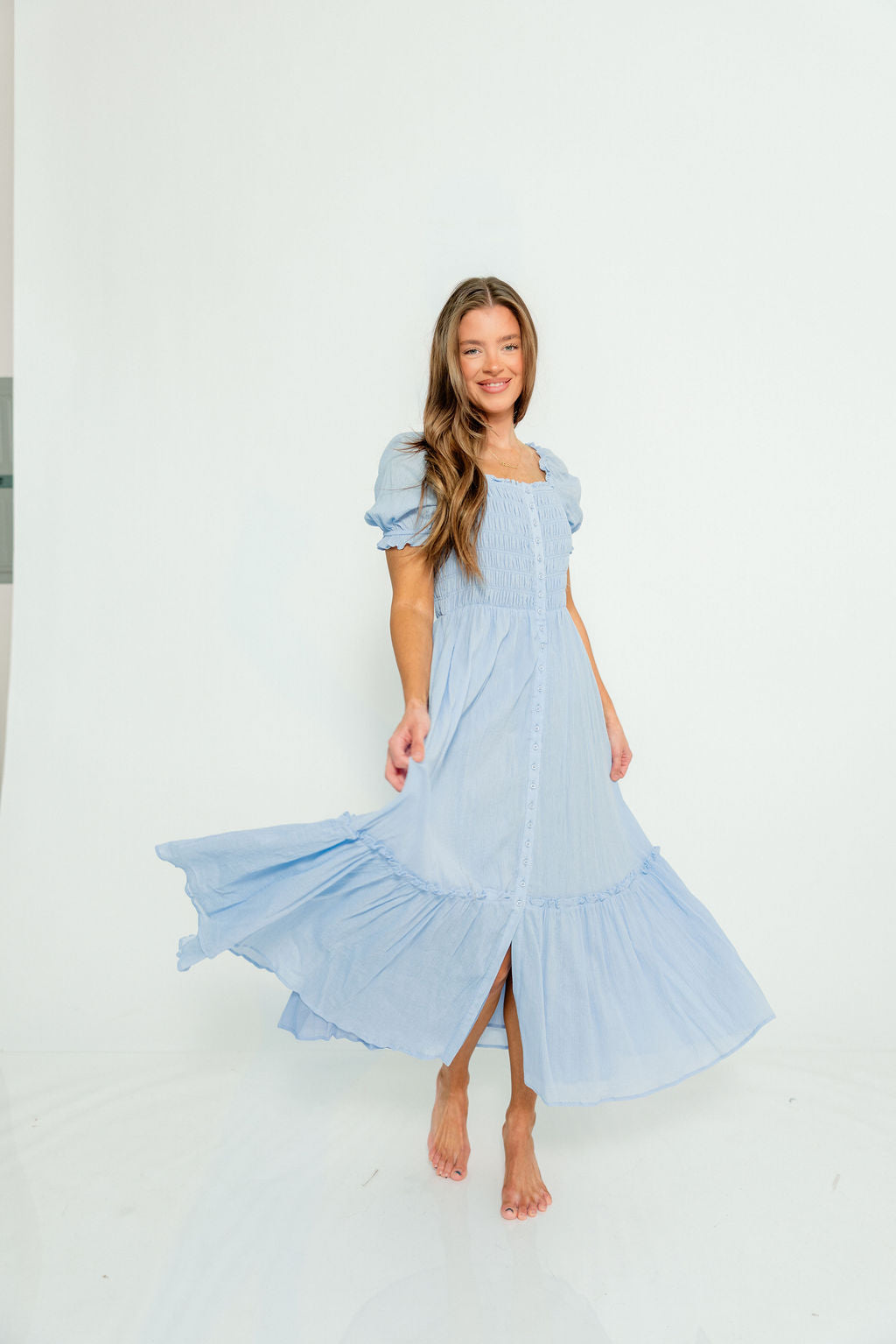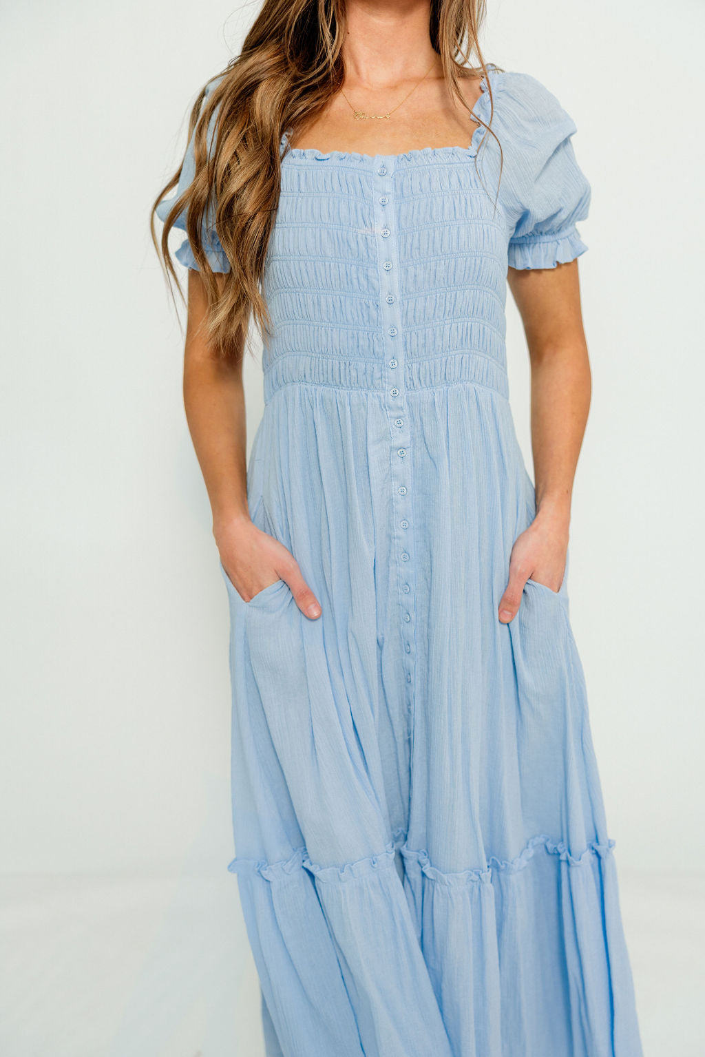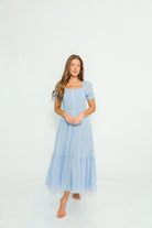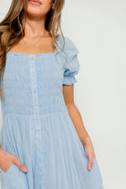 Mara Smocked Button Down Maxi Dress in Blue Aura