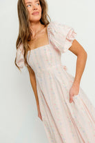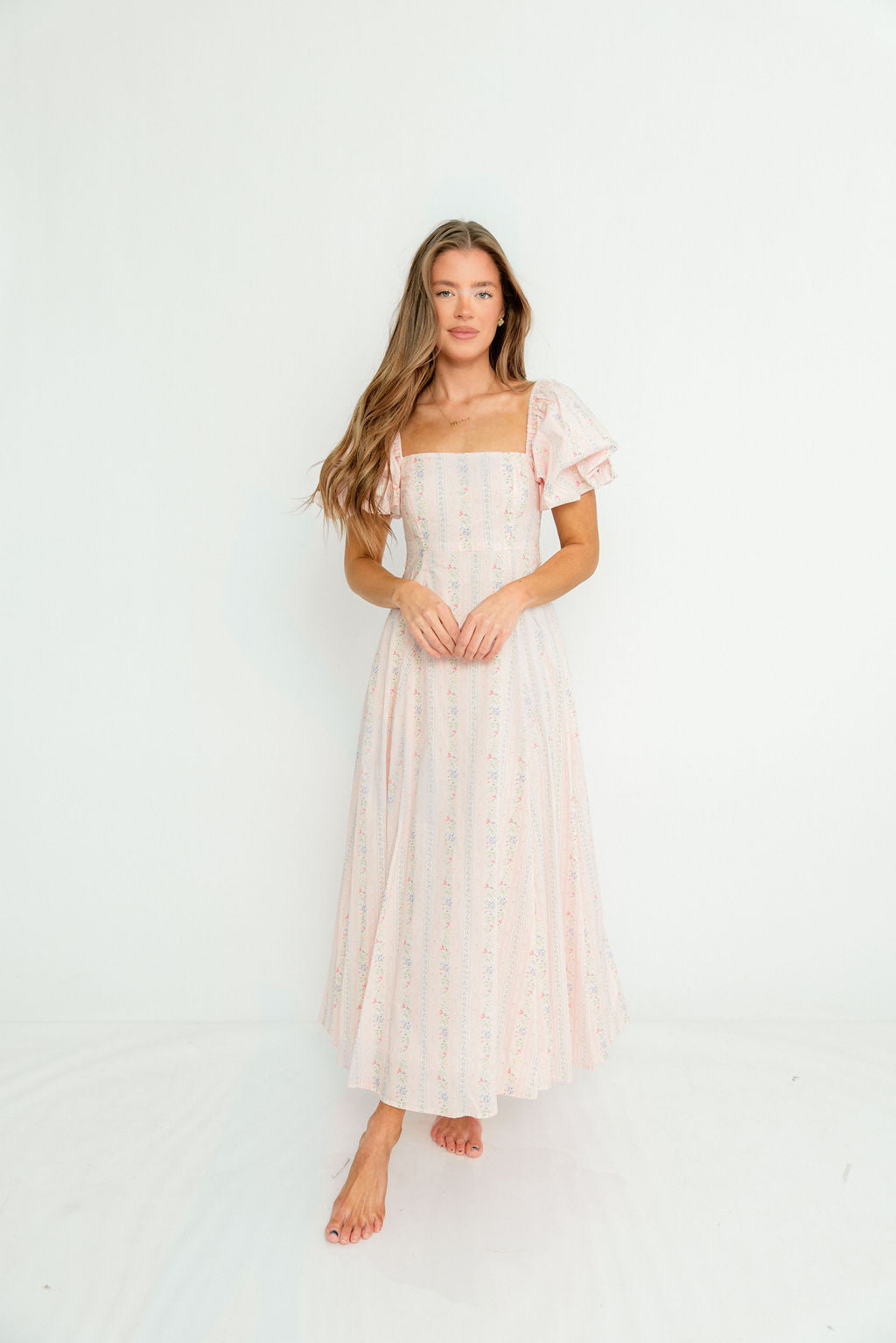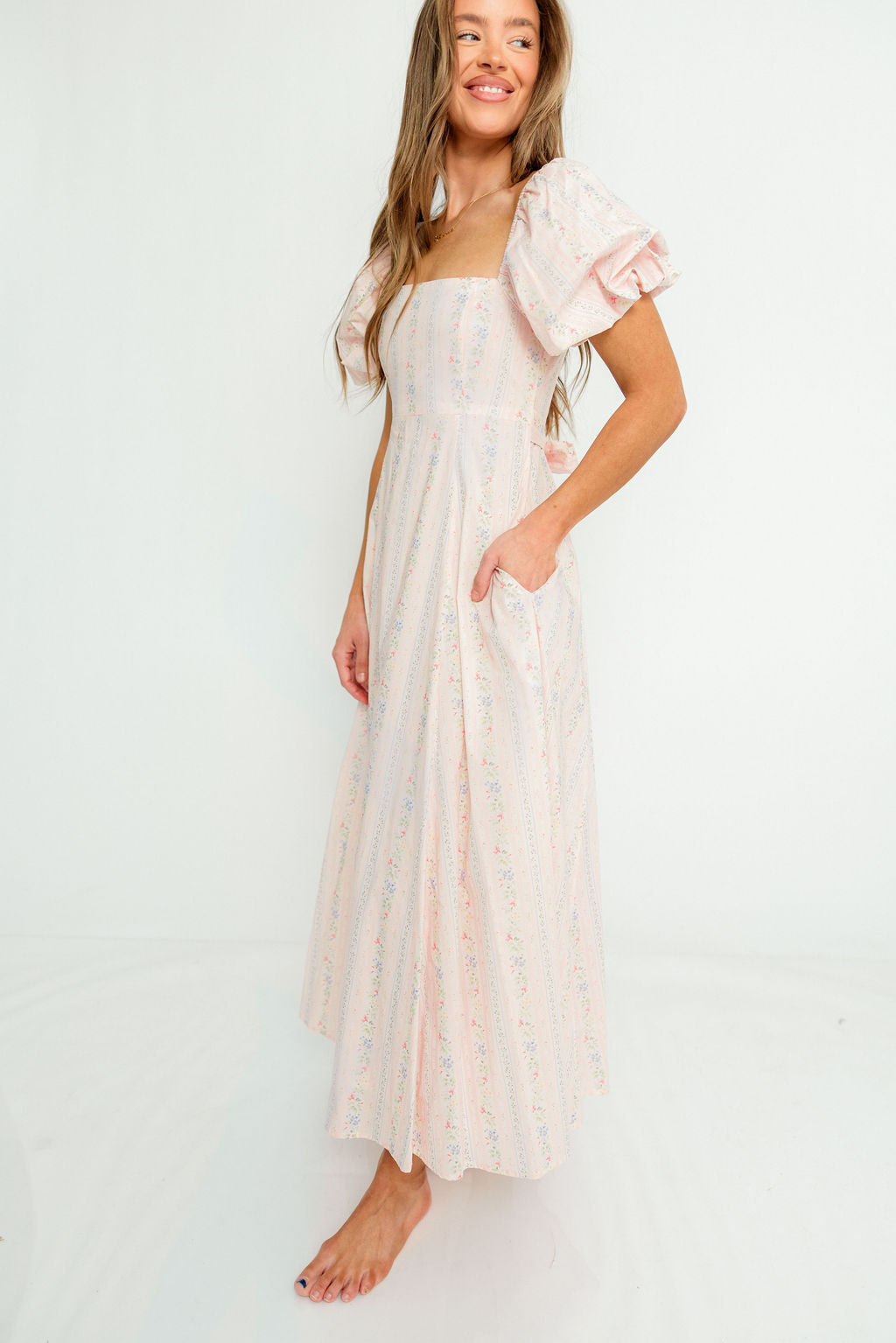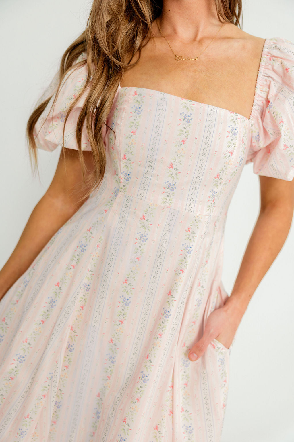 Tate Floral Print Puff Sleeve Midi Dress in Pink