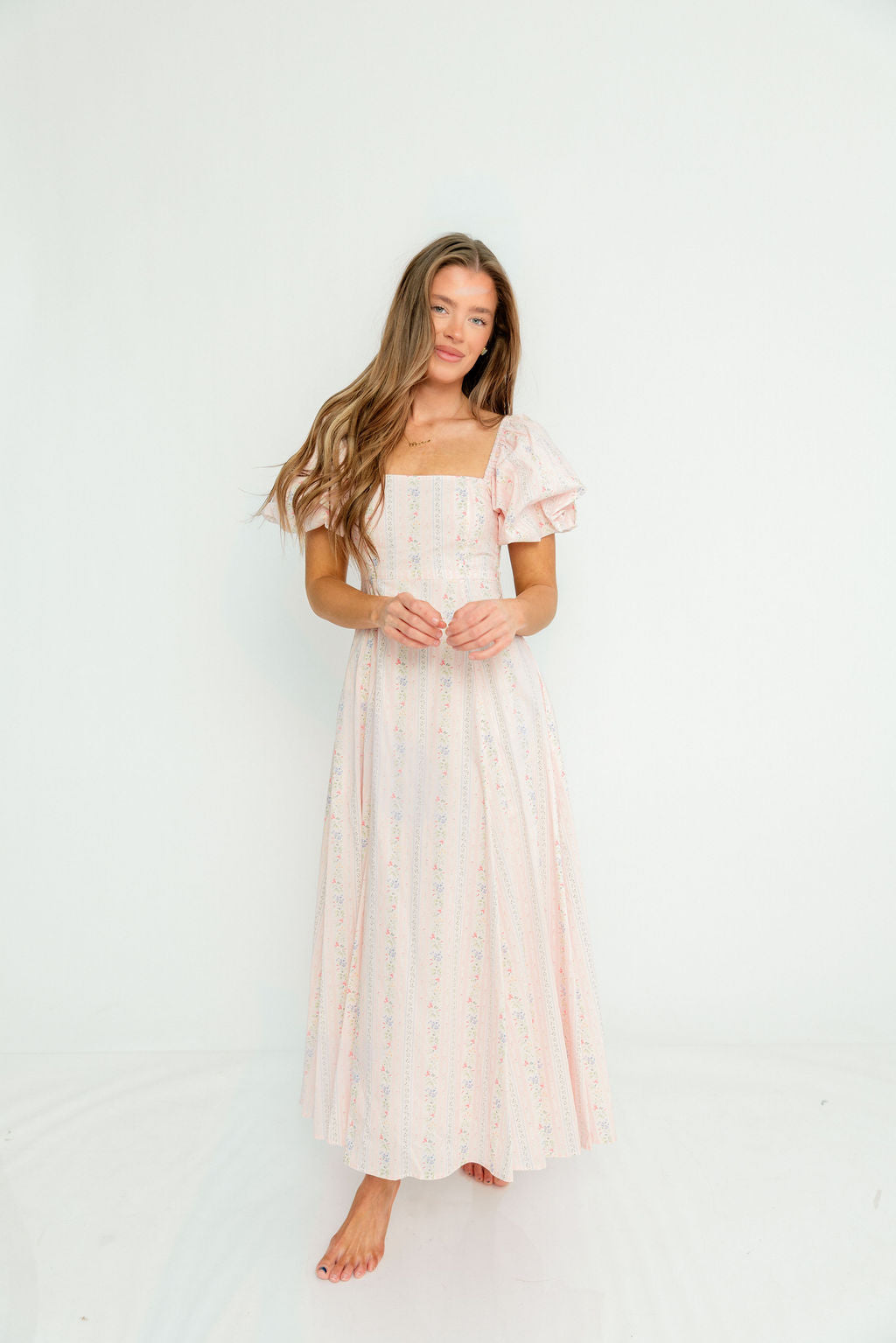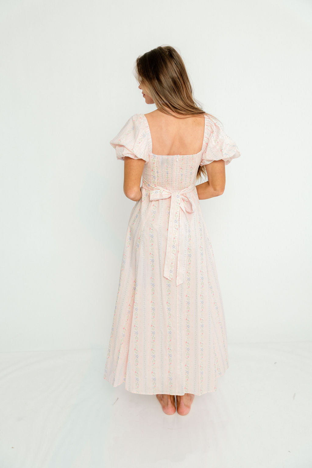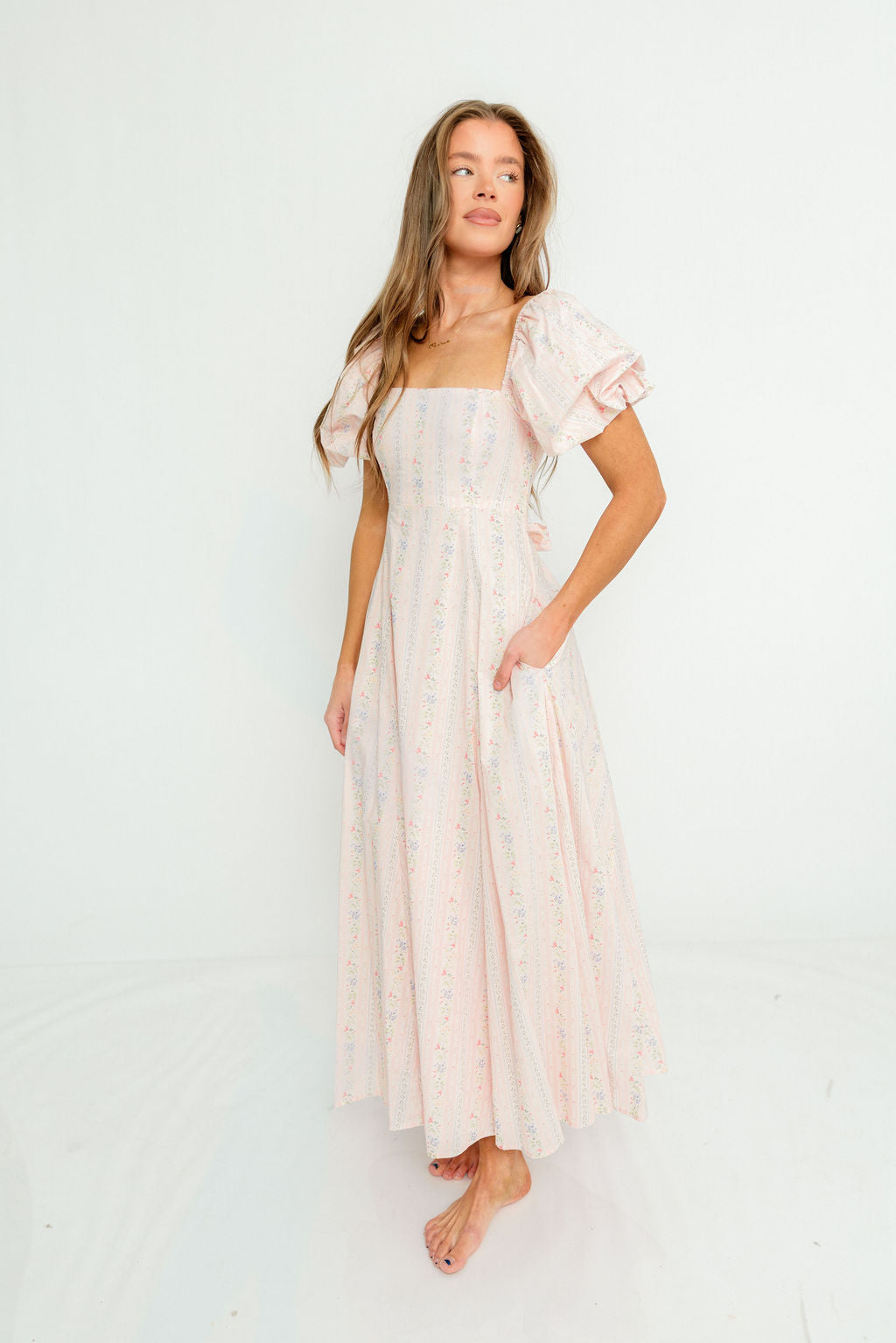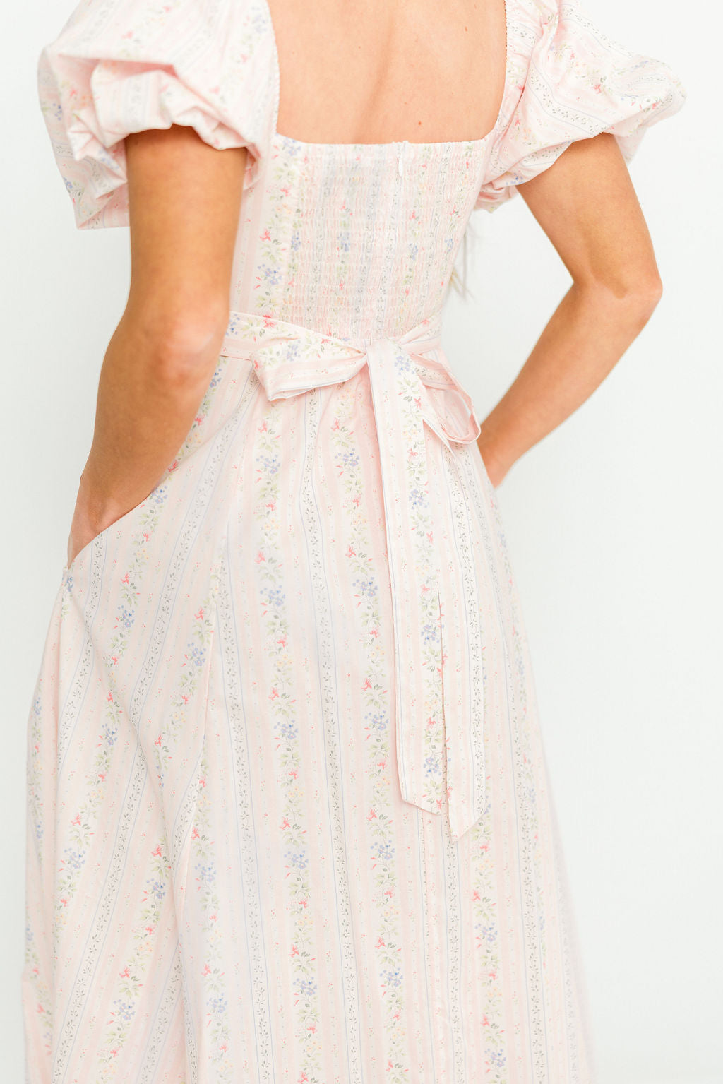 Tate Floral Print Puff Sleeve Midi Dress in Pink