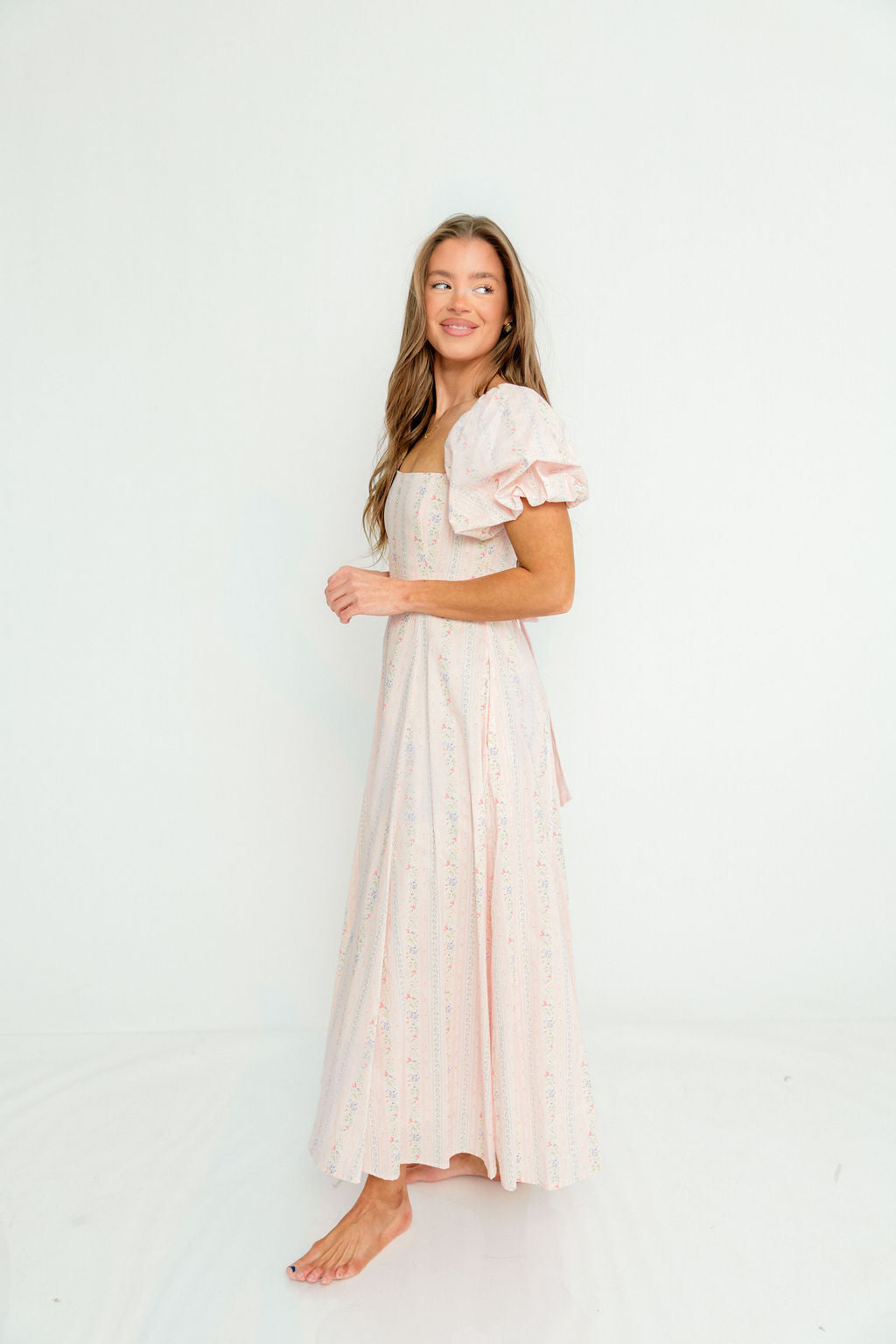 Meet our summer dream dress--the Tate Maxi! This beautiful silhouette offers a fitted, flattering bodice paired with a smocked back panel for comfort, plus a self-tie sash to cinch your waist and highlight those beautiful puffed sleeves. Best of all, this gown is crafted from premium 100% cotton materials, making it a versatile and sustainable styling choice!