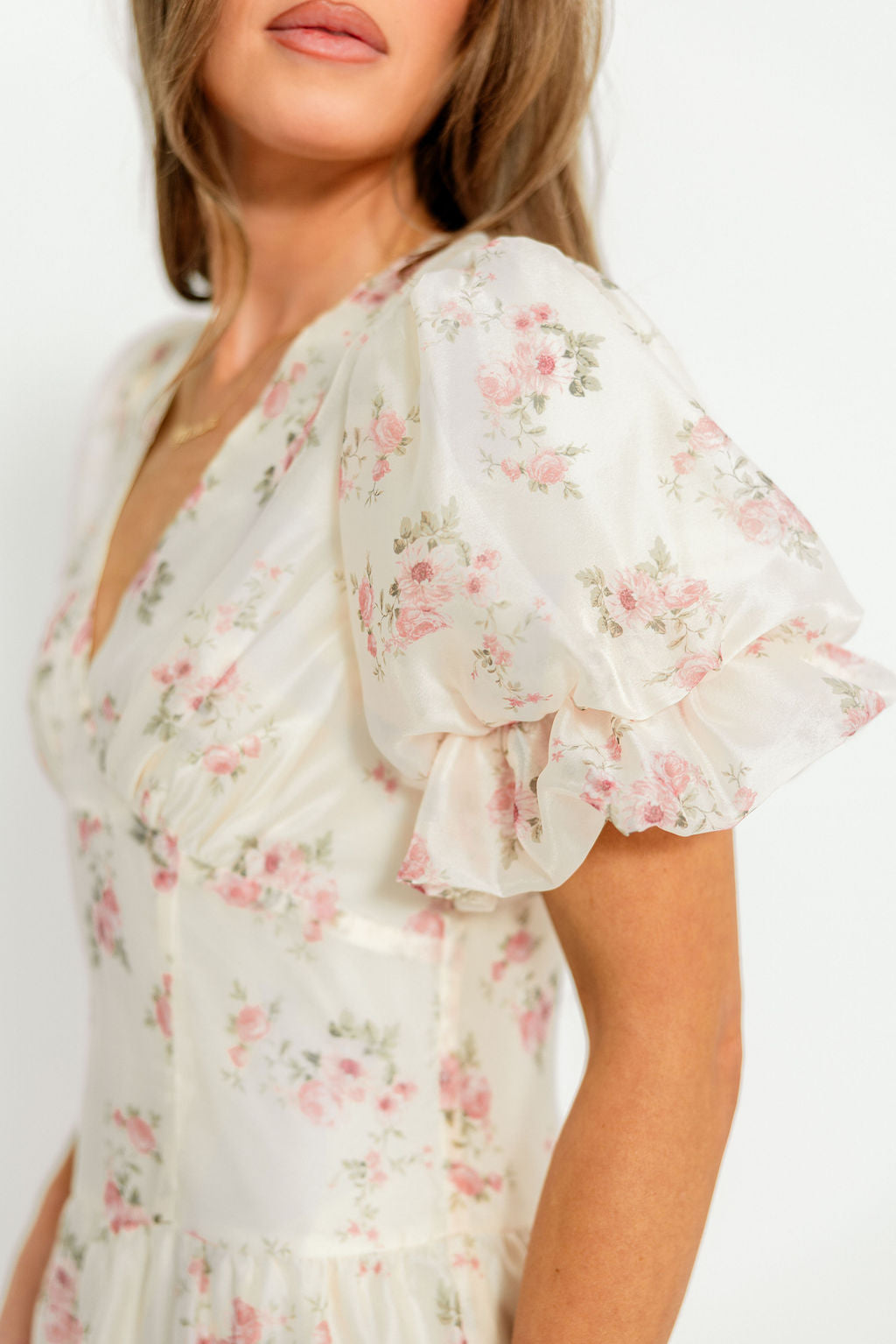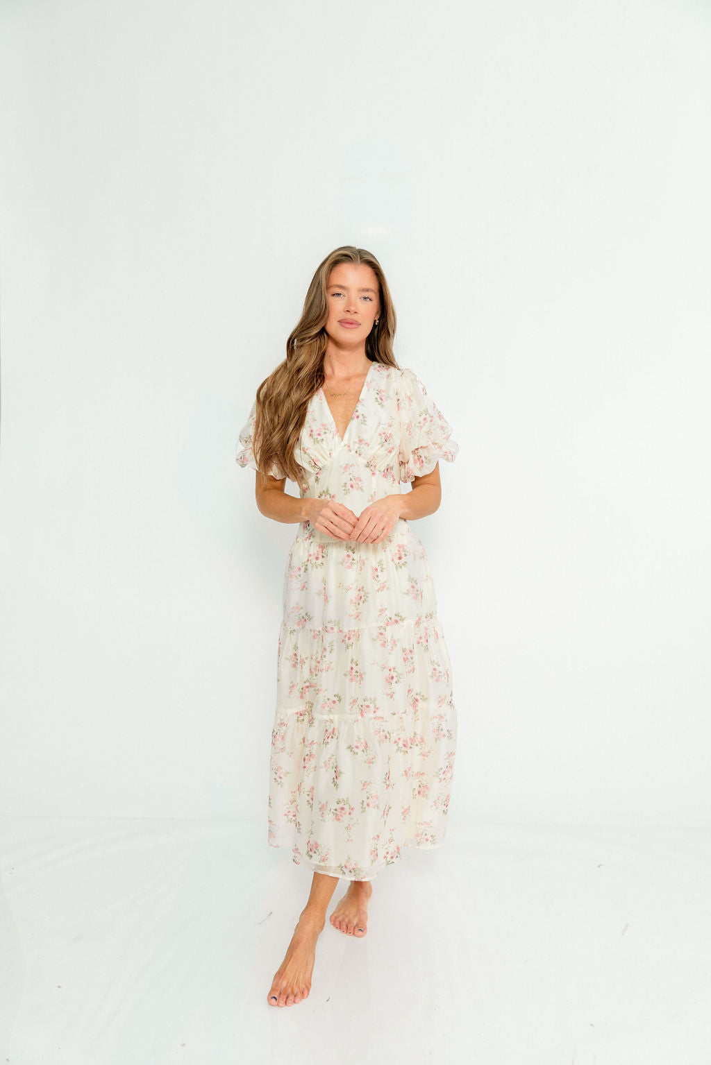Kels Puff Sleeve Tiered Midi Dress in Ivory/Pink Floral