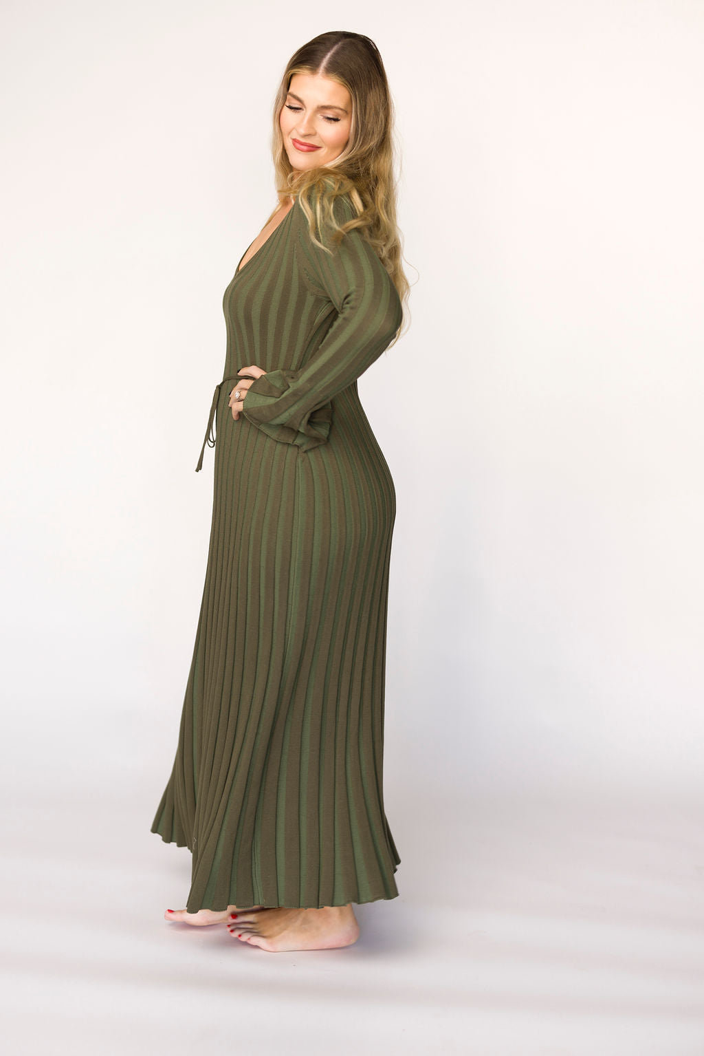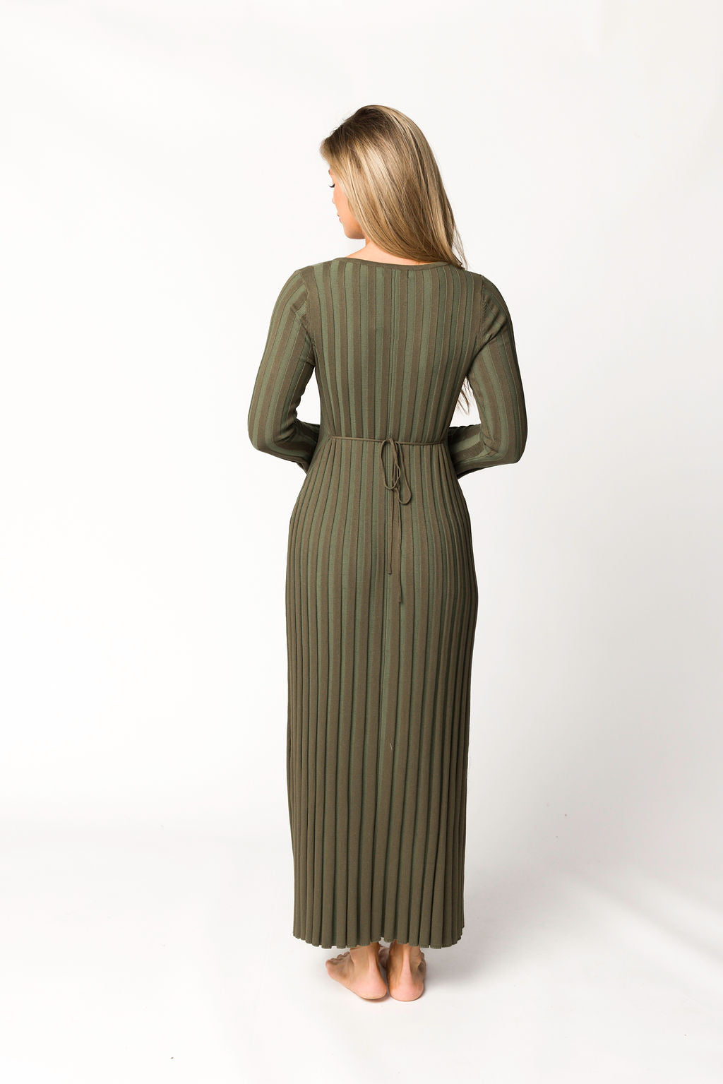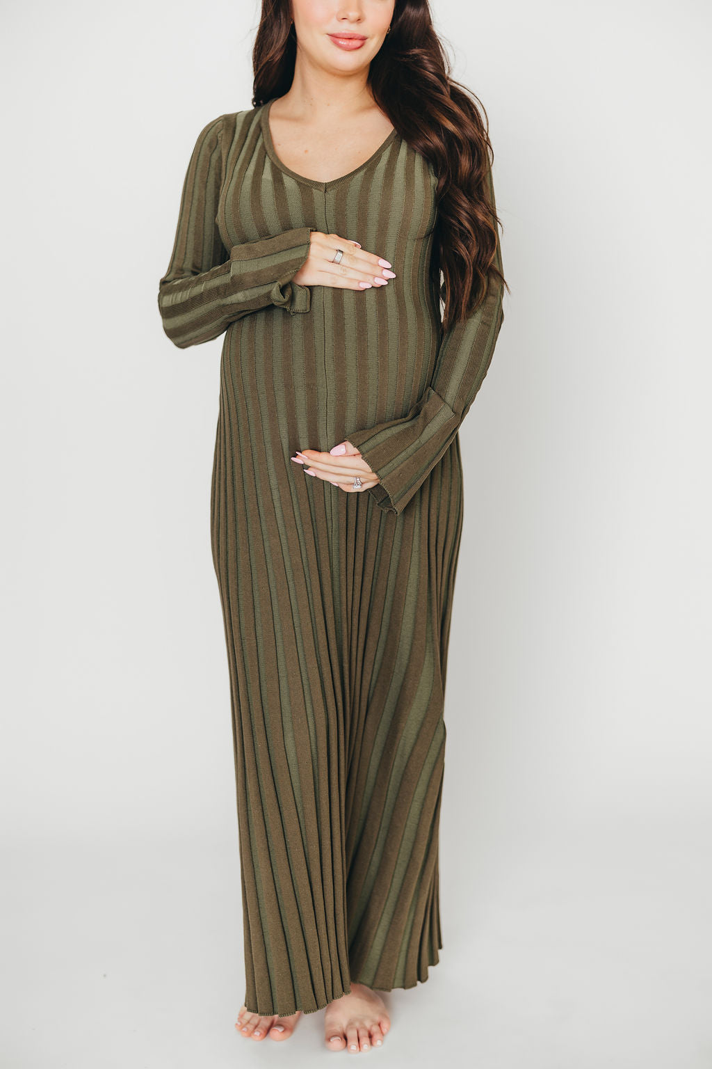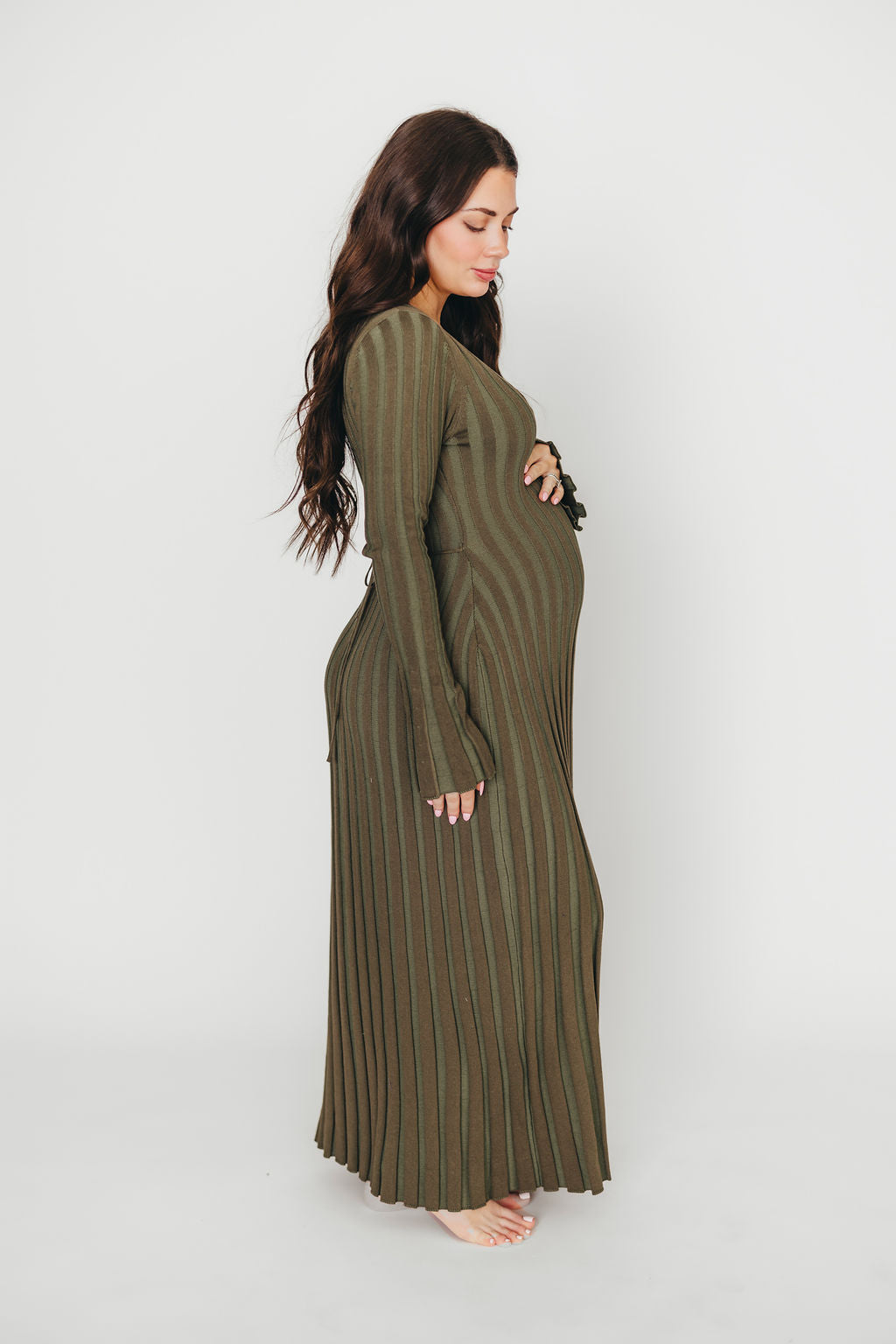 Hadley Long Sleeve V-Neck Knit Maxi Dress in Olive- Bump Friendly