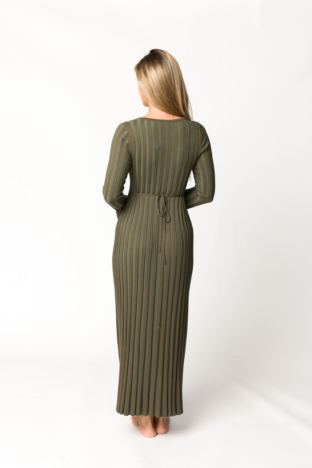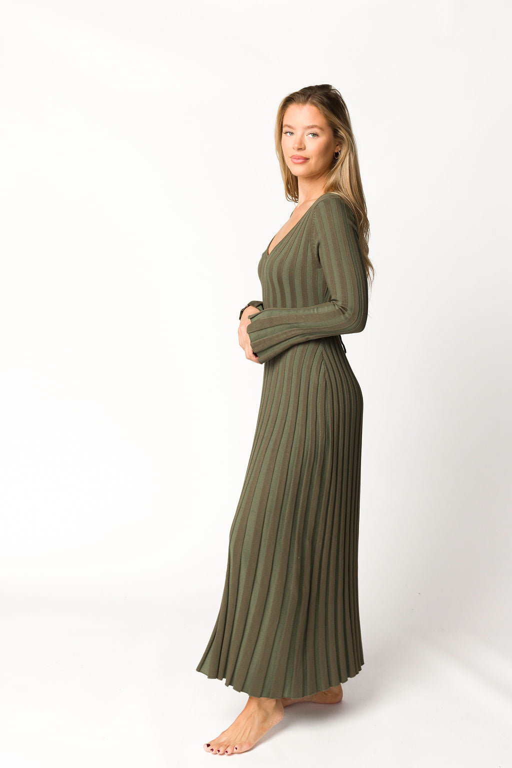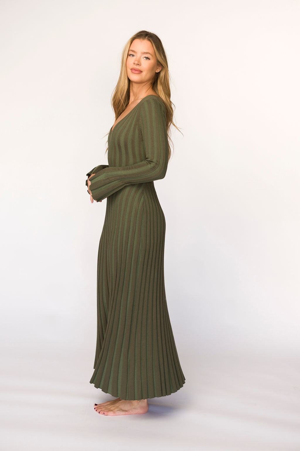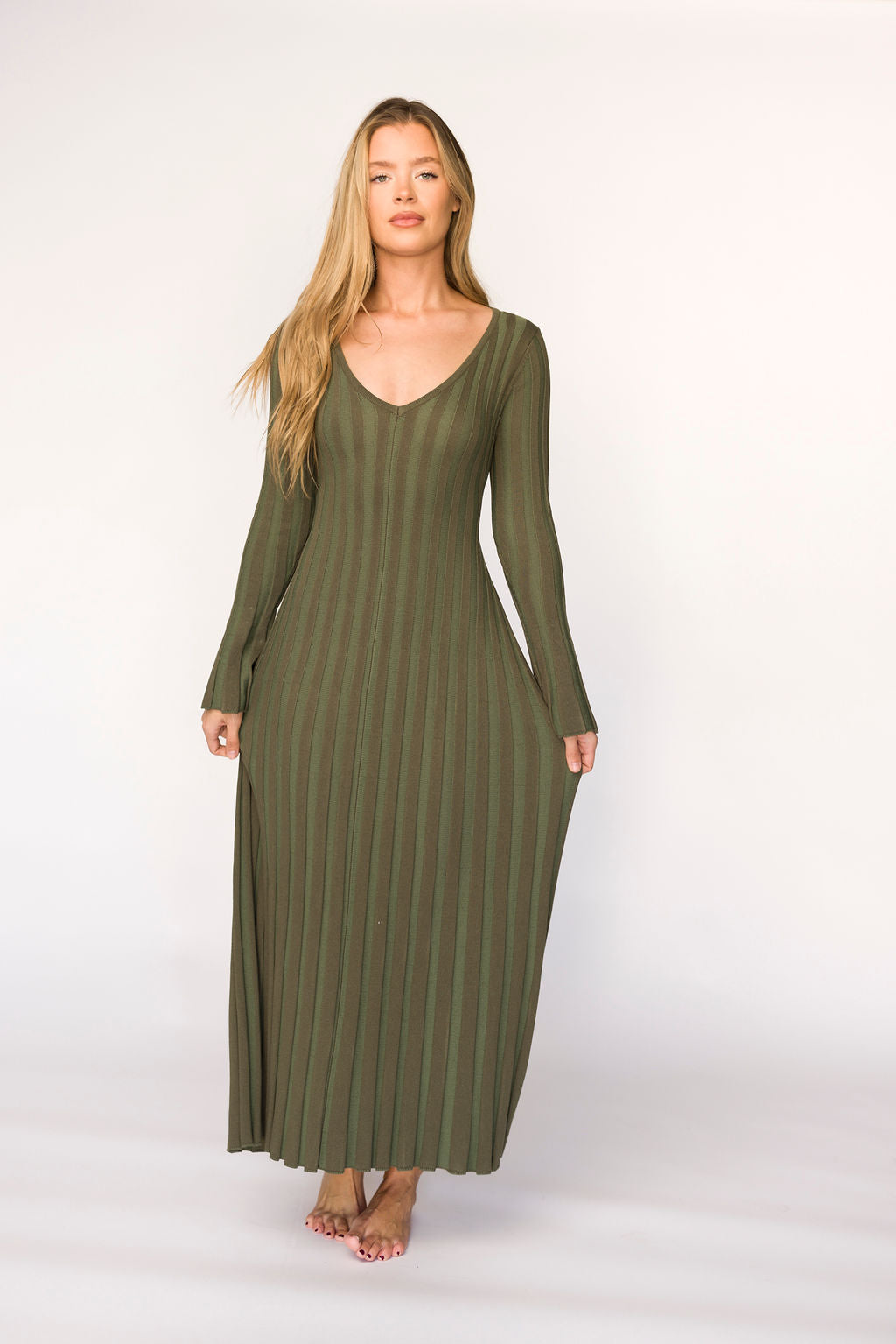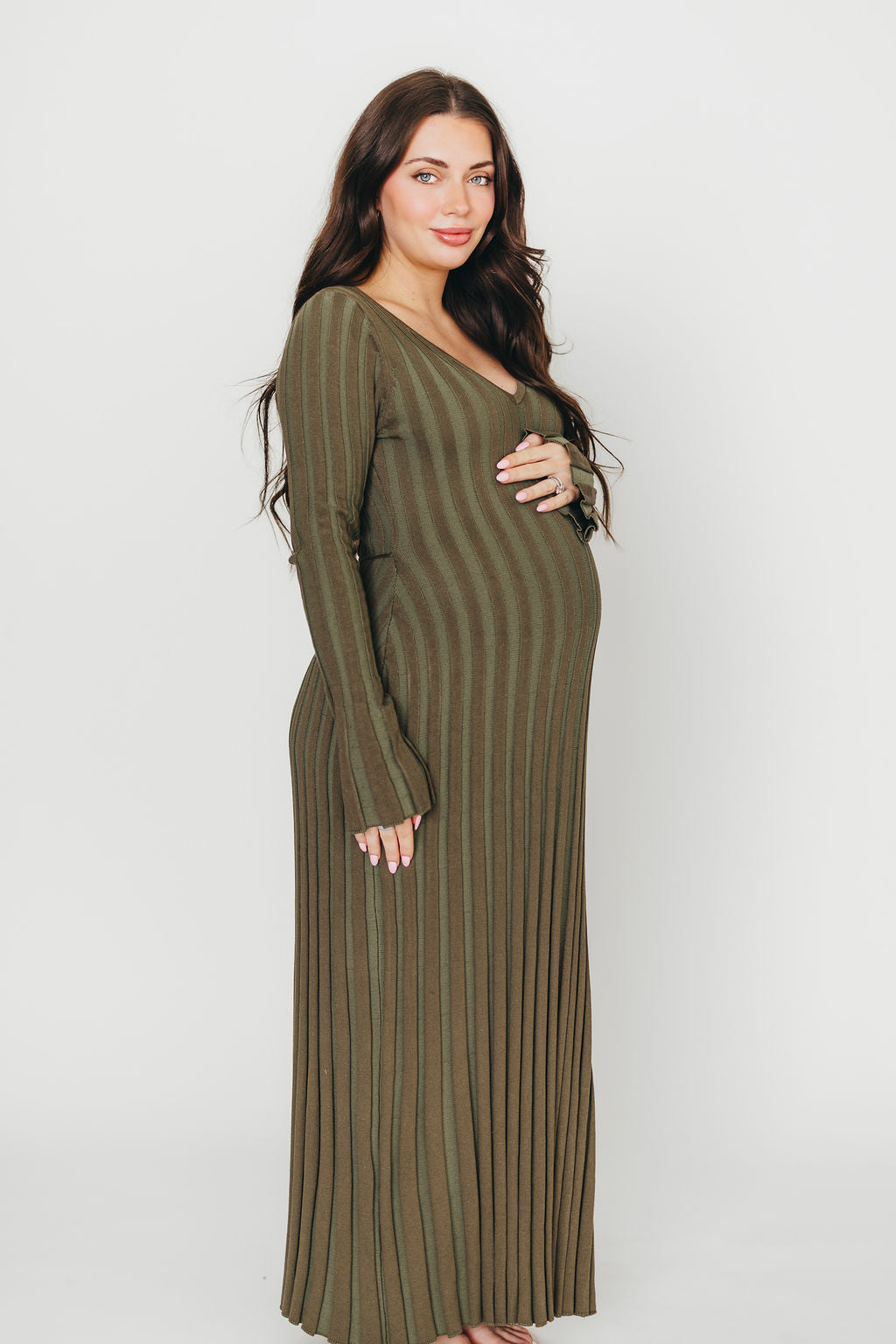 Hadley Long Sleeve V-Neck Knit Maxi Dress in Olive- Bump Friendly