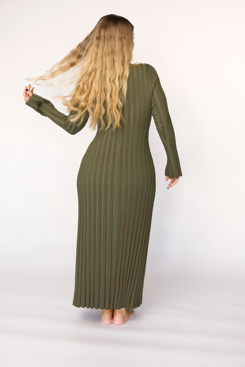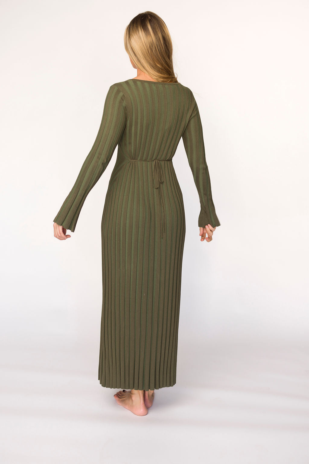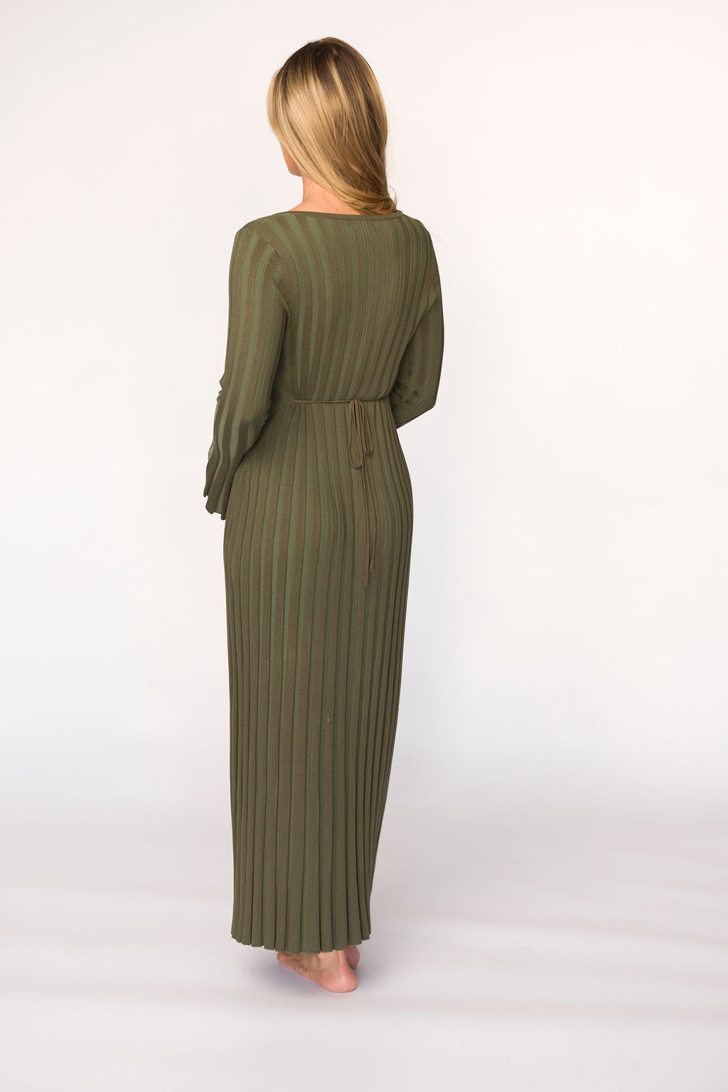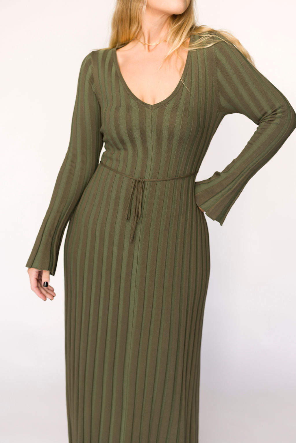 GARMENT DETAILS: Mid-weight, silky ribbed knit maxi dress with long sleeves and V-neckline. Finished with an attached, adjustable waist tie.
