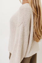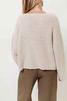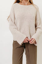 GARMENT DETAILS: Soft popcorn knit sweater with boat neckline, long sleeves, and dropped shoulders. Finished with rolled edge hem.