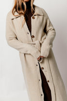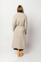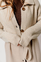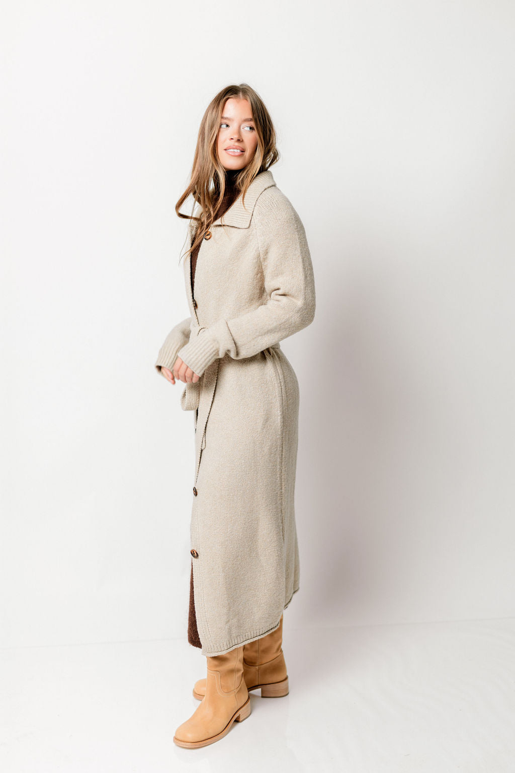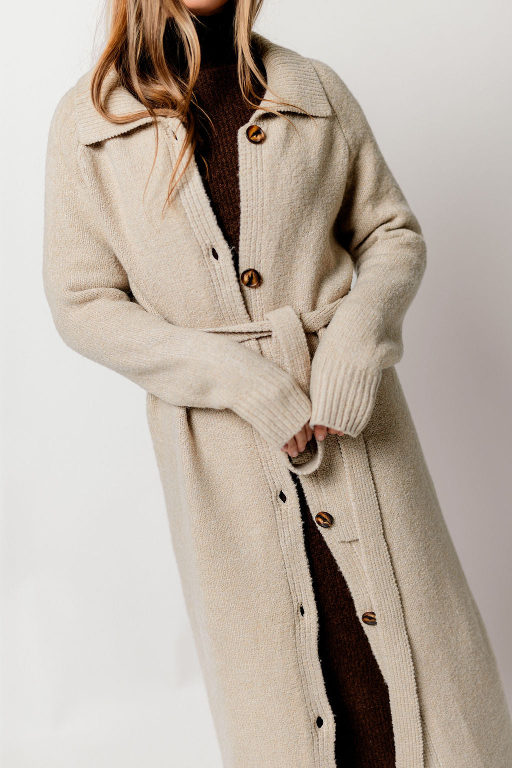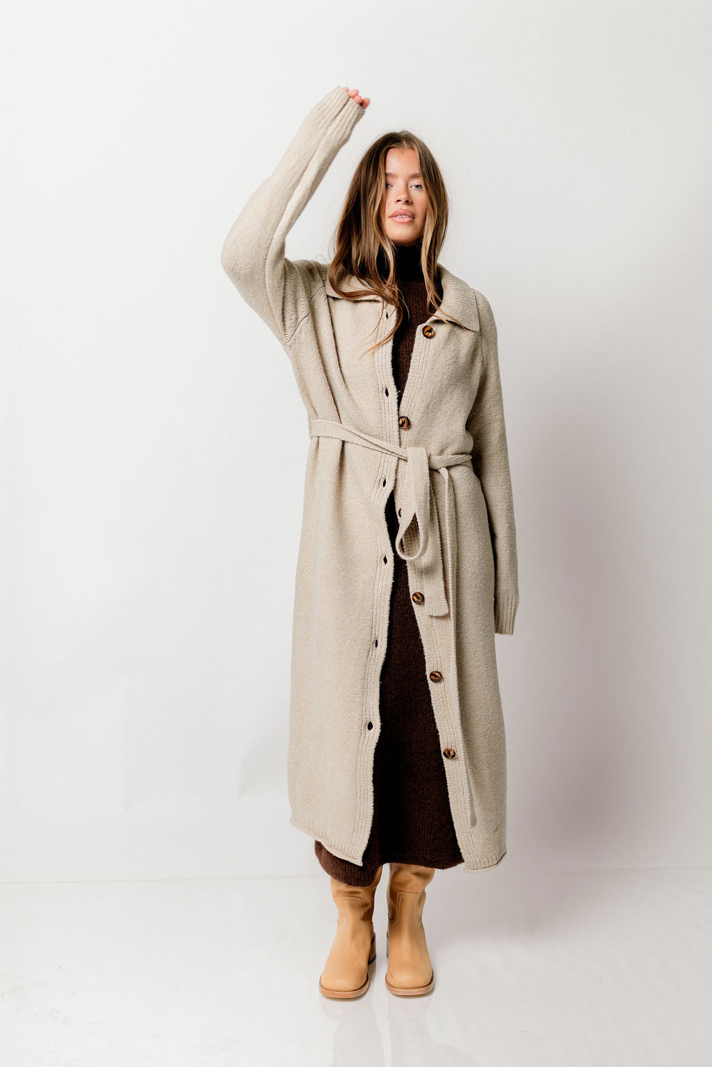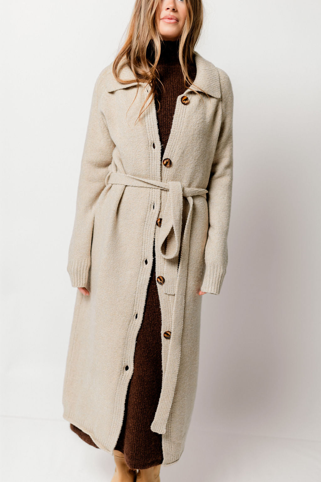 GARMENT DETAILS: Elegant long cardigan coat with a lapel-collared neckline, functional front button closure, and included self-tie waist belt.