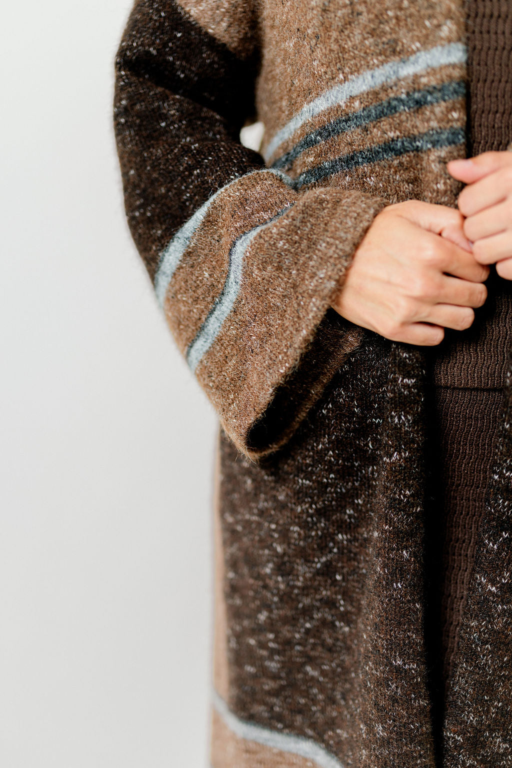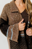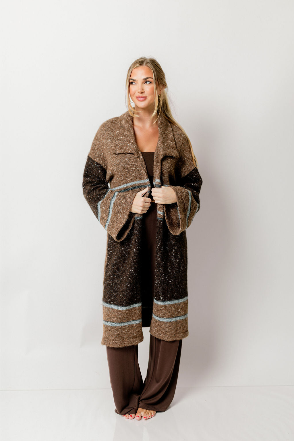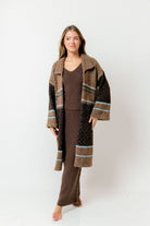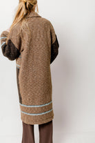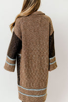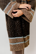 GARMENT DETAILS: Cozy wool-blend cardigan in a long duster length. Features dropped shoulders, collared neckline, and colorblock stripe accents.