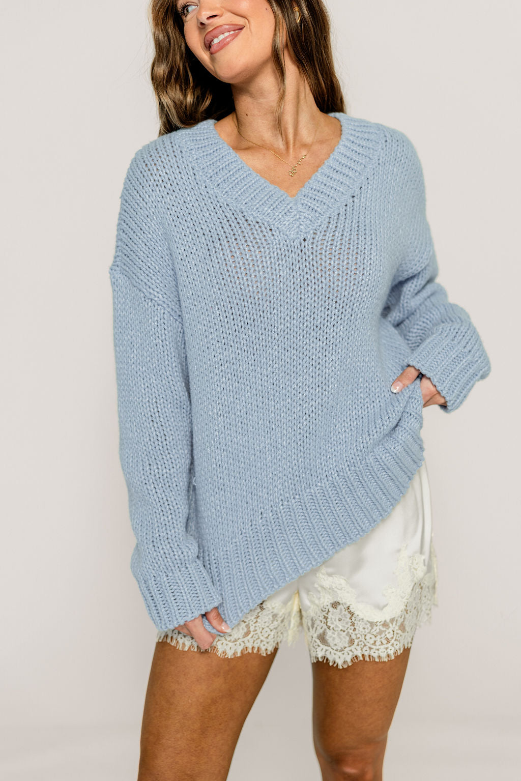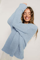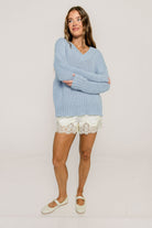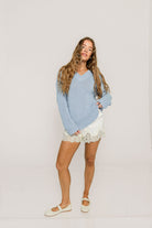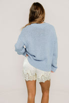 Lindsey Balloon Sleeve V-Neck Sweater in Light Blue