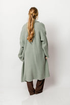 This longline duster sweater has a sleek silhouette and relaxed fit that makes it great for layering all season long! We love it paired with a fitted turtleneck and trousers, or over a favorite athleisure set.