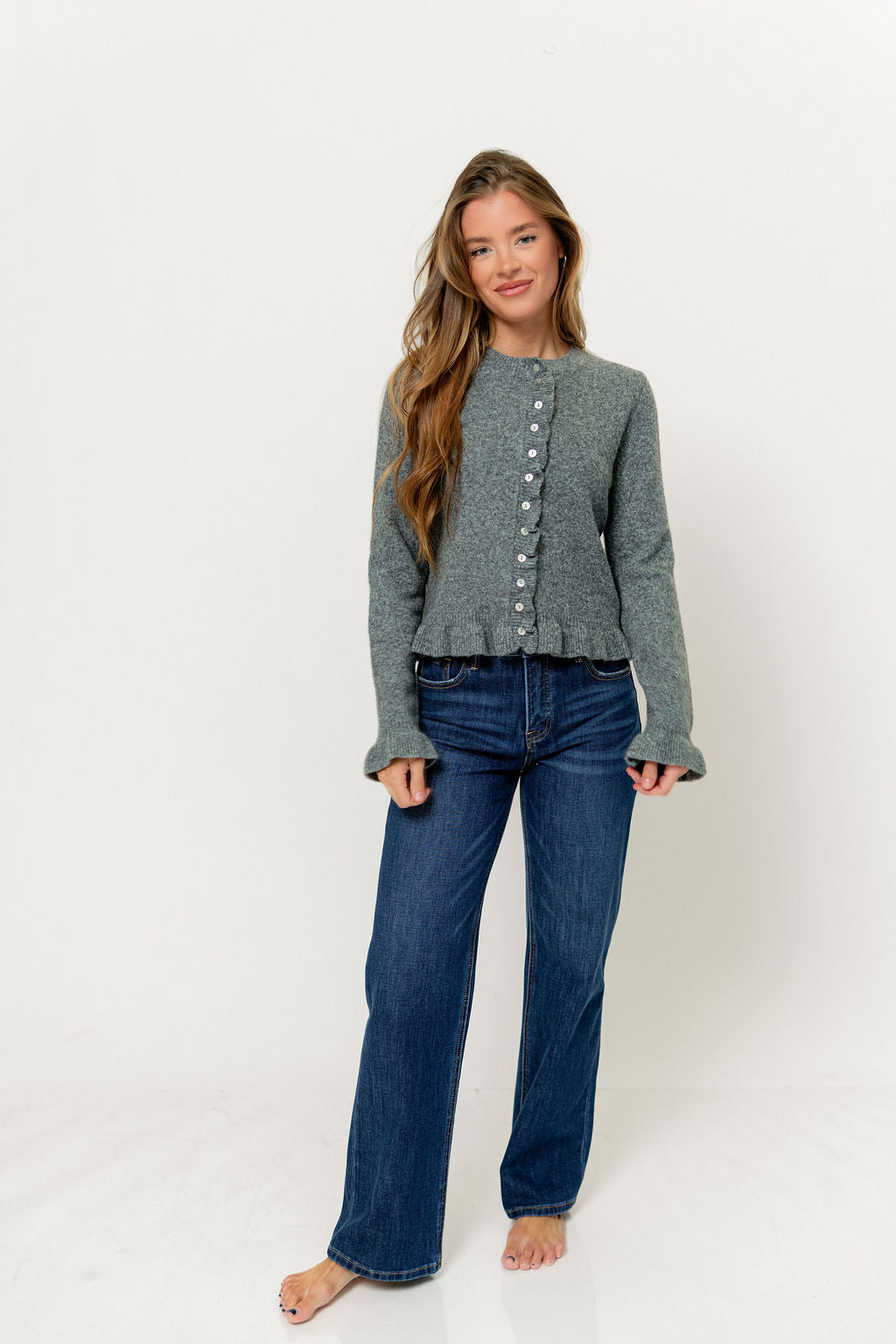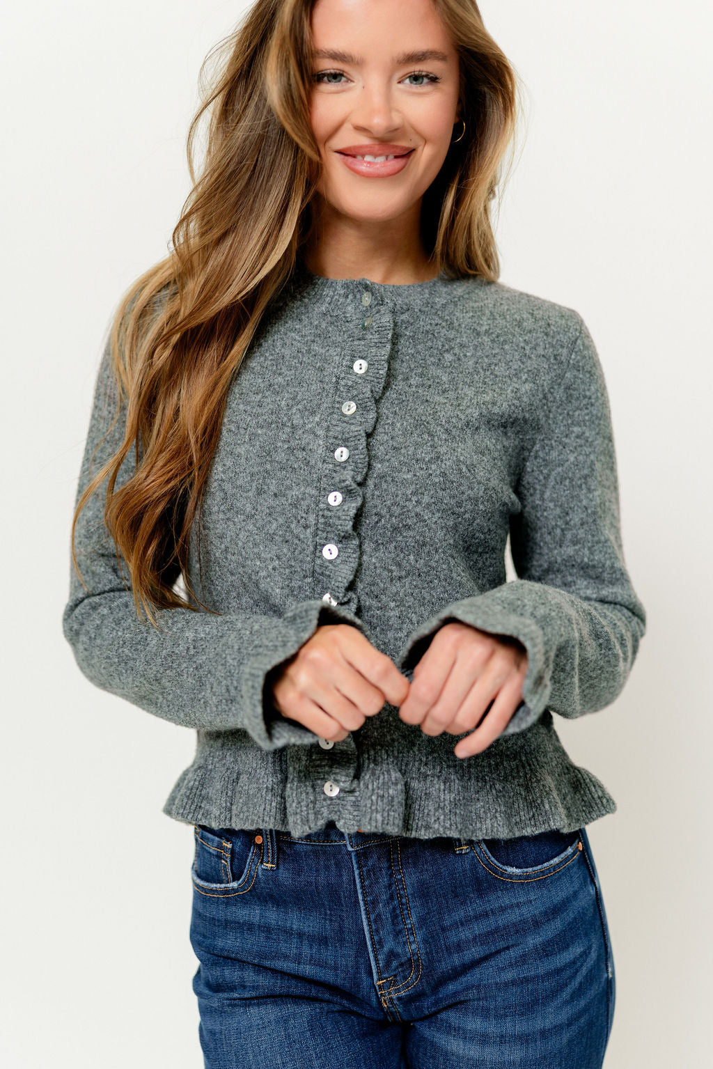 Soft knit meets feminine ruffles in the Suzie Cardigan this season! With its romantic ruffle accents and cozy tailored fit, this elegant little top offers a gentle touch to any outfit.