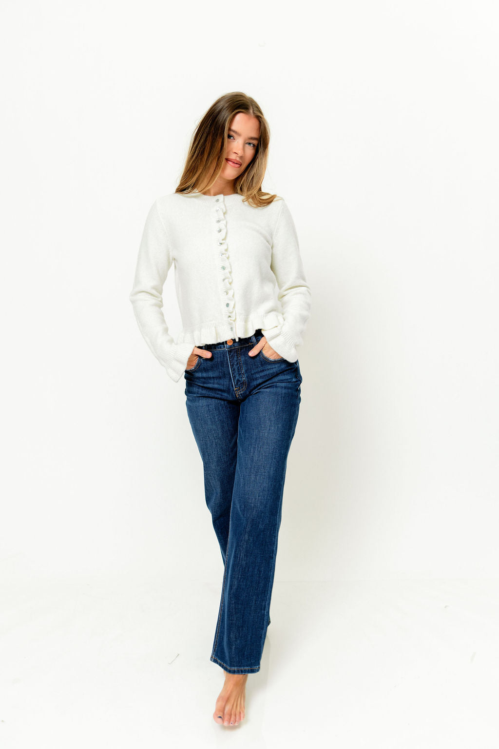 Soft knit meets feminine ruffles in the Suzie Cardigan this season! With its romantic ruffle accents and cozy tailored fit, this elegant little top offers a gentle touch to any outfit.