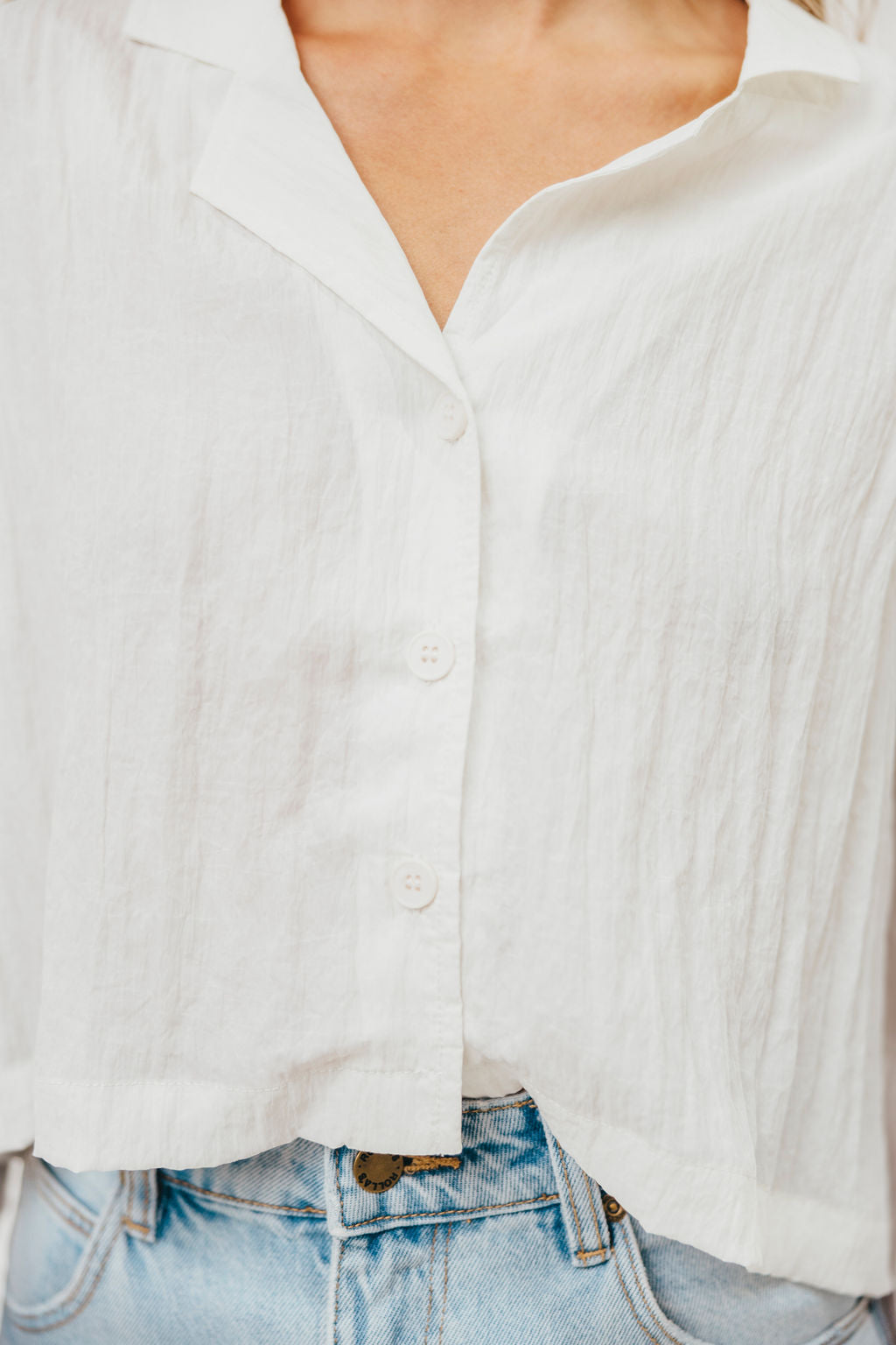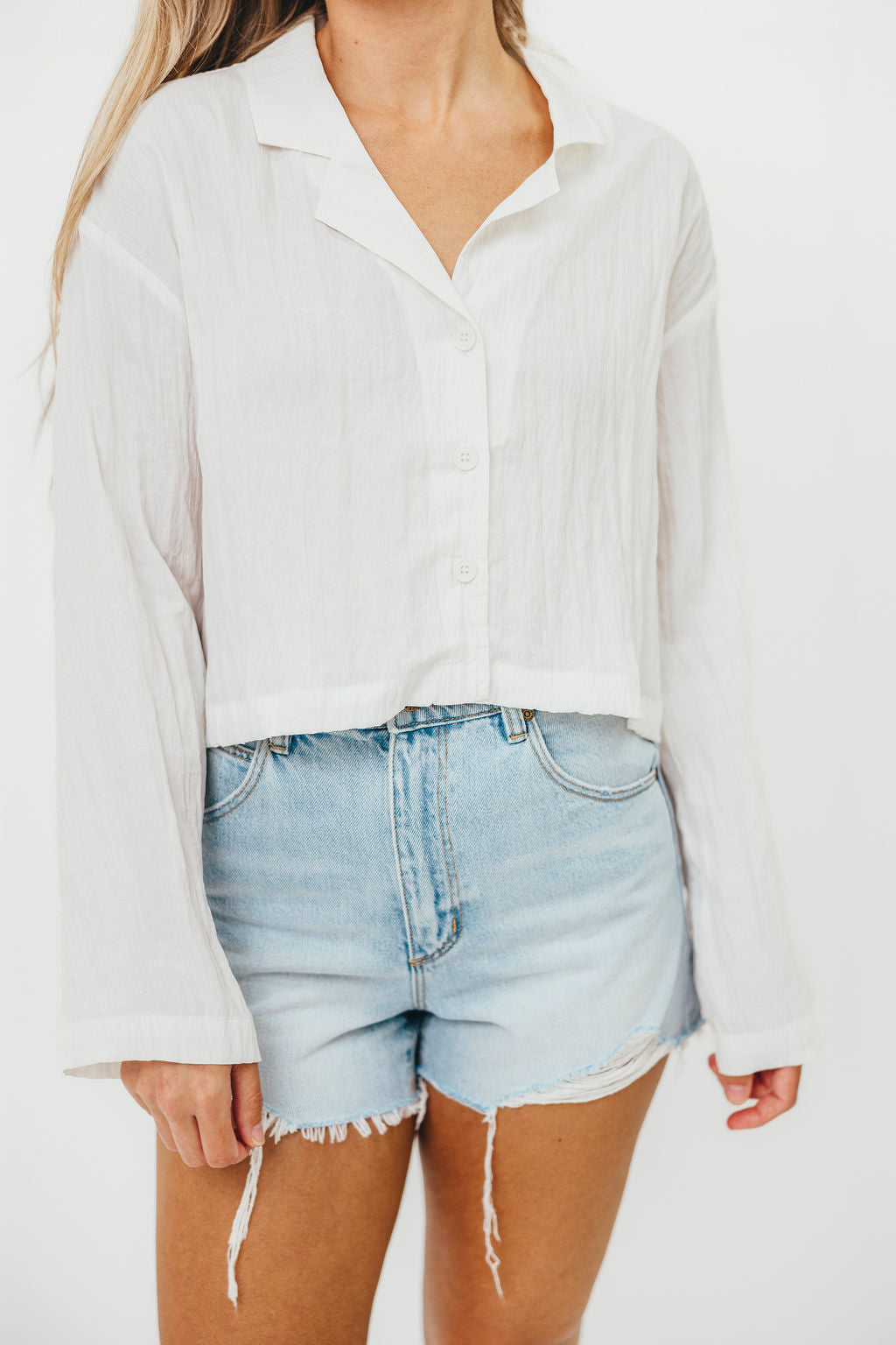 GARMENT DETAILS: Lightweight button-up shirt with collared V-neckline, front button placket, and flared long sleeves.