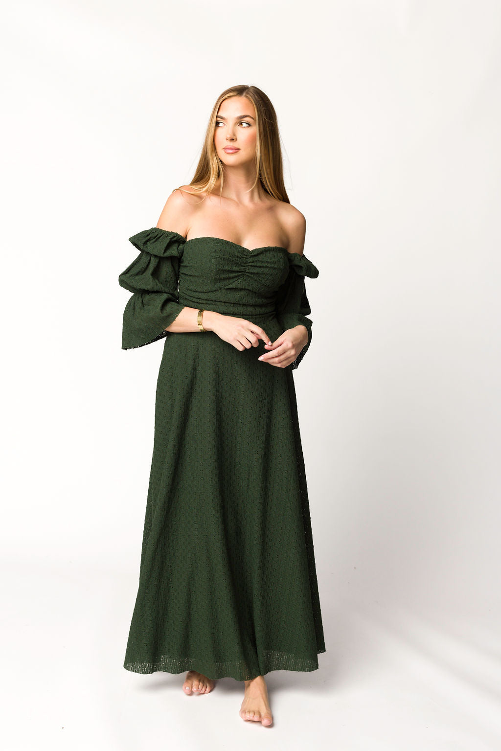 Corrine Tiered Sleeve Maxi Dress with Pockets in Hunter Green