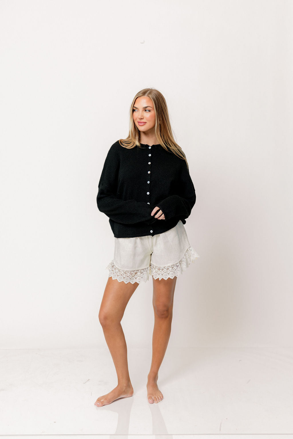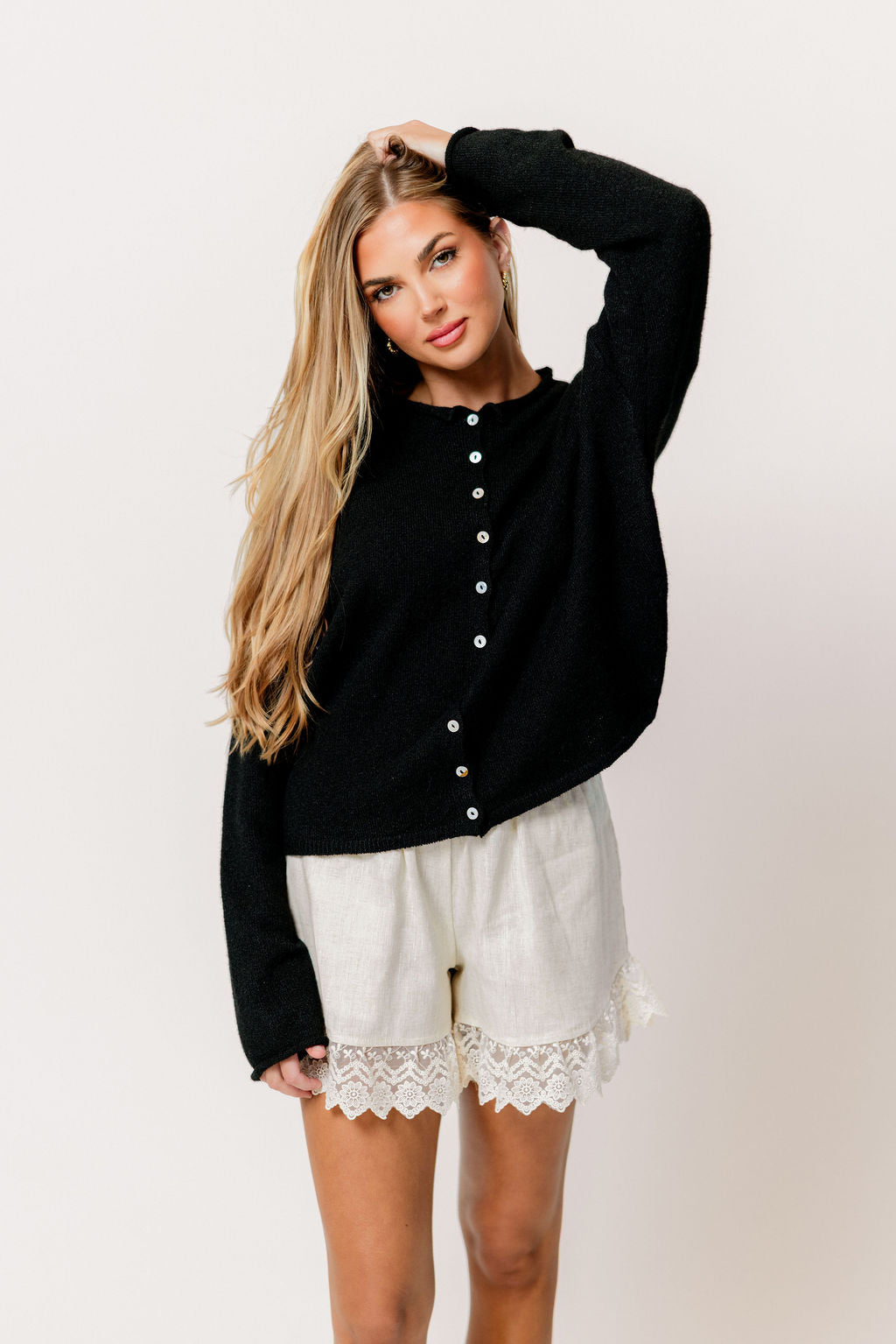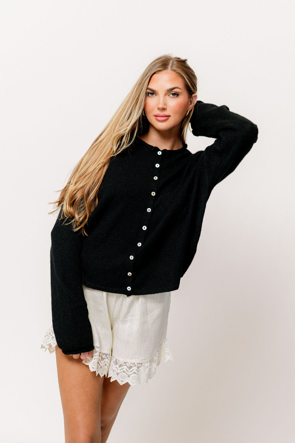 GARMENT DETAILS: Soft and feminine cardigan with long sleeves and rolled hem. Features dainty button front closure.