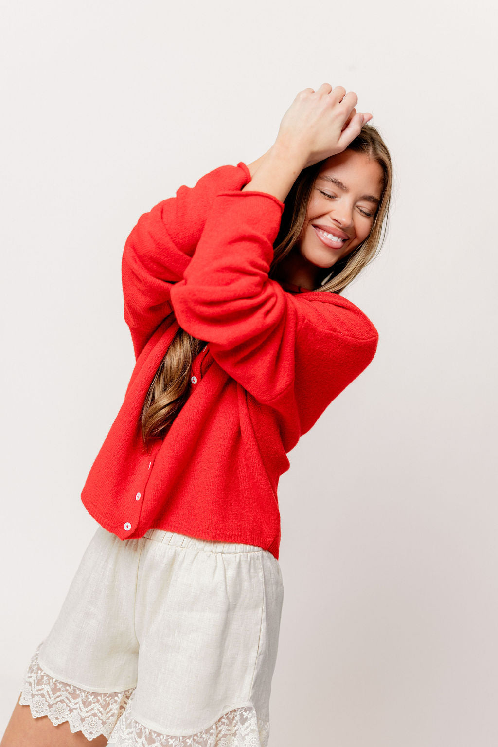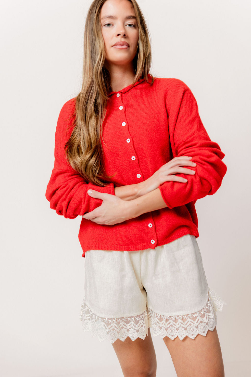 GARMENT DETAILS: Soft and feminine cardigan with long sleeves and rolled hem. Features dainty button front closure.