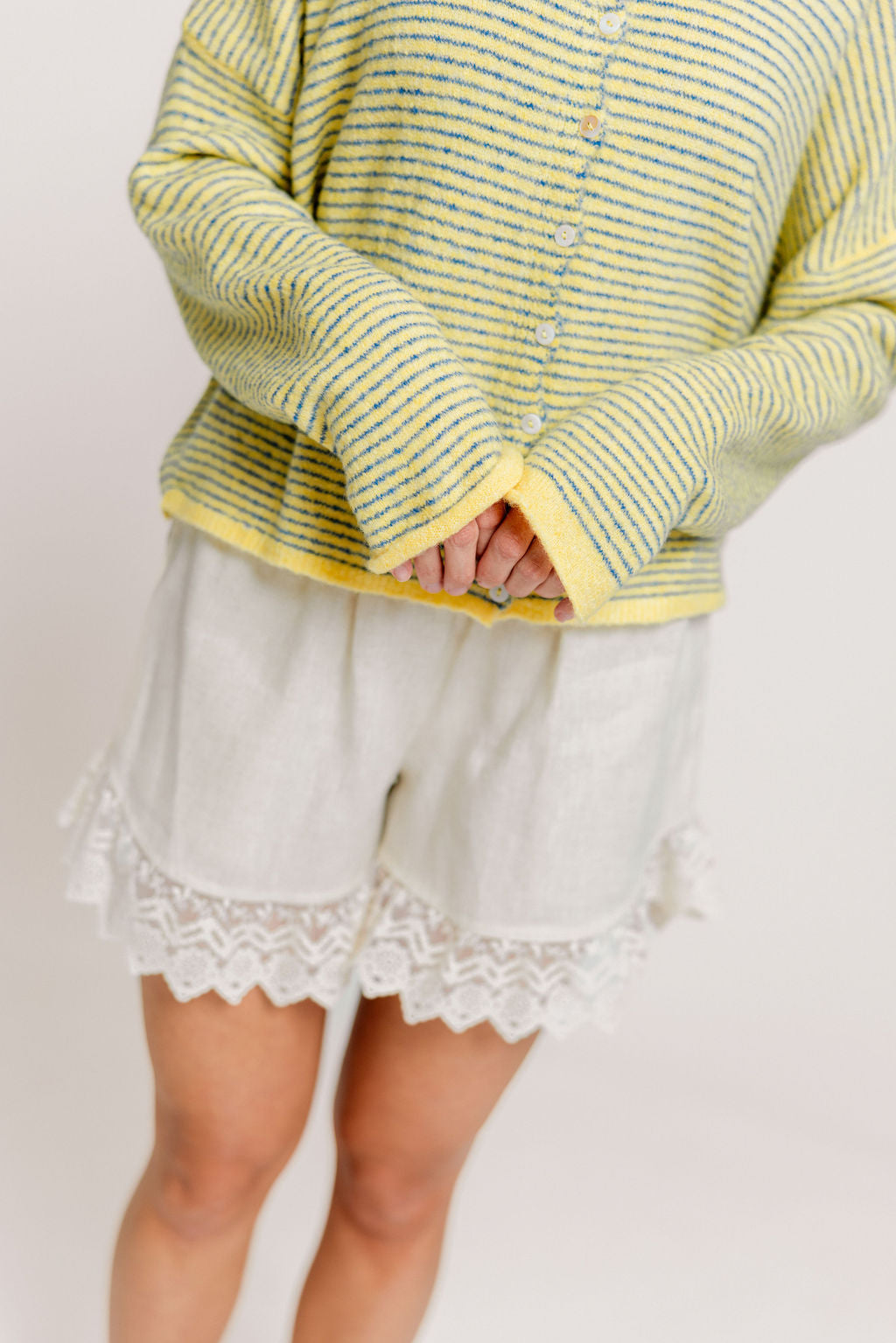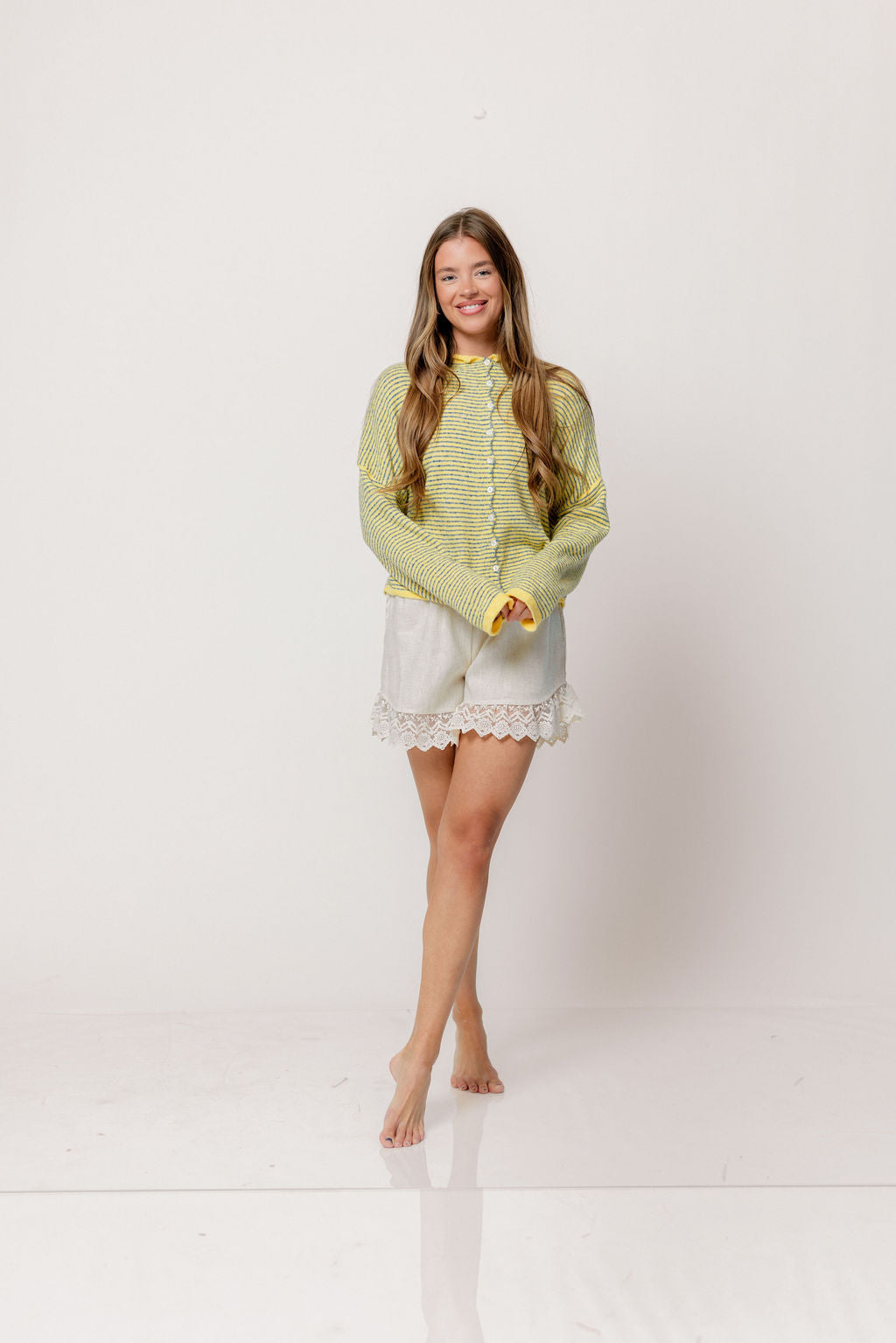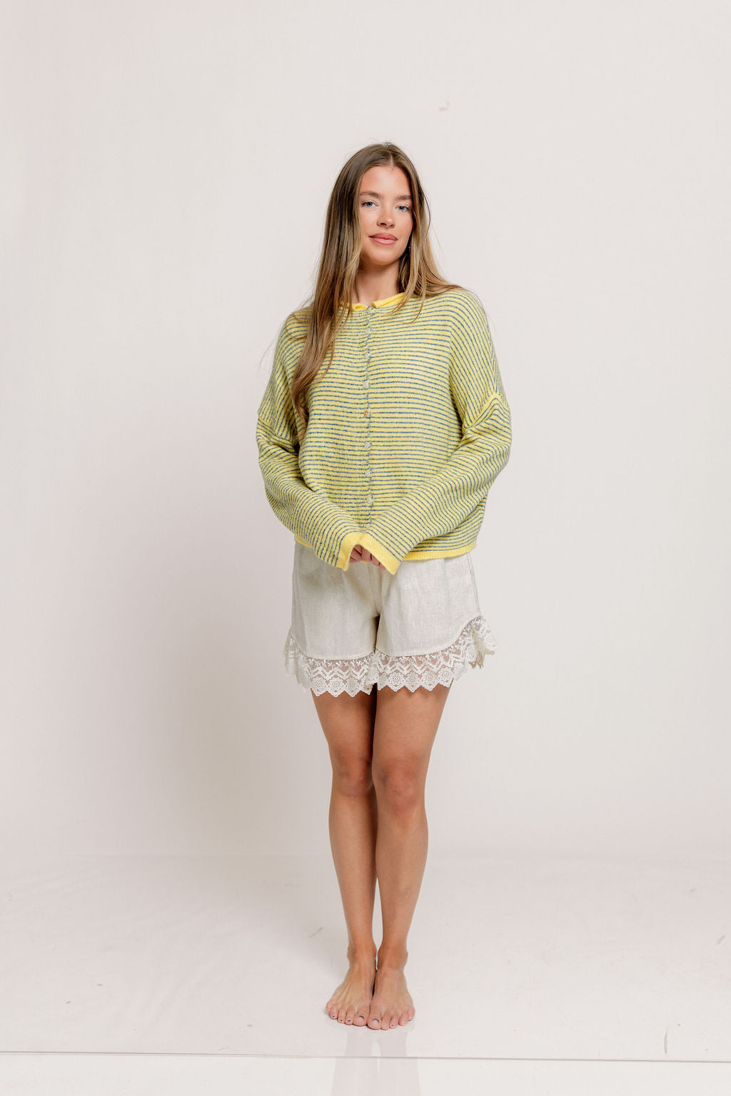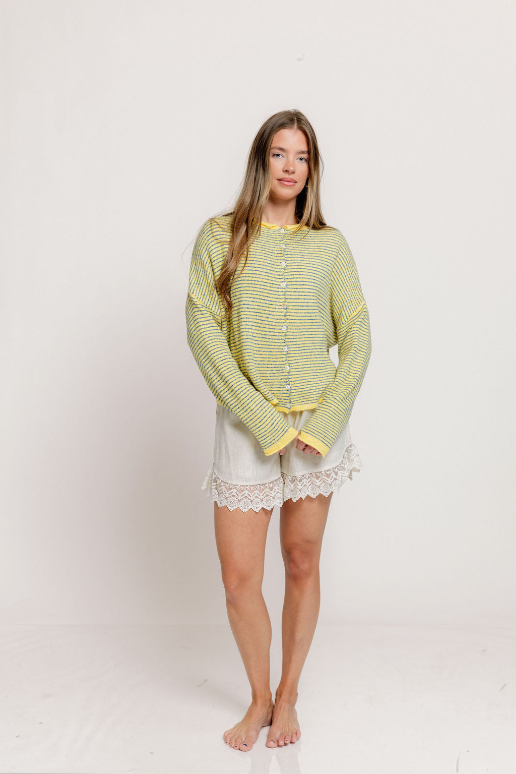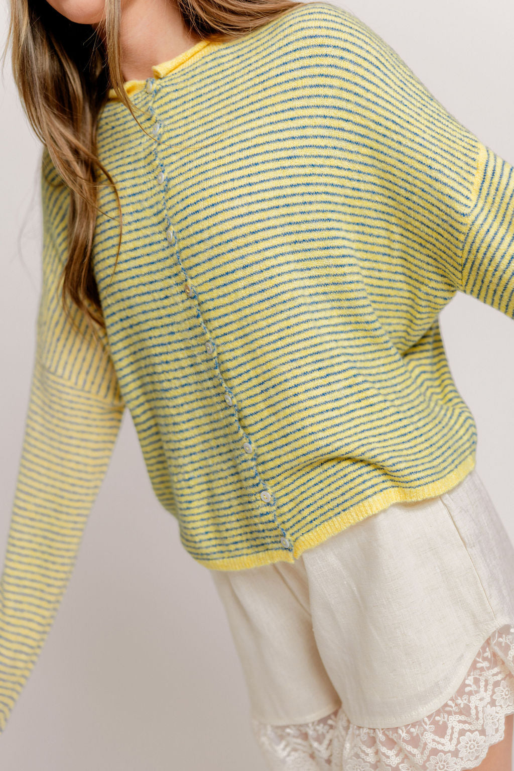 Whether you're wearing this adorable striped cardigan solo, layering over a tank or camisole, or styling it tied over your shoulders, the Piper will wear beautifully season after season. We love the dainty pinstripe and rolled edge detail that gives this cardigan a sweet and casual vibe.
