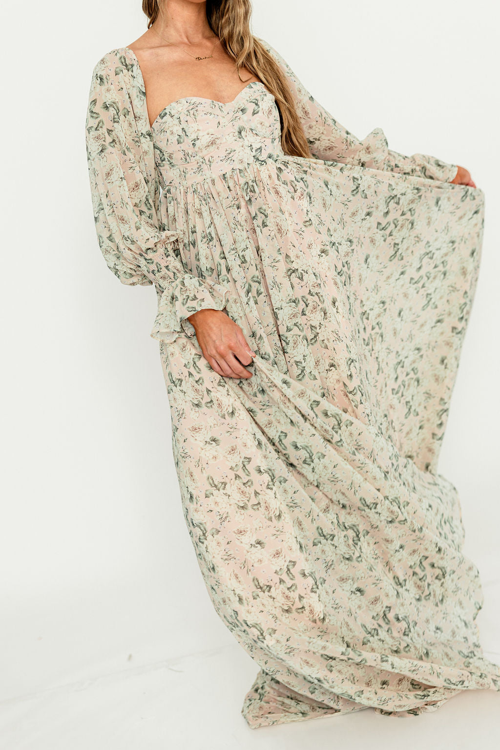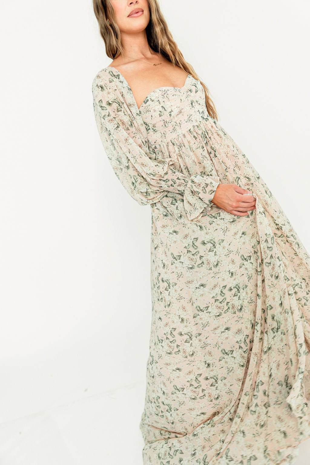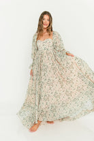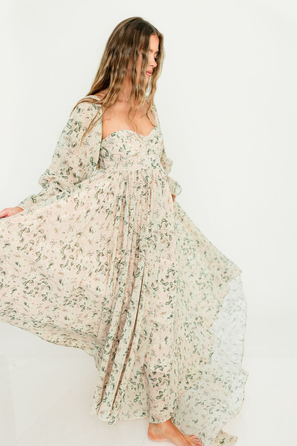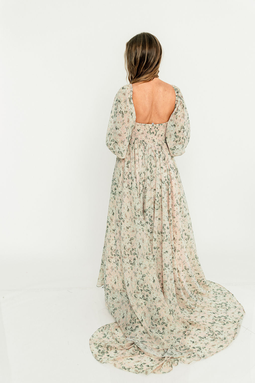 GARMENT DETAILS: Premium floral maxi dress in a lightweight, shirred chiffon. Features a soft bustier-style bodice (no boning), sweetheart neckline, smocked back panel, and sheer long sleeves with elastic cuffs and ruffles. Sleeves can be worn on or off the shoulder. Finished with a sweeping maxi-length skirt and dramatic train. Lined.