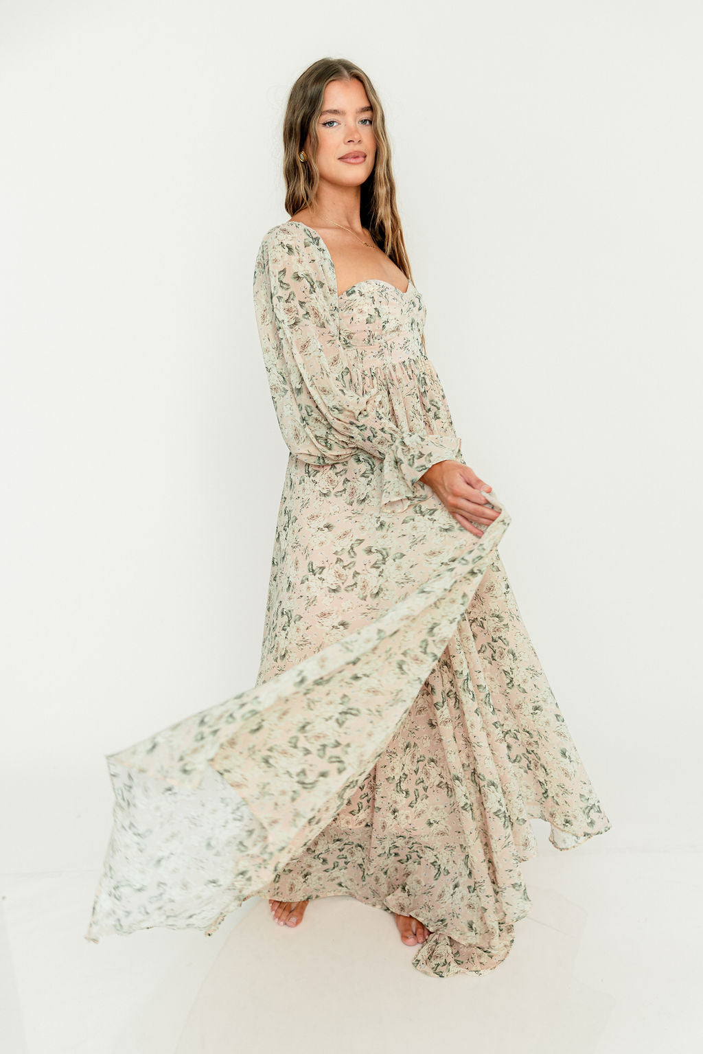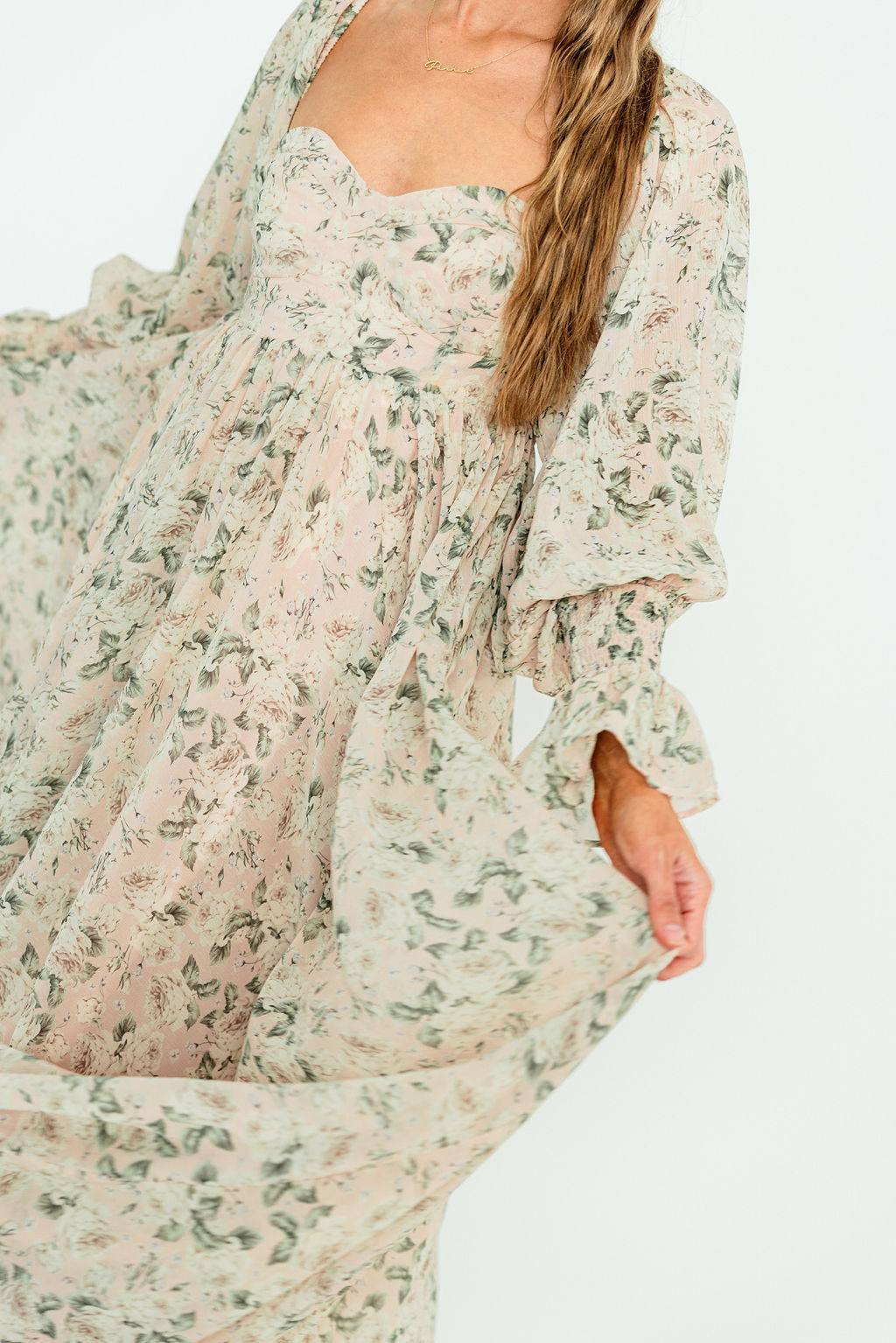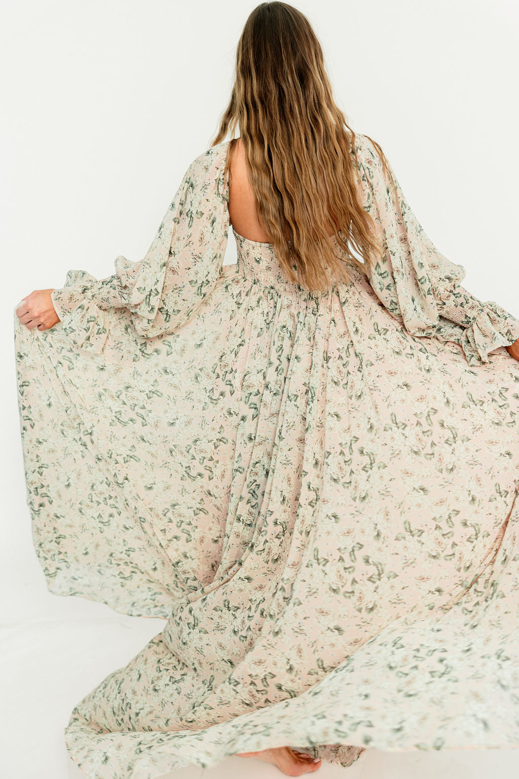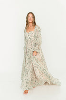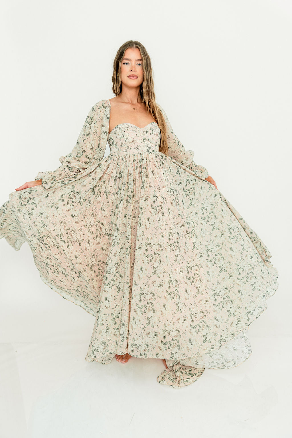 GARMENT DETAILS: Premium floral maxi dress in a lightweight, shirred chiffon. Features a soft bustier-style bodice (no boning), sweetheart neckline, smocked back panel, and sheer long sleeves with elastic cuffs and ruffles. Sleeves can be worn on or off the shoulder. Finished with a sweeping maxi-length skirt and dramatic train. Lined.