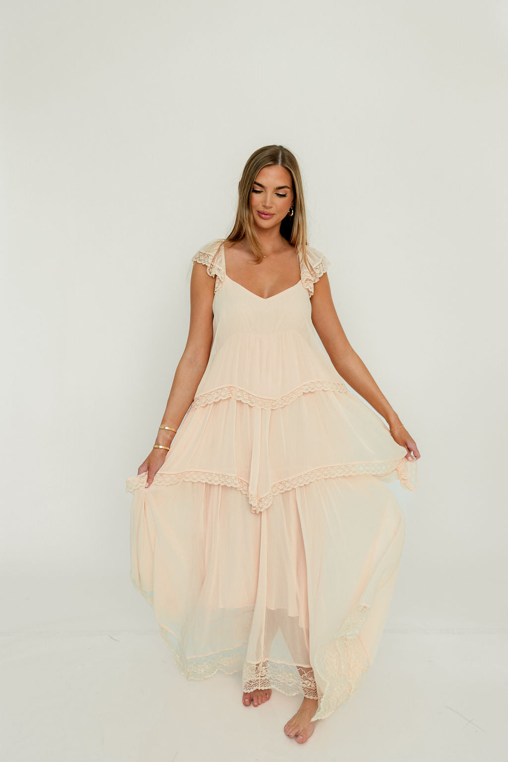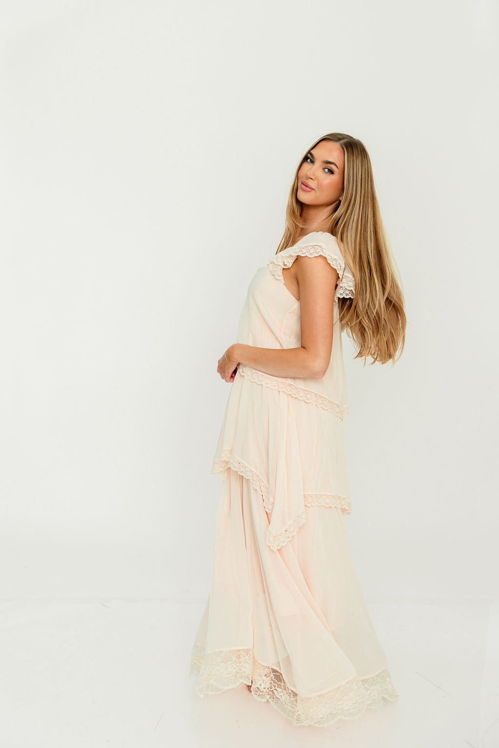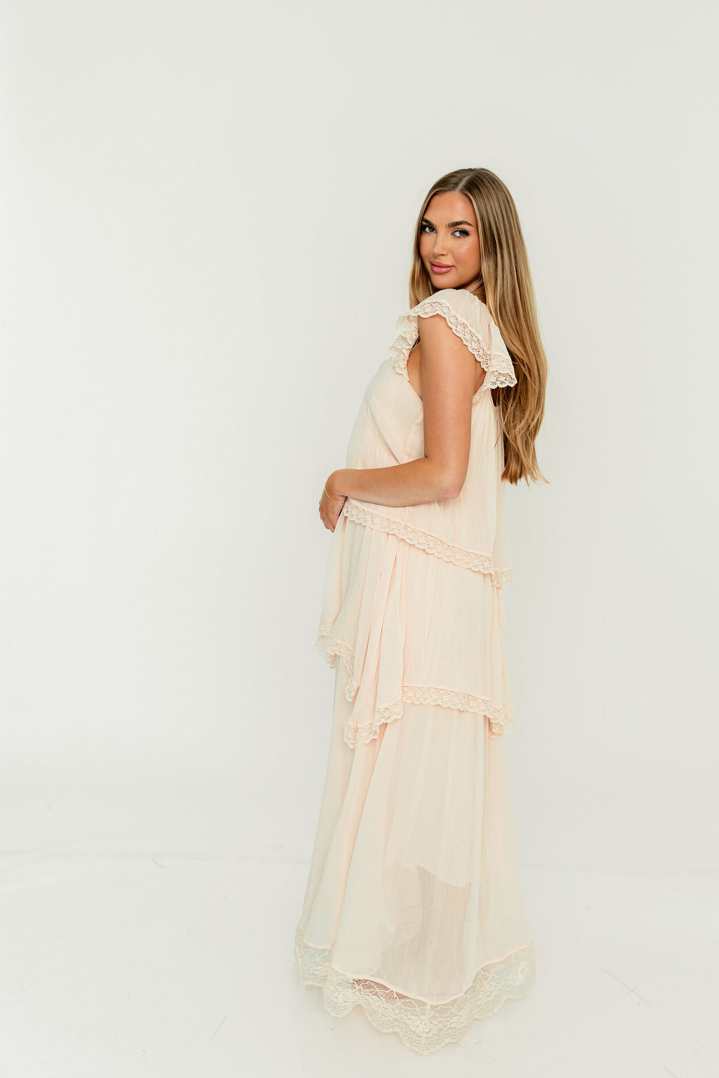Meet the romantic new Nicola Maxi Dress, a darling addition to the Dress Shoppe (and to your closet!). This lightweight gown is stunning in its simplicity, with a waterfall tiered design and lace trim that makes every movement graceful. It's charming, feminine, and entirely picturesque.