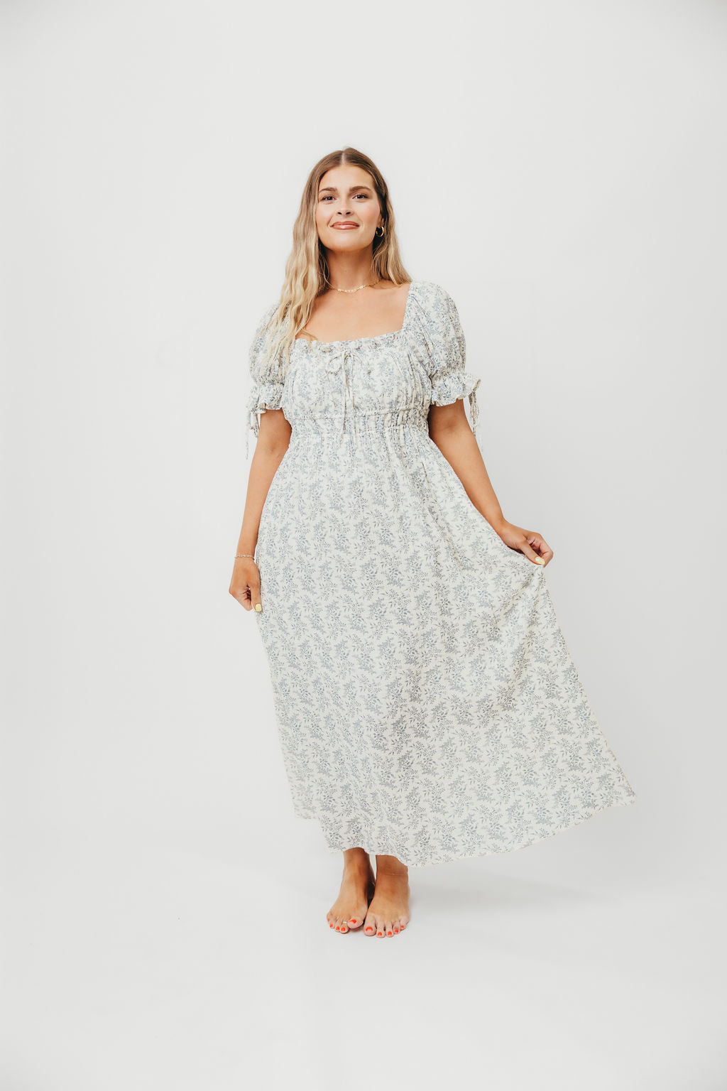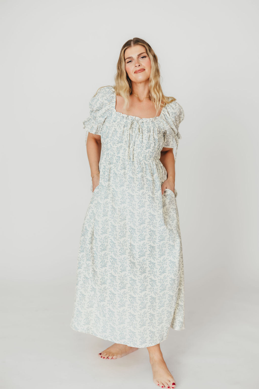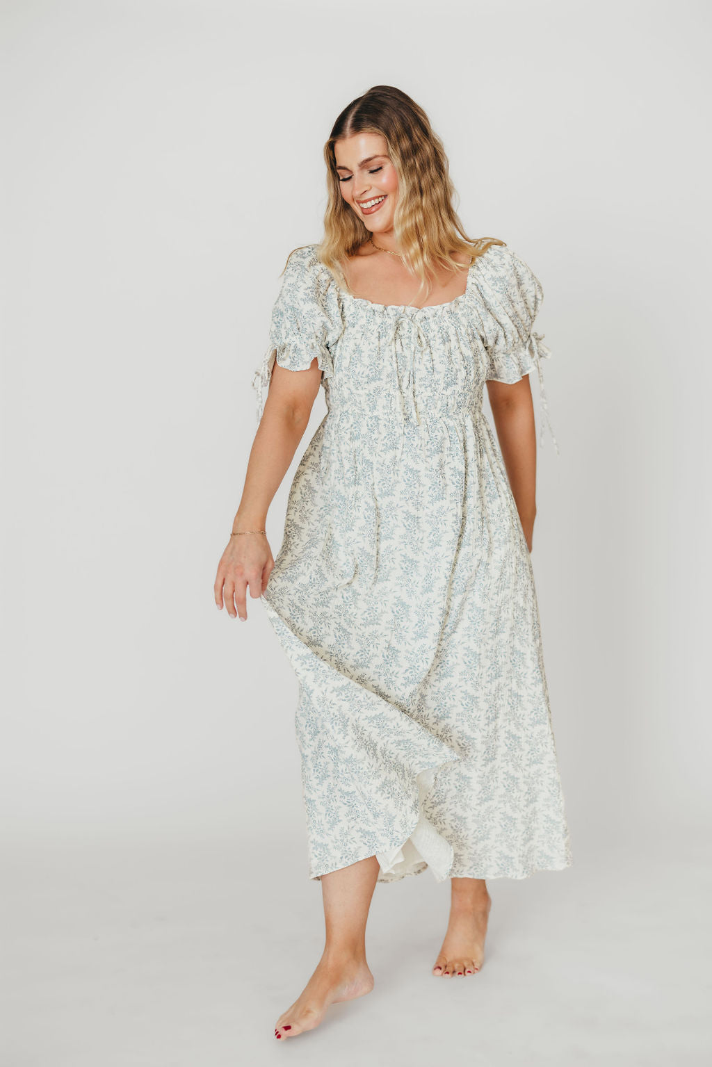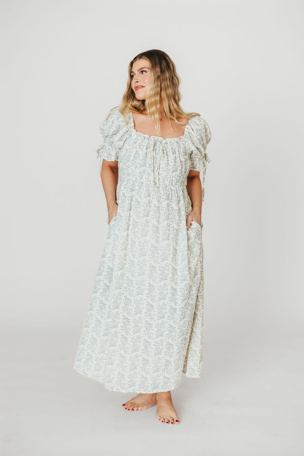 GARMENT DETAILS: Ultra-soft and lightweight 100% cotton maxi dress. Features a square neckline with dainty puffed sleeves, smocked waistband, and tie accents throughout. Lined.