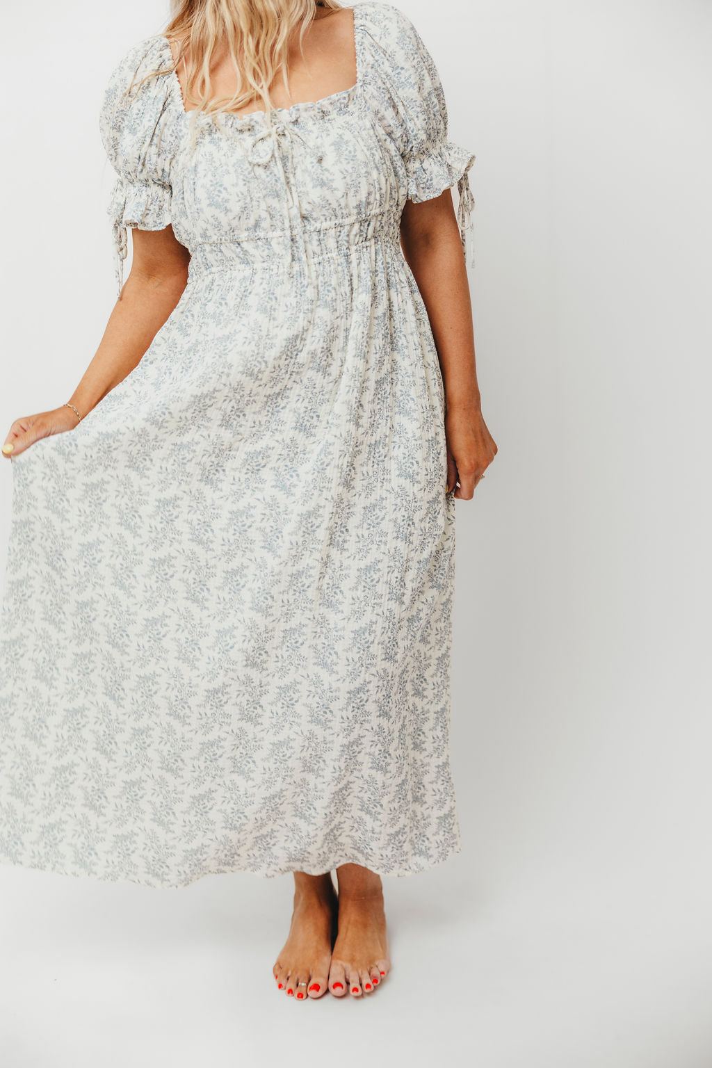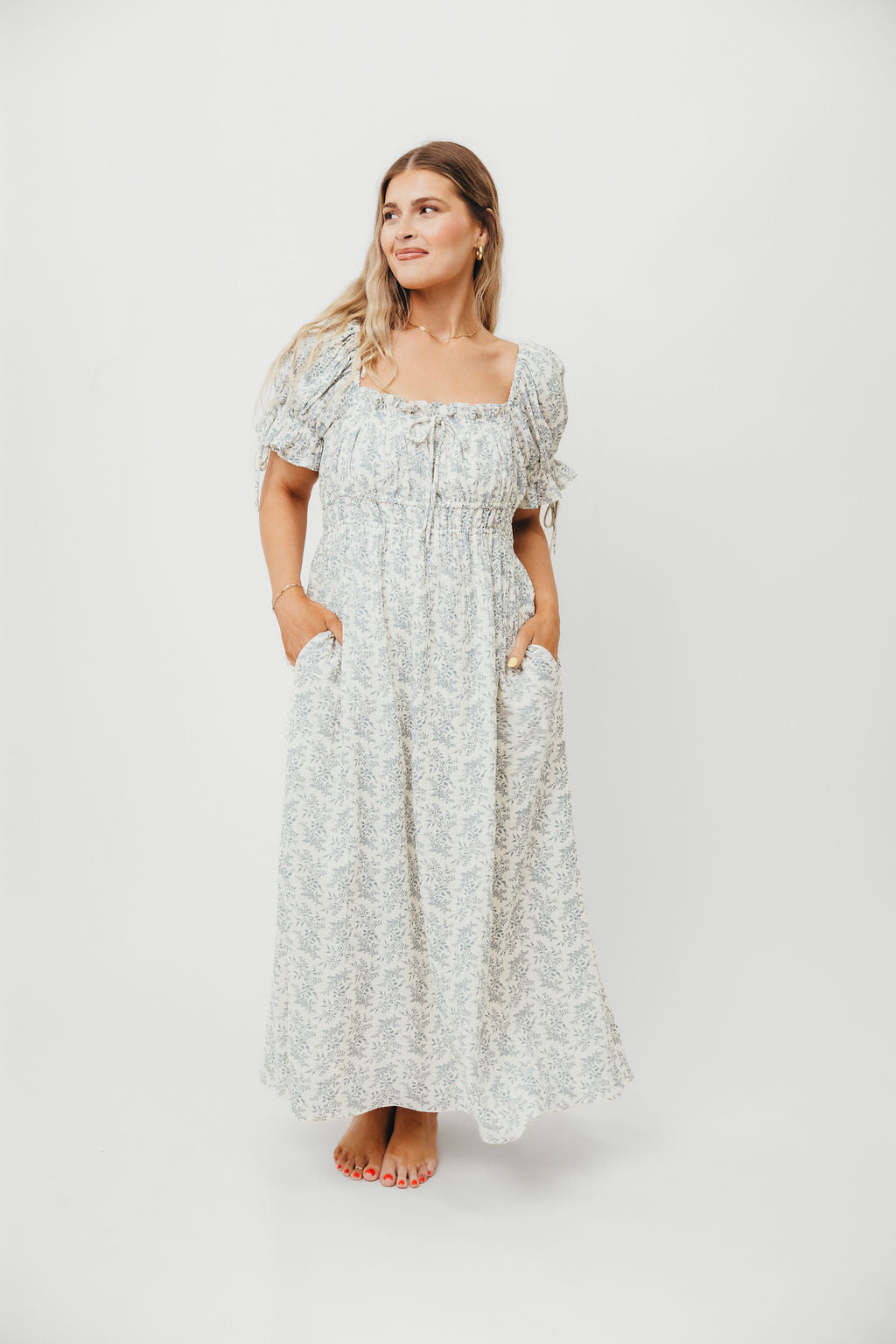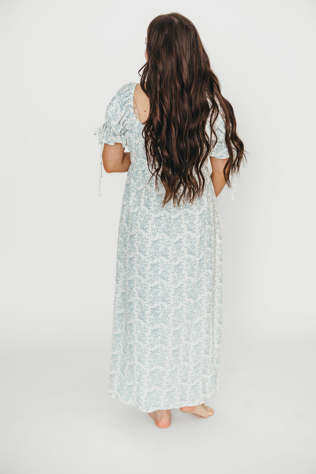 GARMENT DETAILS: Ultra-soft and lightweight 100% cotton maxi dress. Features a square neckline with dainty puffed sleeves, smocked waistband, and tie accents throughout. Lined.