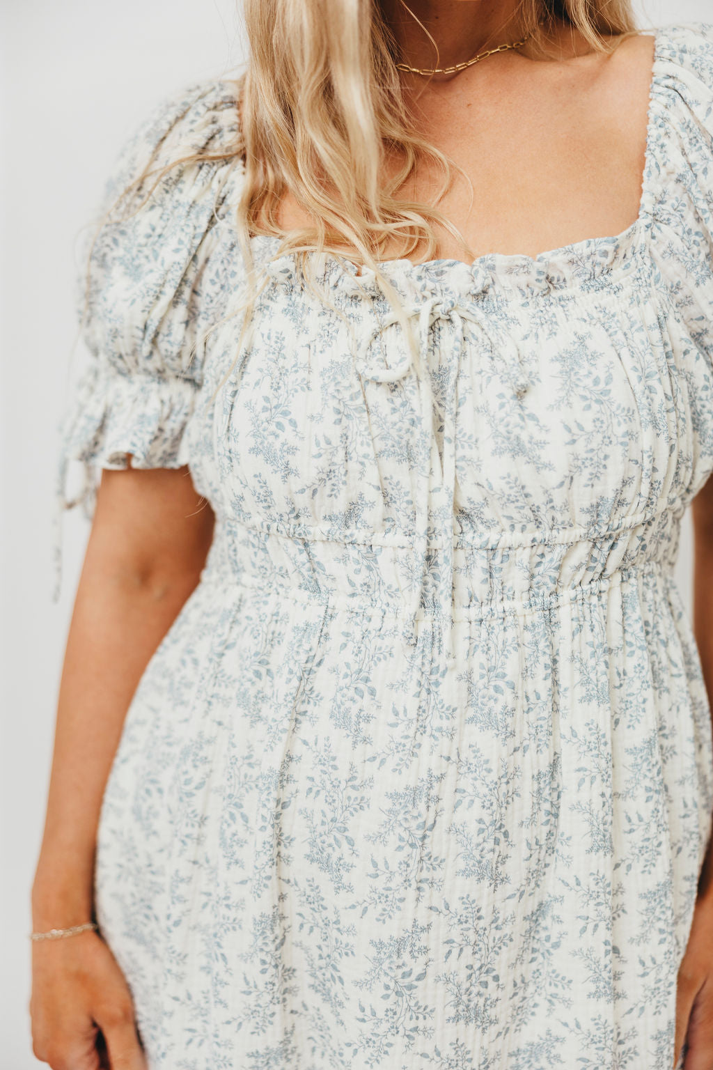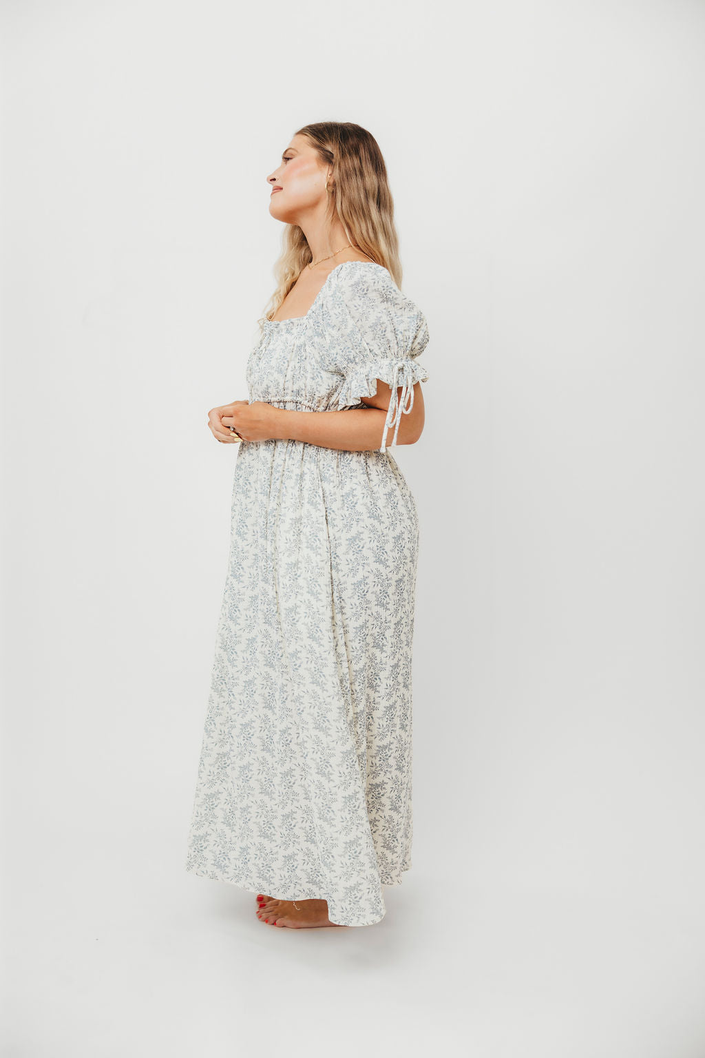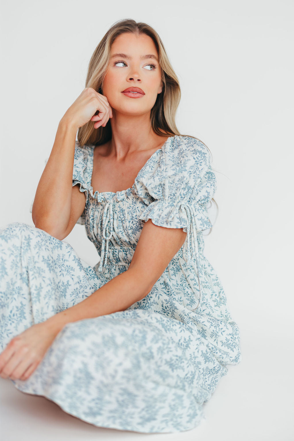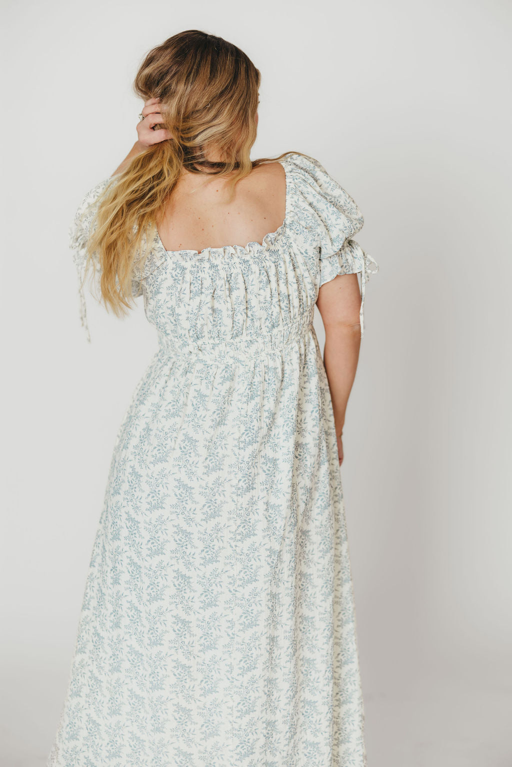 GARMENT DETAILS: Ultra-soft and lightweight 100% cotton maxi dress. Features a square neckline with dainty puffed sleeves, smocked waistband, and tie accents throughout. Lined.