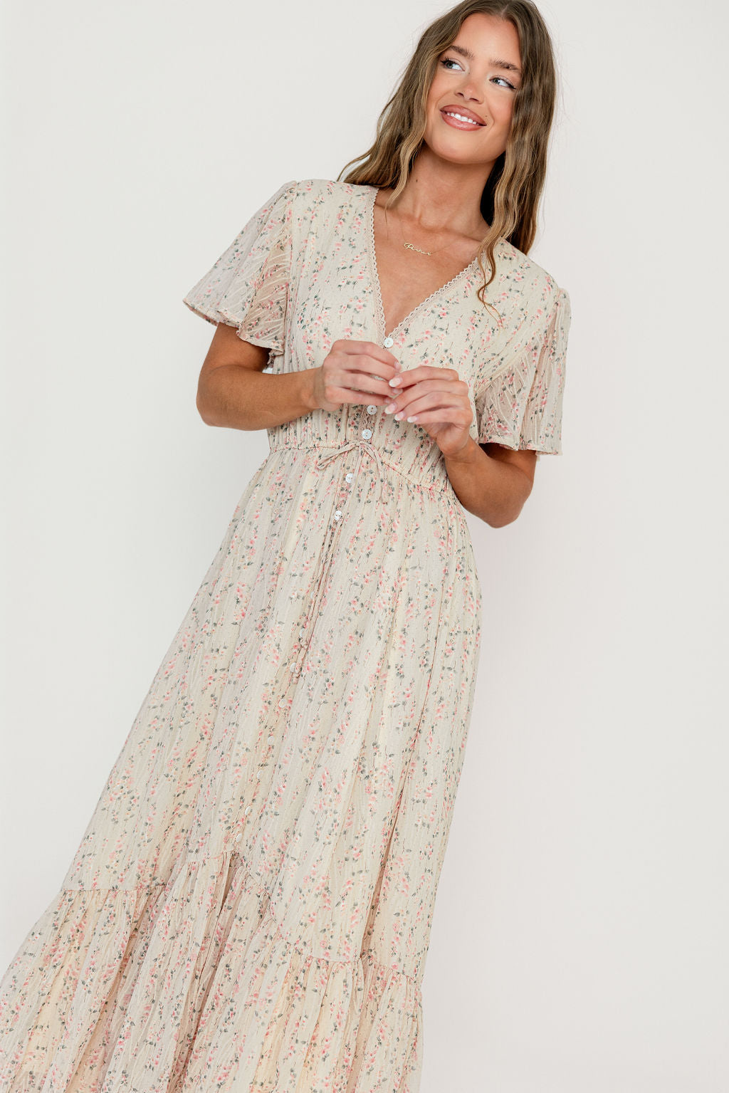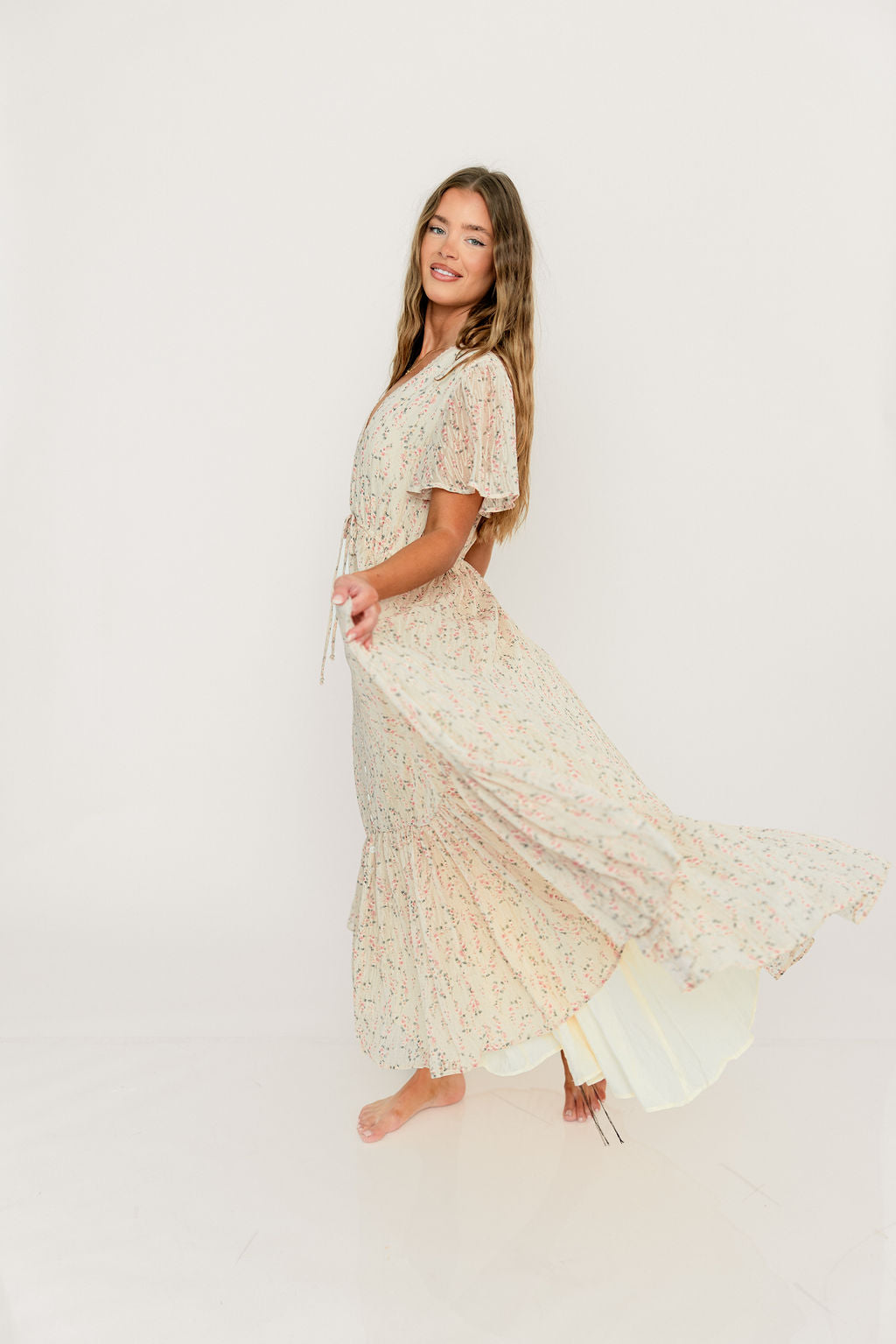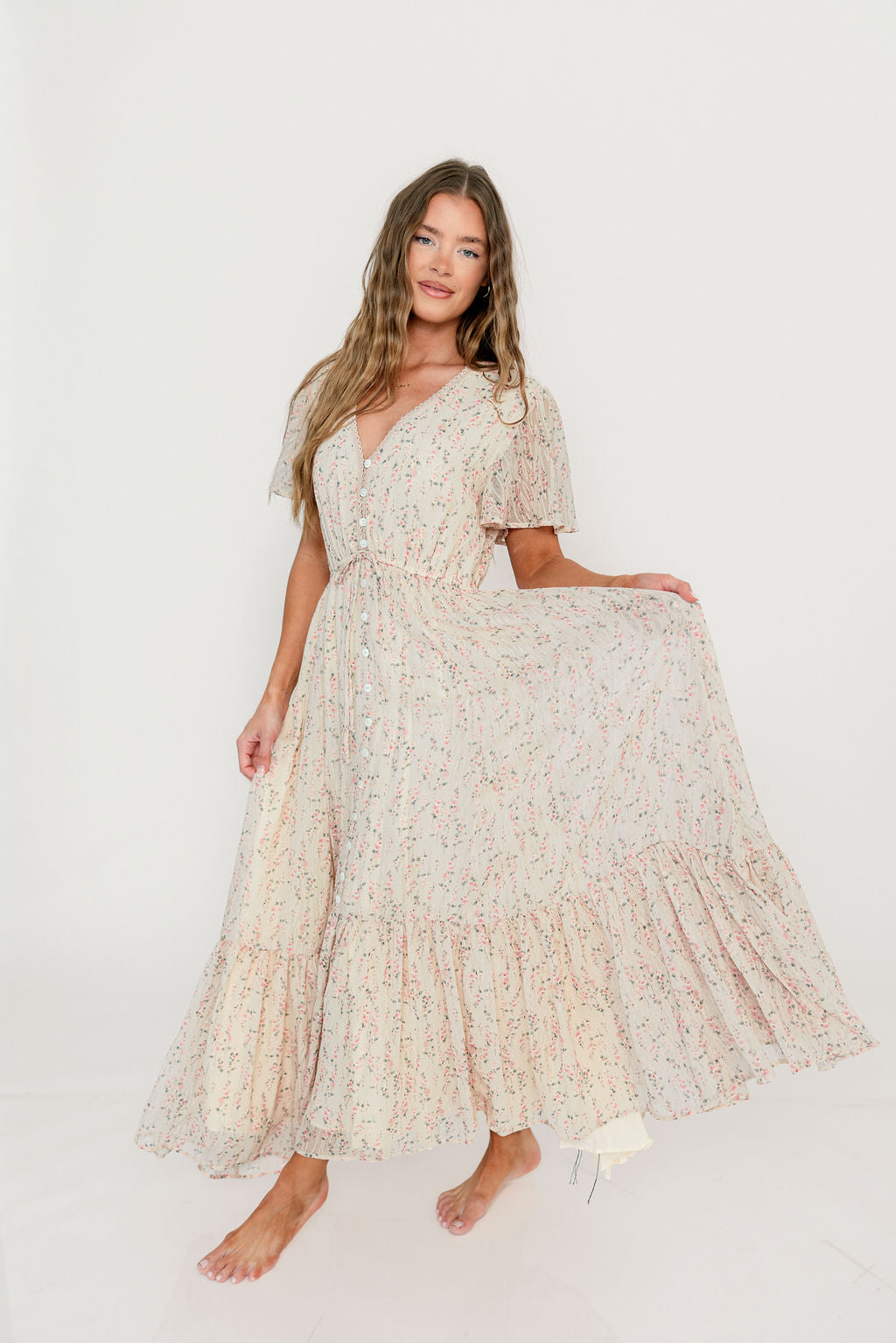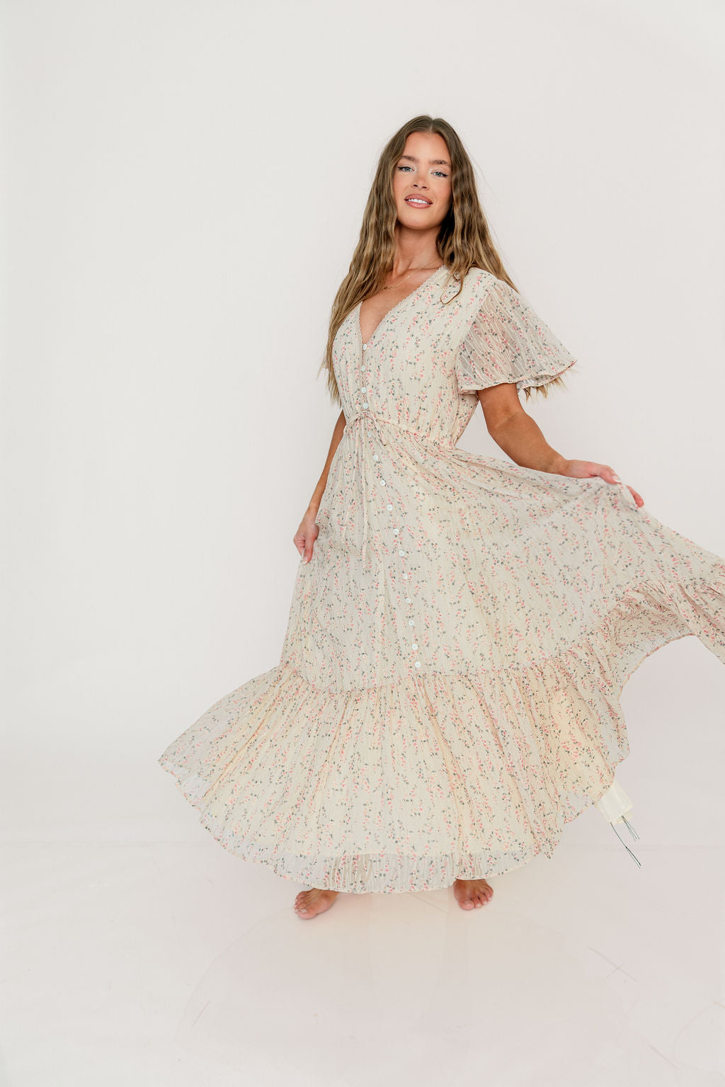 GARMENT DETAILS: Lightweight maxi dress in a charming ditsy floral print. Features a modest V-neckline, functional front button placket, and sheer flutter sleeves. Finished with a cinched waist and tie detail, with an extra-wide, flowy skirt with ruffled hem. Lined.