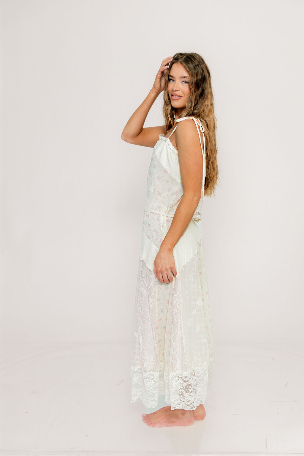 GARMENT DETAILS: Elegant floral print camisole top with square neckline, adjustable self-tie shoulder straps, and delicate lace details.