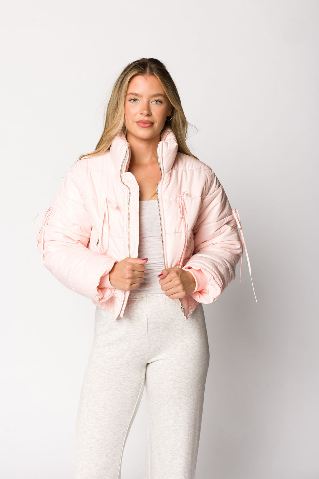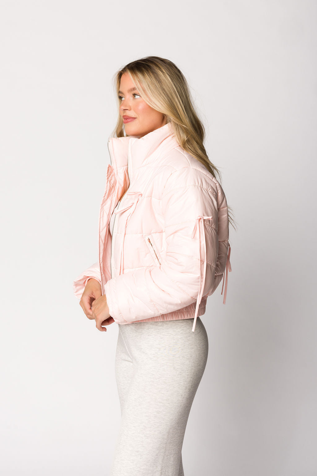 She's cute, cozy, and ready for tailgate season! The Elise Puffer Jacket offers the perfect combination of versatility (hello, front zipper and turtleneck) combined with sweet feminine details, like dainty bow accents and a ballet pink hue. You'll love styling this jacket with your favorite outfits!