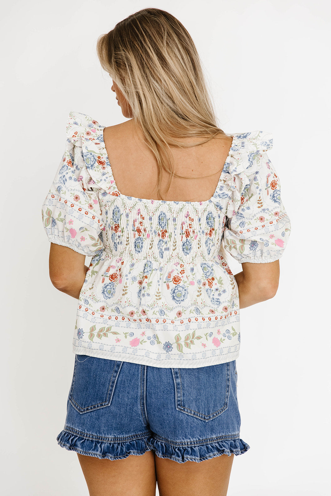 GARMENT DETAILS: Cotton blouse with delicate floral print, sweetheart neckline with tie, and puffed short sleeves. Features ruffled shoulders, a smocked back panel, and full lining.